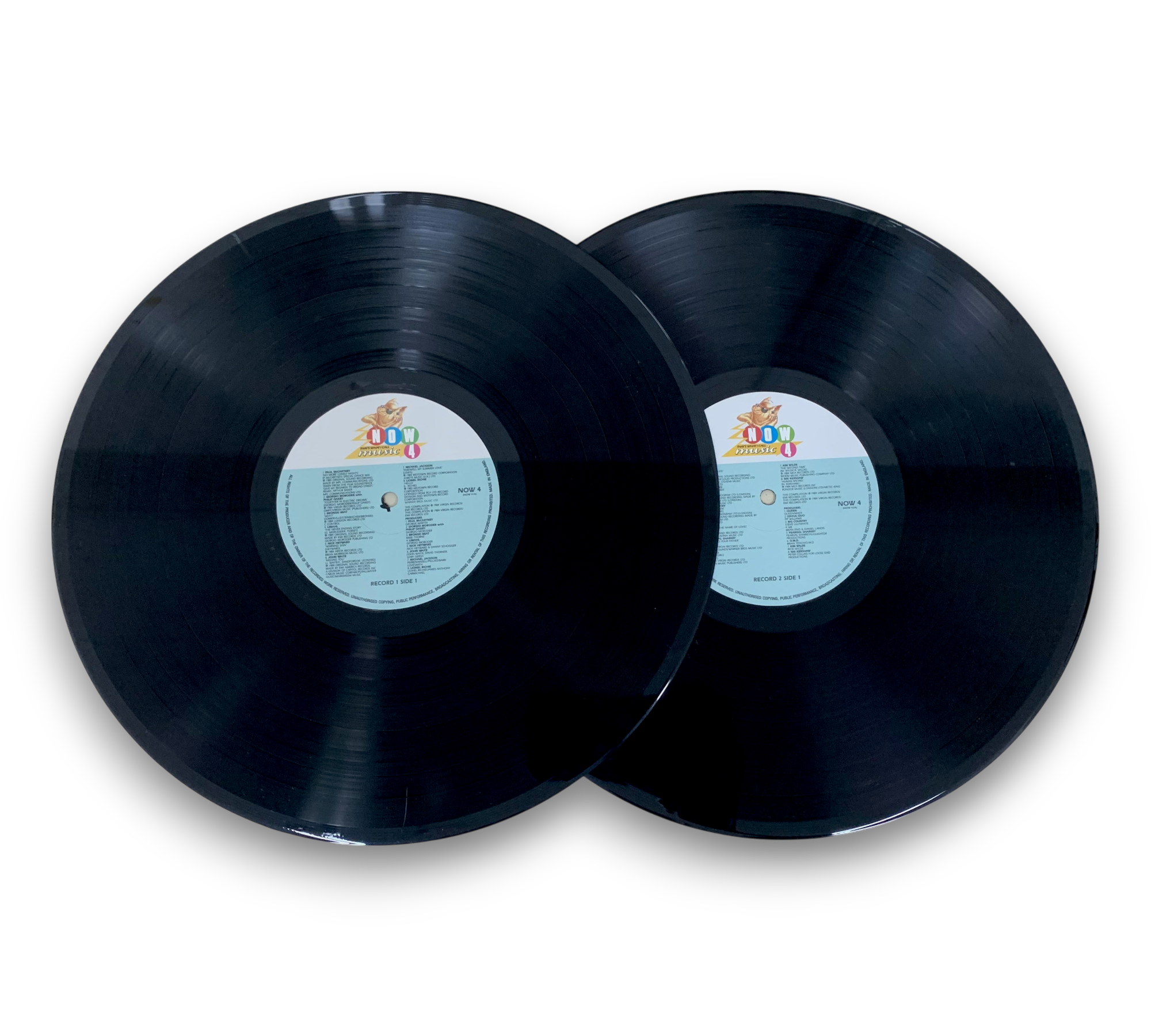 This compilation, titled "NOW That's What I Call Music 4," was released in 1984 by Virgin Records/EMI Records Ltd. It features a gatefold sleeve and includes a collection of chart-topping hits from various original artists. The records are made in England, and the runouts indicate a variant with "FM" etched just after the "D." For further details regarding the packaging and inserts, please refer to the accompanying photos.