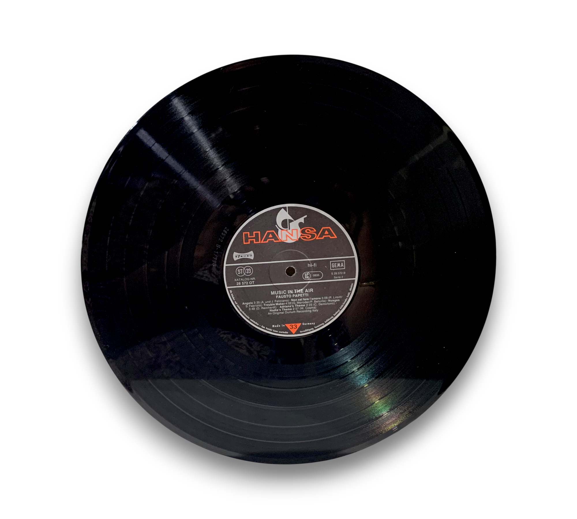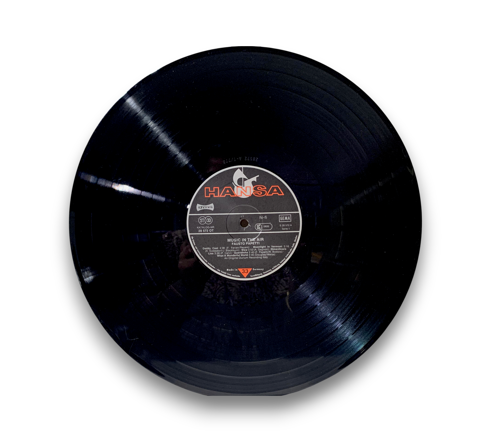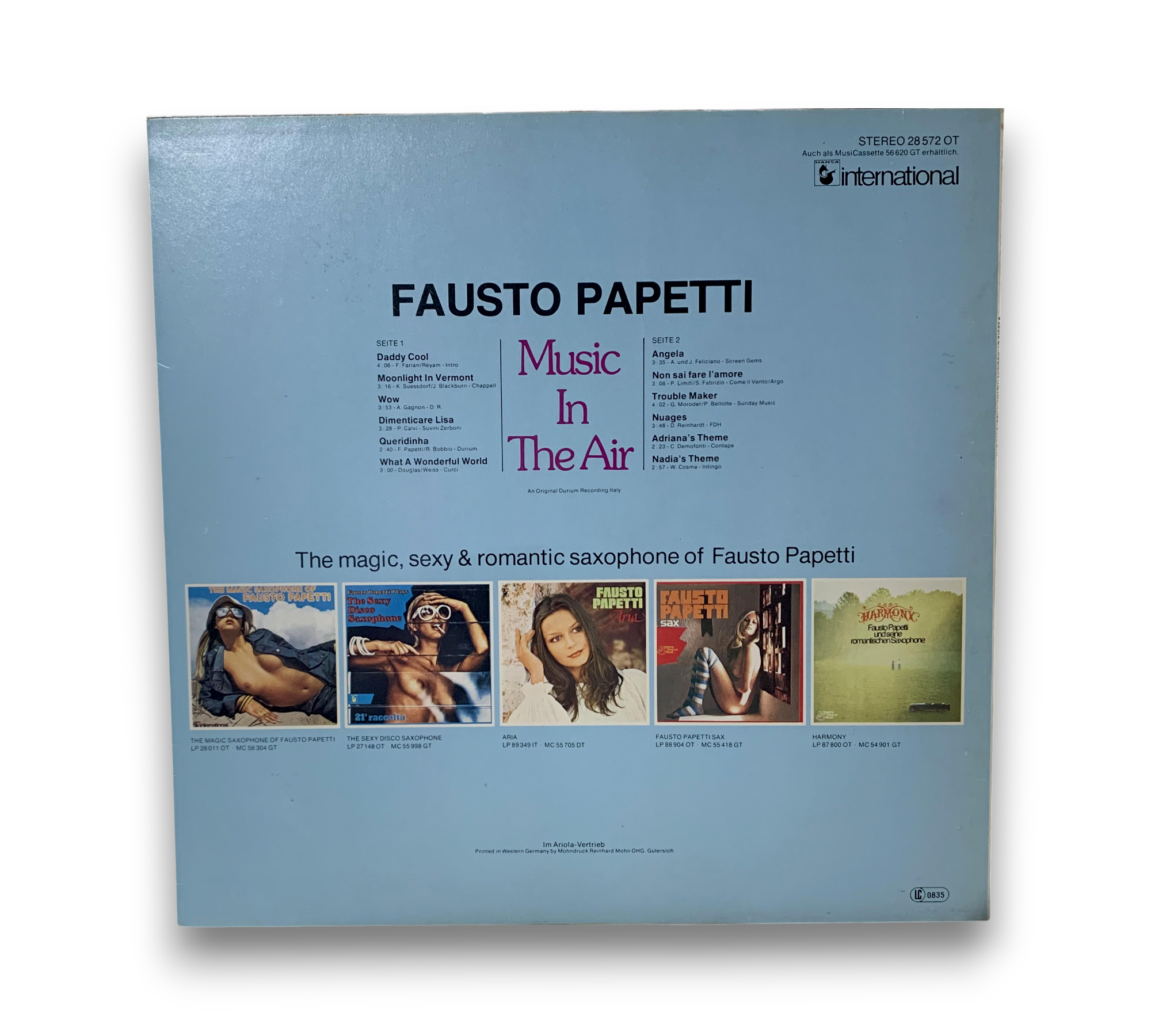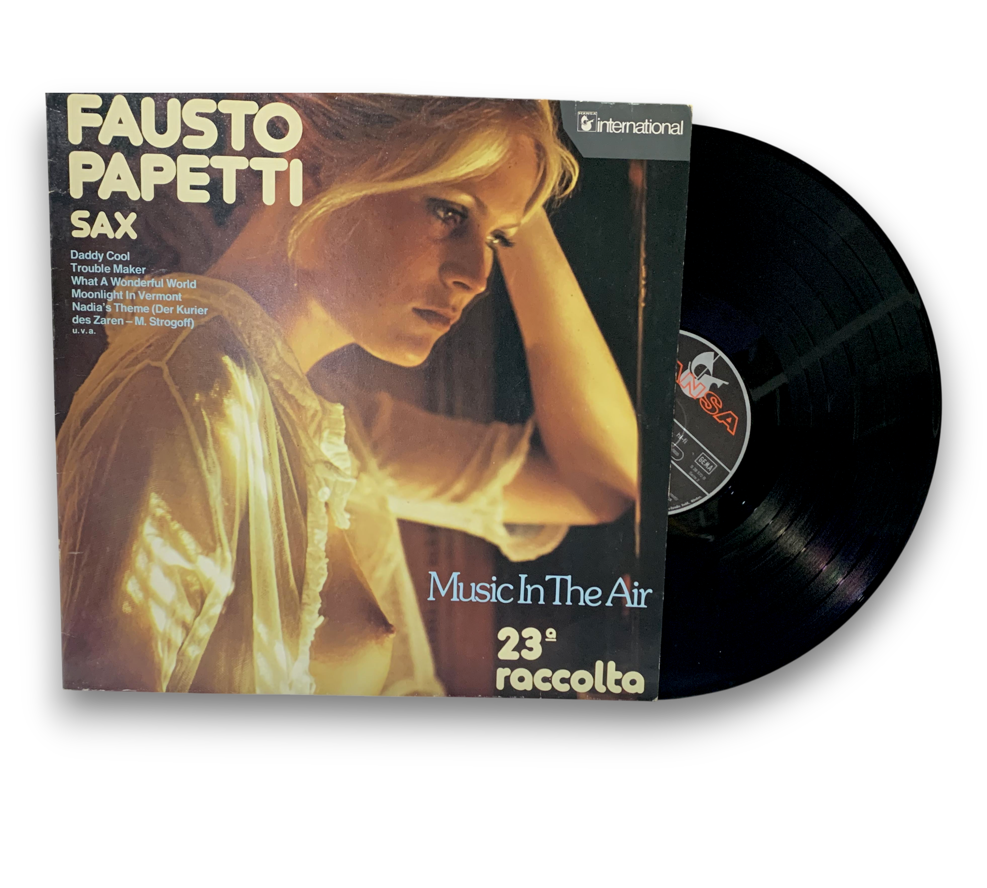 Fausto Papetti's "Music In The Air" features a collection of captivating saxophone melodies, including tracks like "Daddy Cool," "What a Wonderful World," and "Nadia's Theme." This original Durium recording from Italy showcases the romantic and enchanting style that Papetti is known for. The album is presented in a visually striking cover, enhancing the overall appeal for collectors and fans alike. For further details regarding the condition and specifics of the packaging, please refer to the accompanying photos.