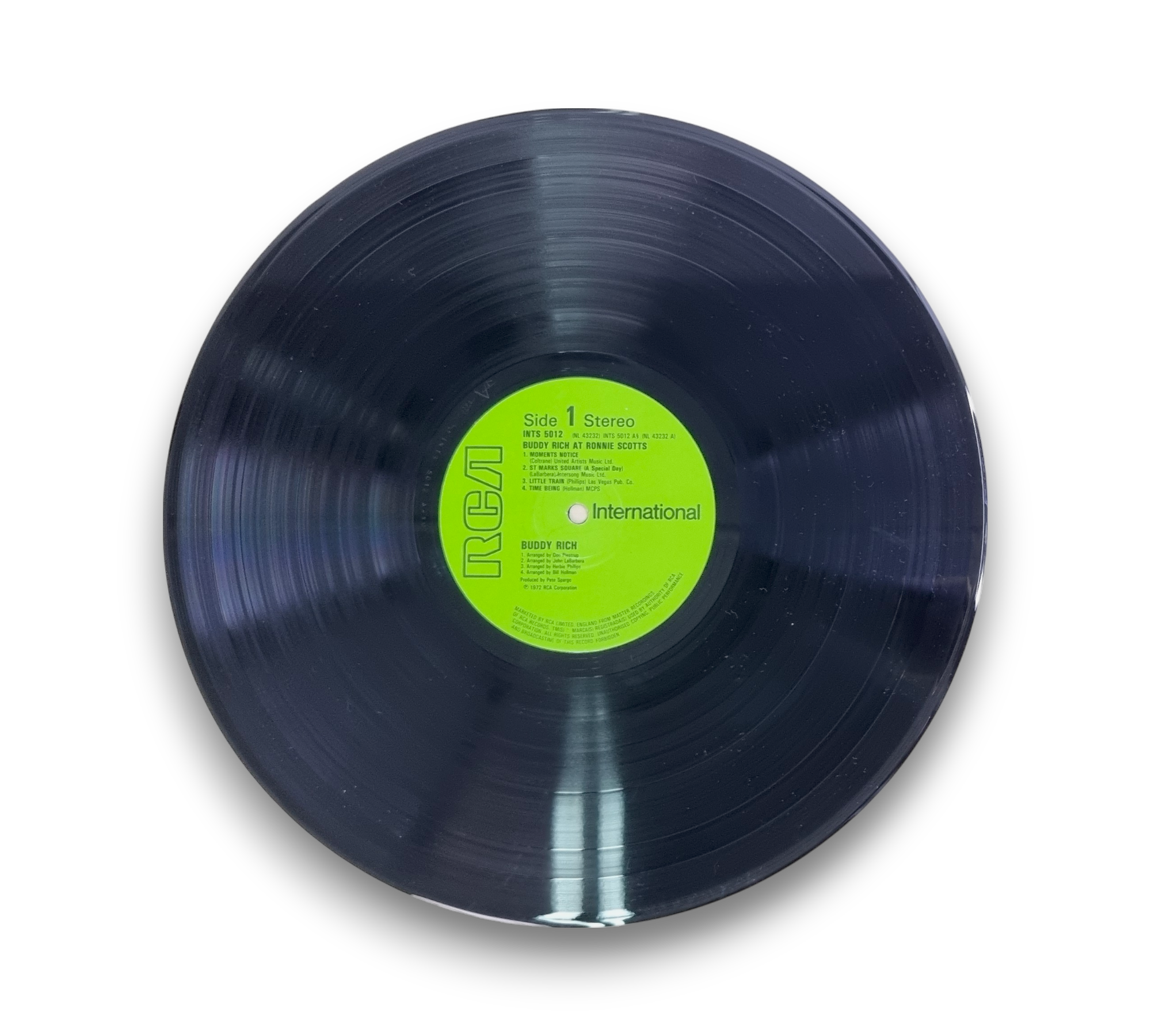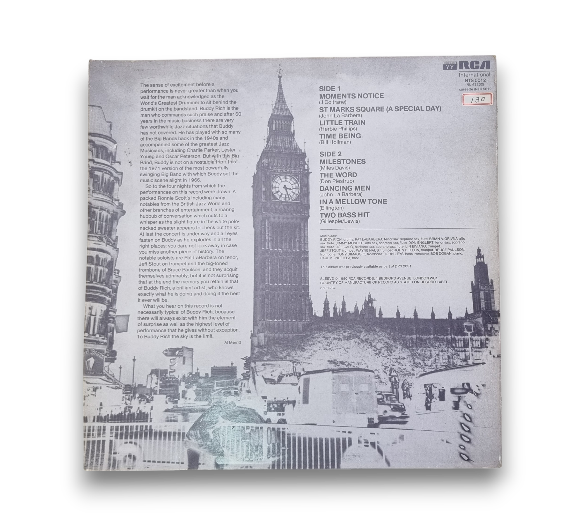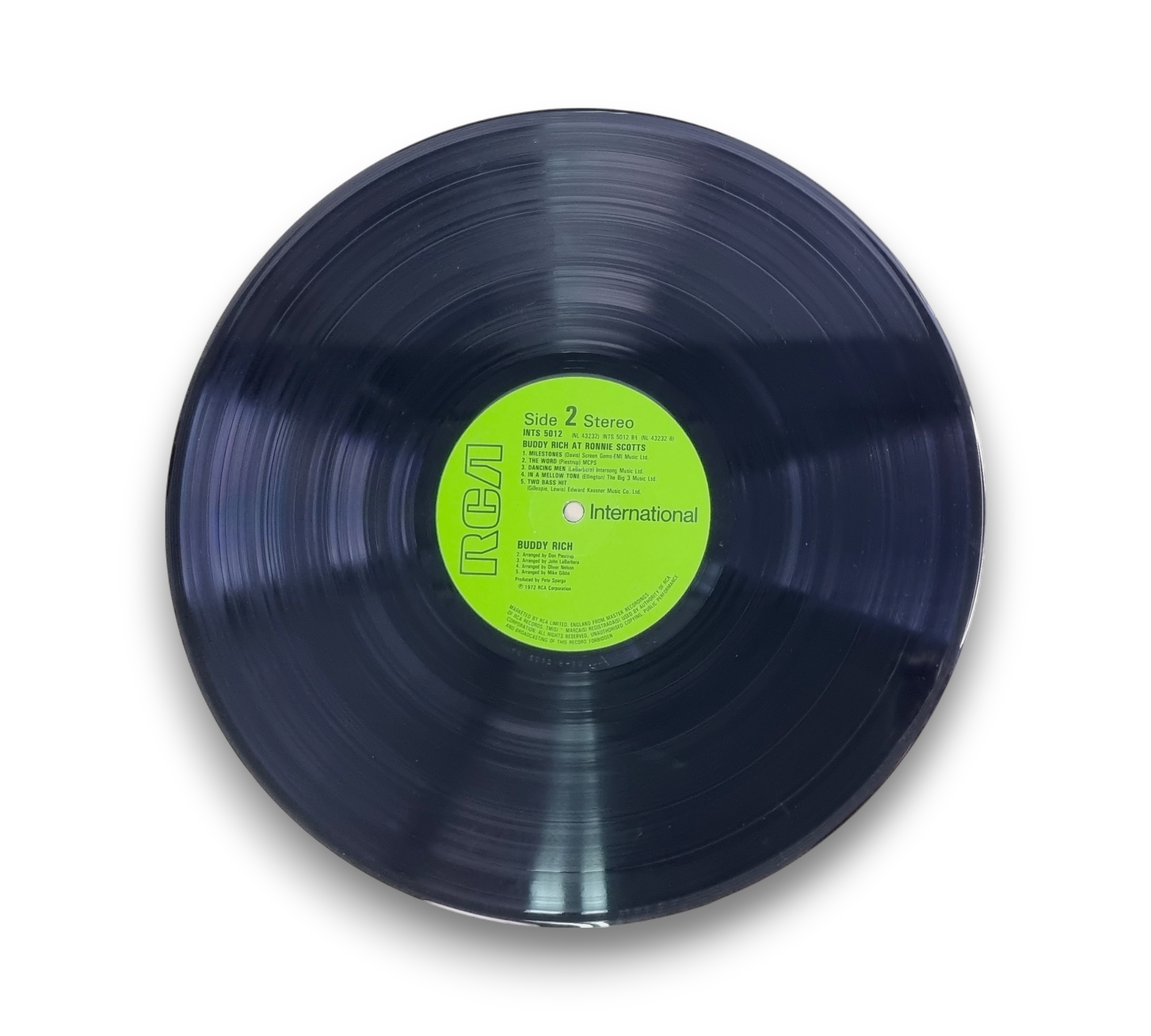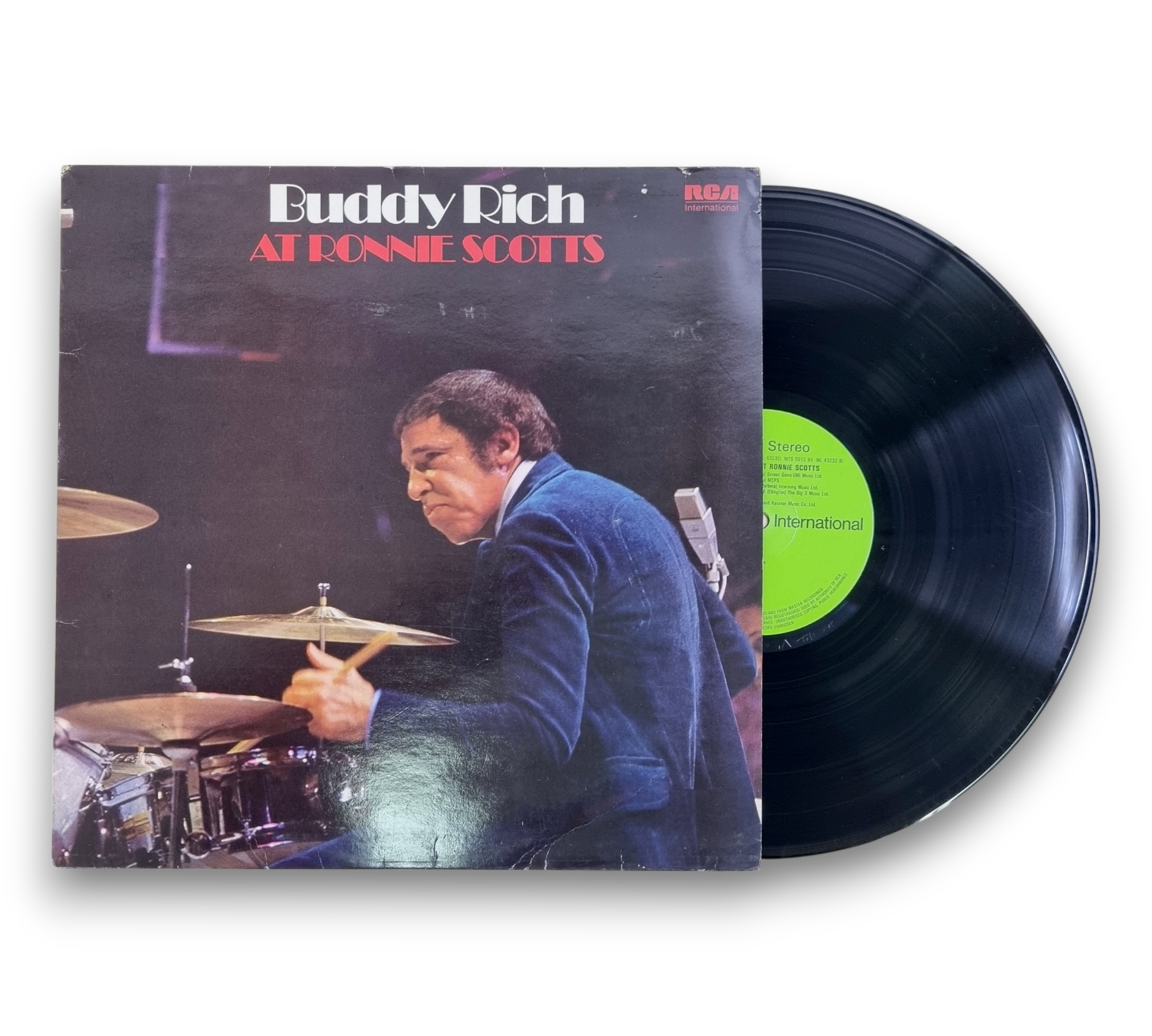 This listing features "Buddy Rich at Ronnie Scotts," a live album recorded at Ronnie Scott's Club in London. The record is marketed by RCA Limited, England, and showcases a different front cover with the RCA logo positioned in the upper right corner. The album includes a variety of tracks, with compositions published by several music companies. The label layout is distinct, and the album was originally available as part of DPS 2031. For further details regarding the packaging and inserts, please refer to the accompanying photos.