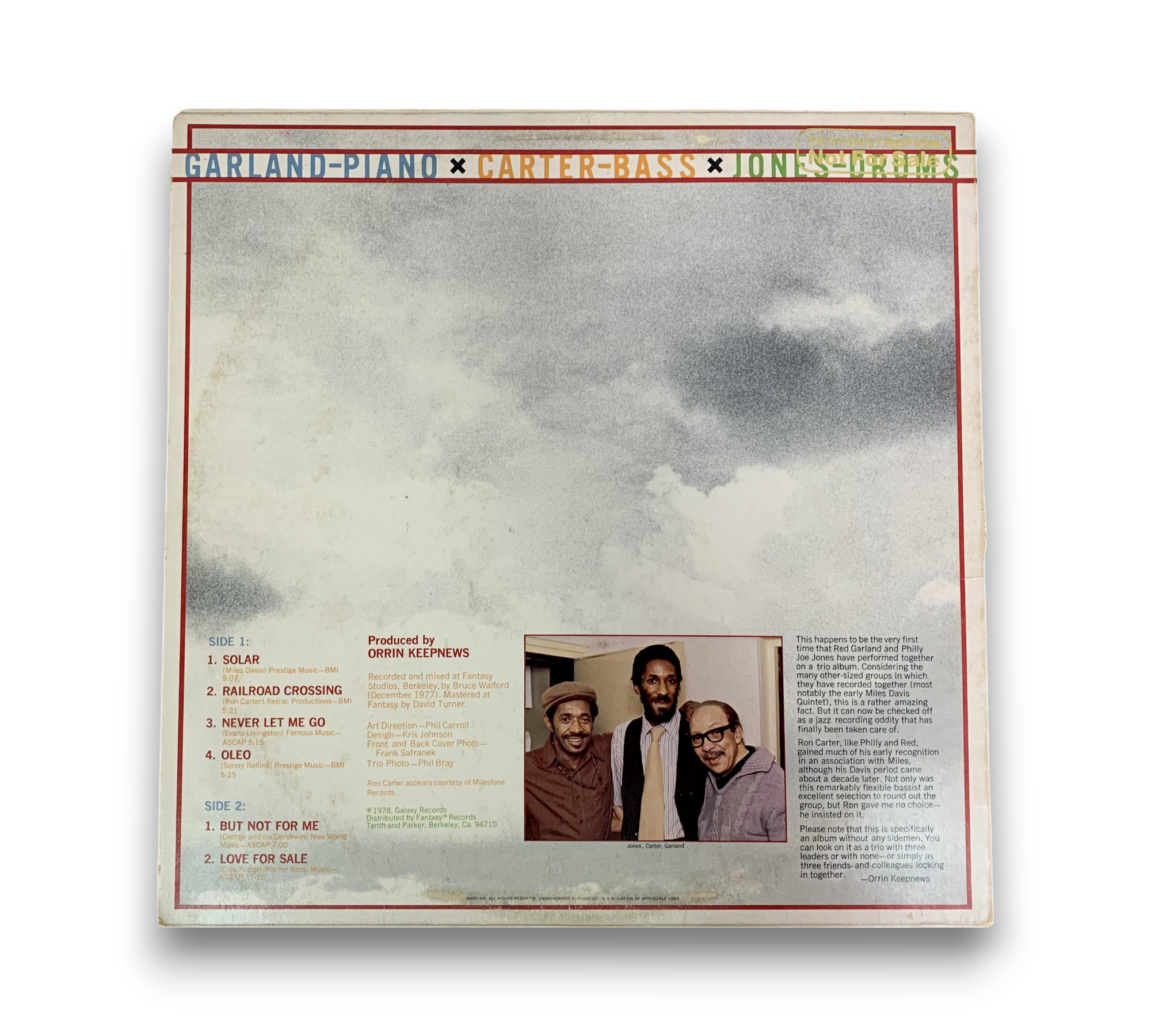 Experience the smooth sounds of jazz with "Crossings," a 1978 release featuring the legendary collaboration of Red Garland, Ron Carter, and Philly Joe Jones. Recorded at Fantasy Studios in Berkeley, this album showcases masterful performances on tracks like "Solar" and "Love For Sale." Released under Galaxy Records, this vinyl pressing is a must-have for any jazz enthusiast looking to enrich their collection.
