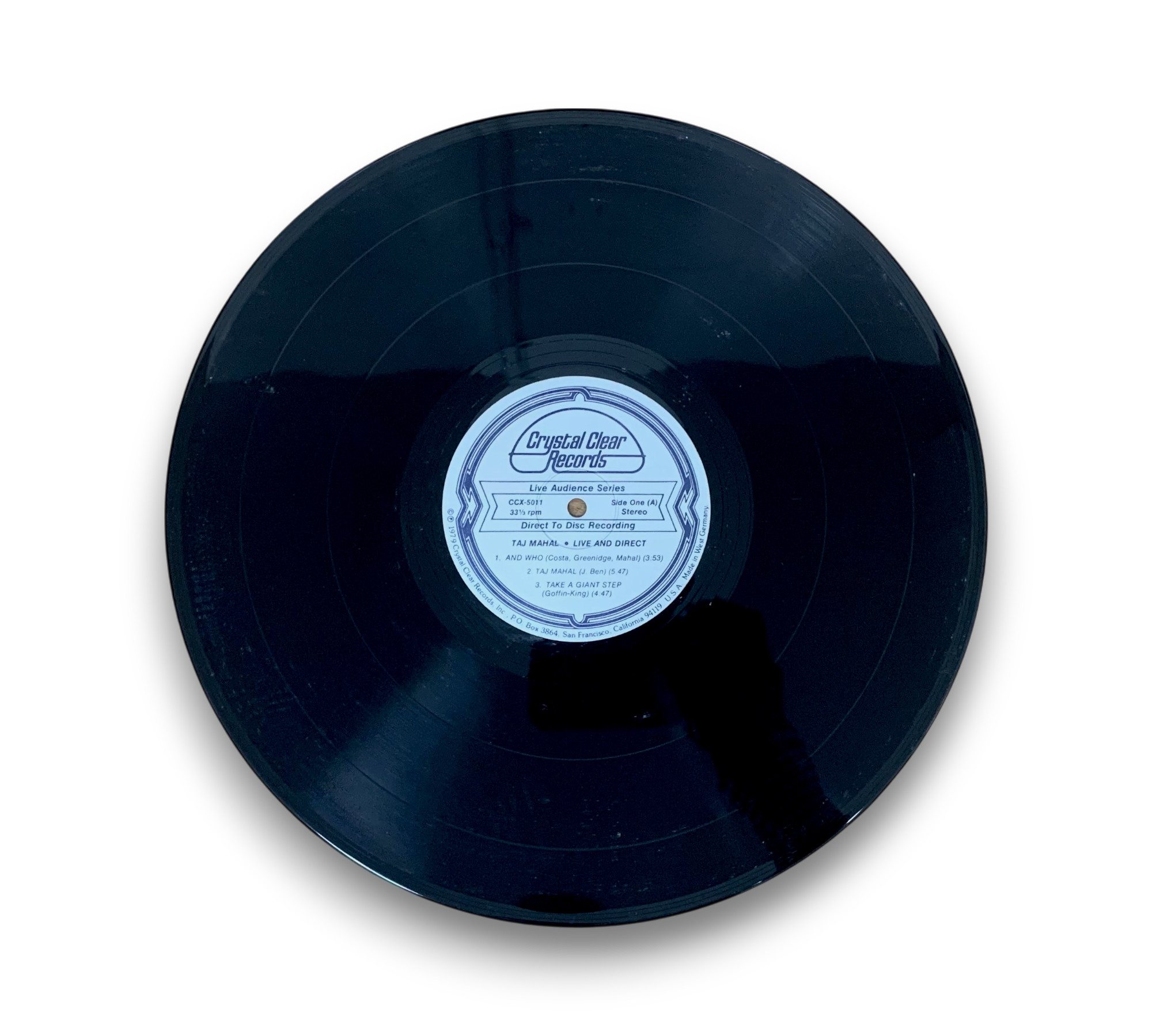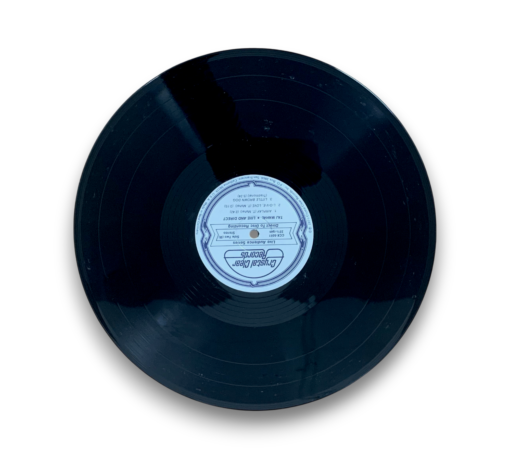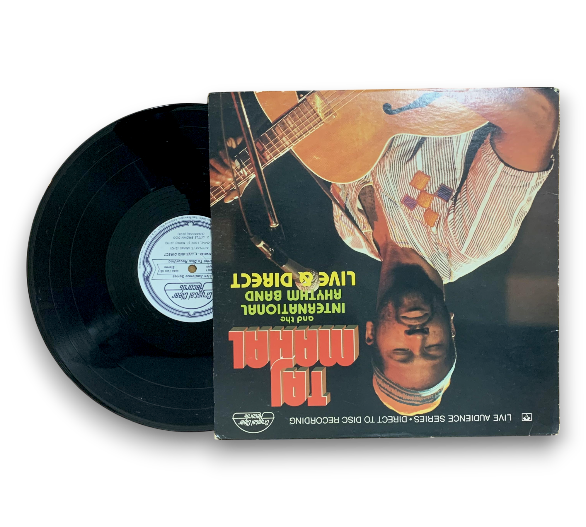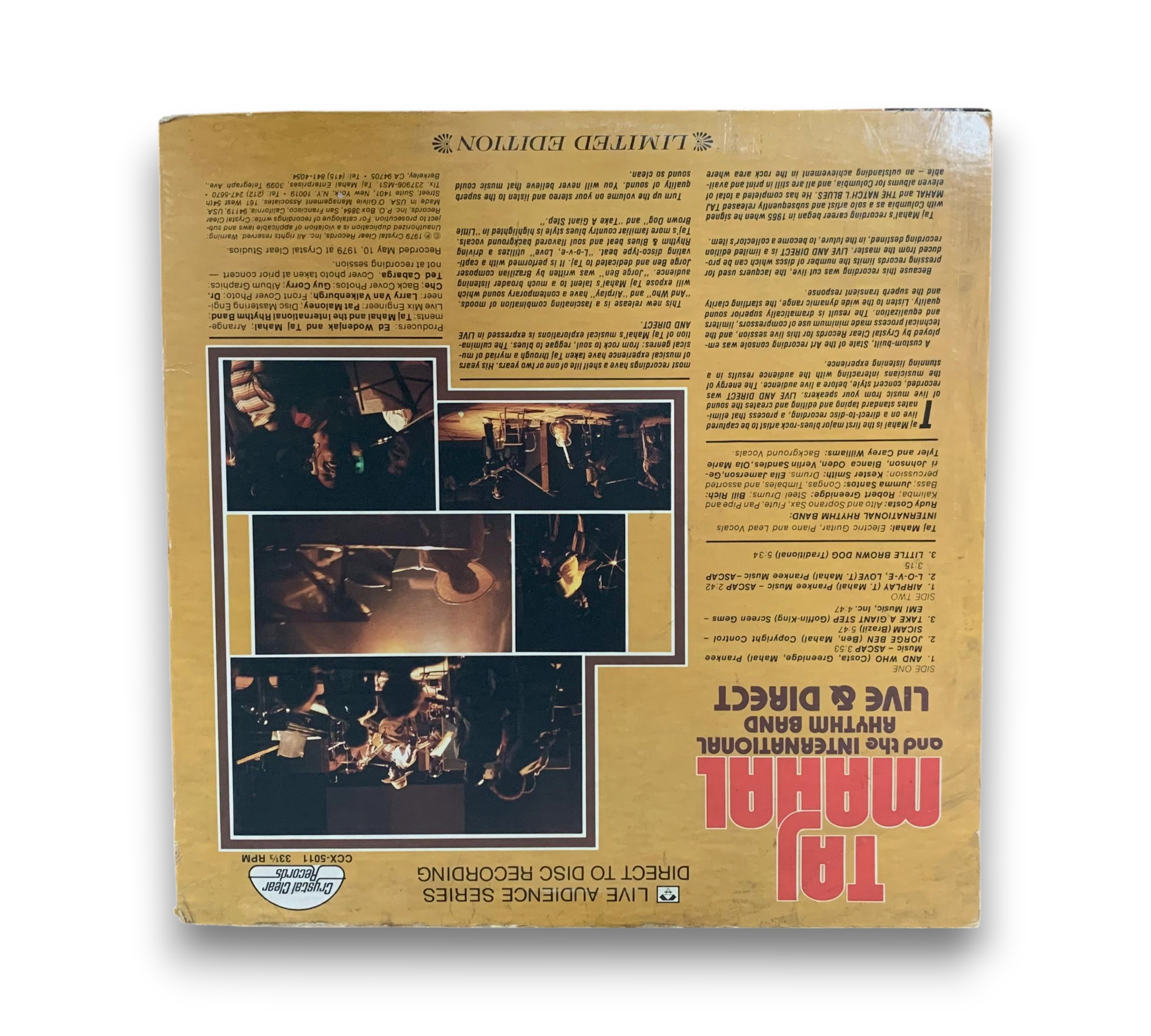 This limited edition record features a live direct-to-disc recording by Taj Mahal and the International Rhythm Band. The musicians, apart from Taj Mahal, are credited as members of the band. The record was manufactured in West Germany, and the runouts are etched, with the exception of the stamped note indicating "Manufactured in Germany." Please note that no additional items are included with this listing. For further details, please refer to the accompanying photos.