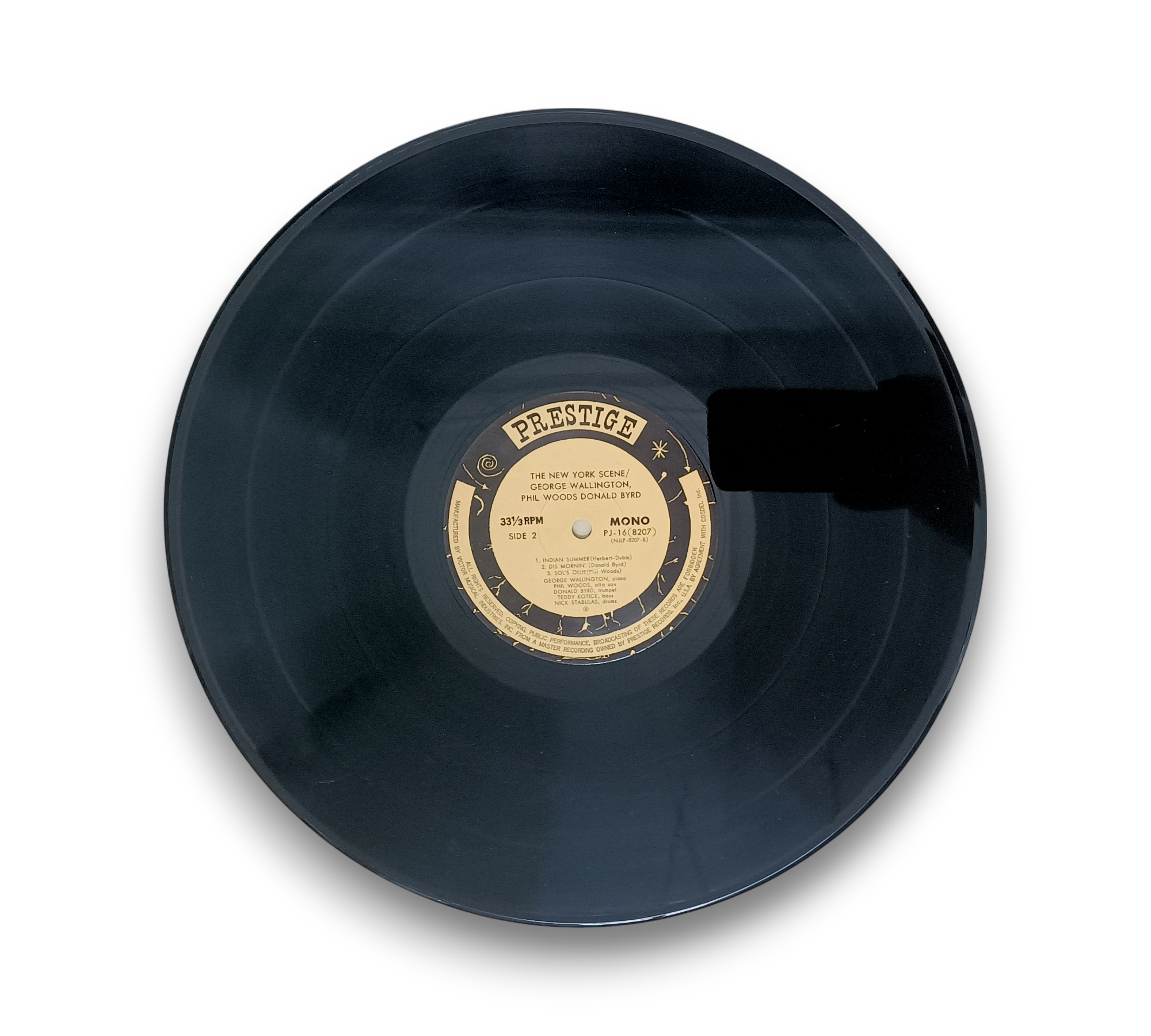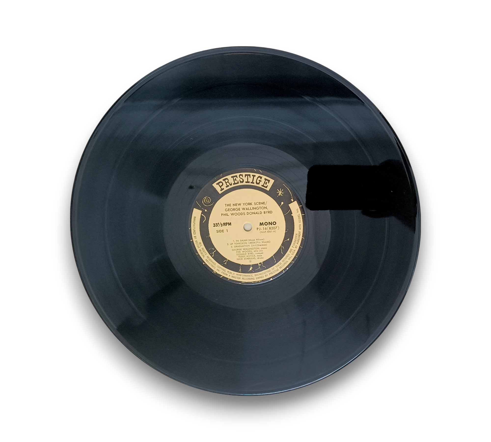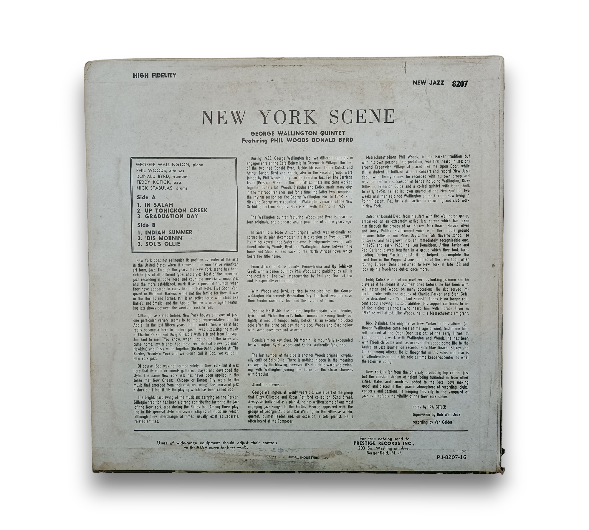 Recorded in Hackensack, NJ, on March 1, 1957, "The New York Scene" features the George Wallington Quintet, showcasing the talents of Phil Woods and Donald Byrd. This album, released under the New Jazz label, includes tracks such as "In Salach," "Up Tohockon Creek," and "Graduation Day." The accompanying images provide a visual representation of the record and its cover. For further details regarding the condition and specific packaging, please refer to the provided photos.