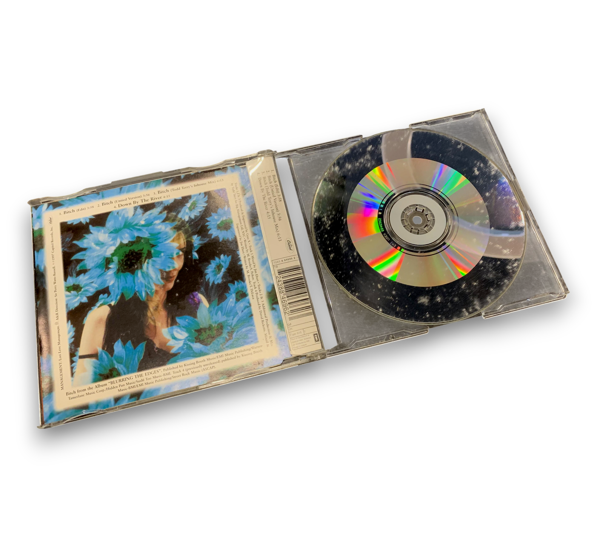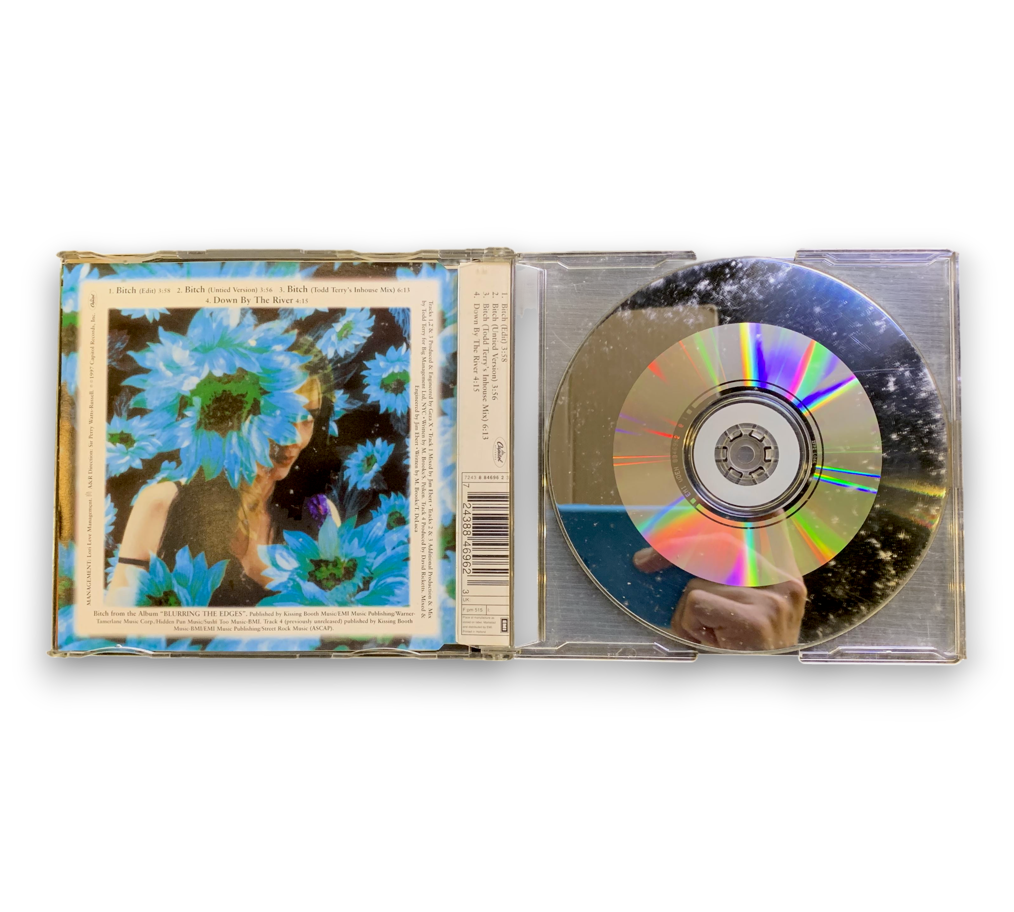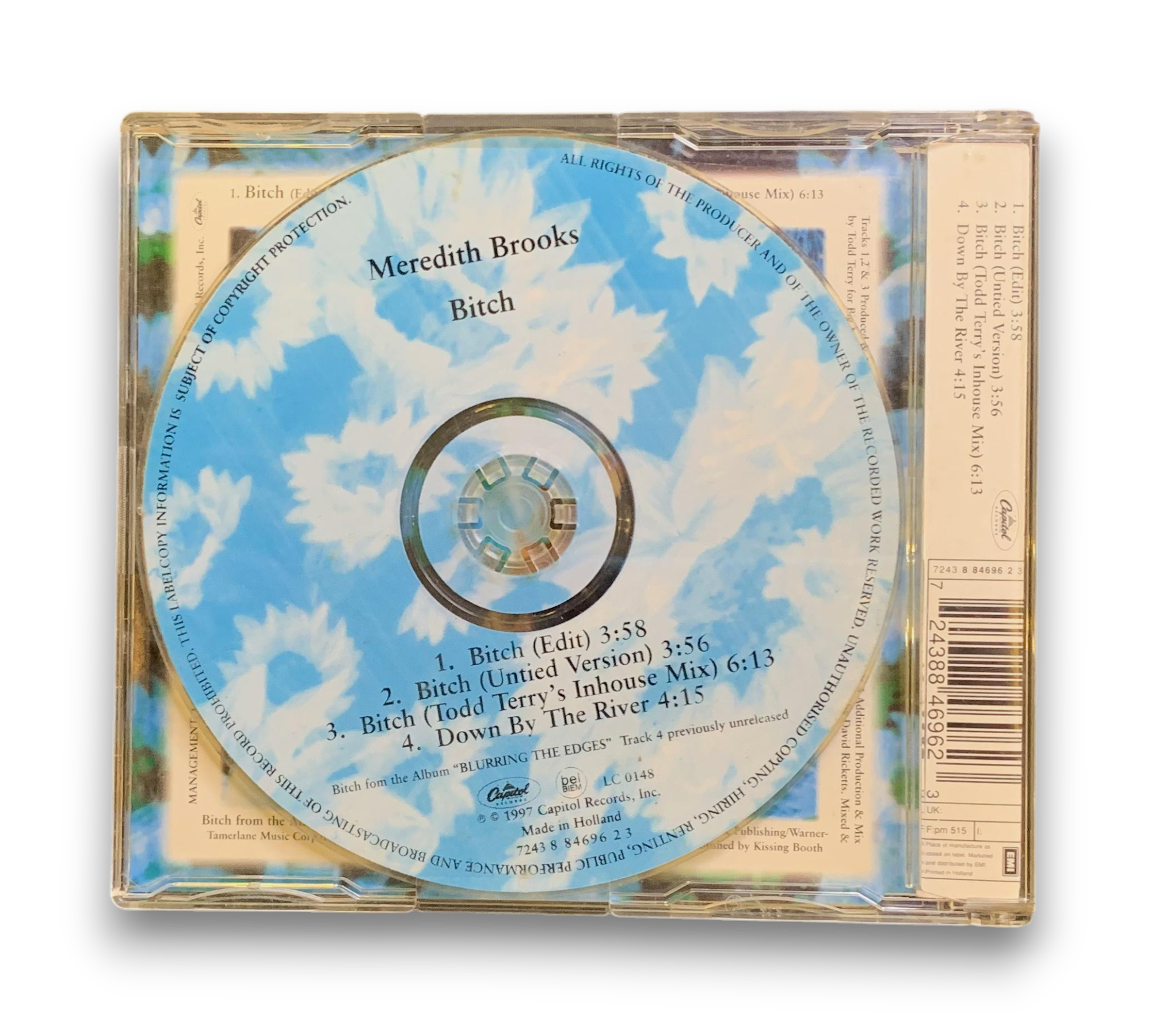 This listing features "Bitch" by Meredith Brooks, a single from the album "Blurring the Edges." The CD includes four tracks: the radio edit, an untitled version, a Todd Terry's Inhouse Mix, and "Down By The River," the latter being previously unreleased. The release is under Capitol Records, with the copyright dating back to 1997. The disc and insert indicate that it was made and printed in Holland. For further details regarding the condition and packaging, please refer to the accompanying photos.