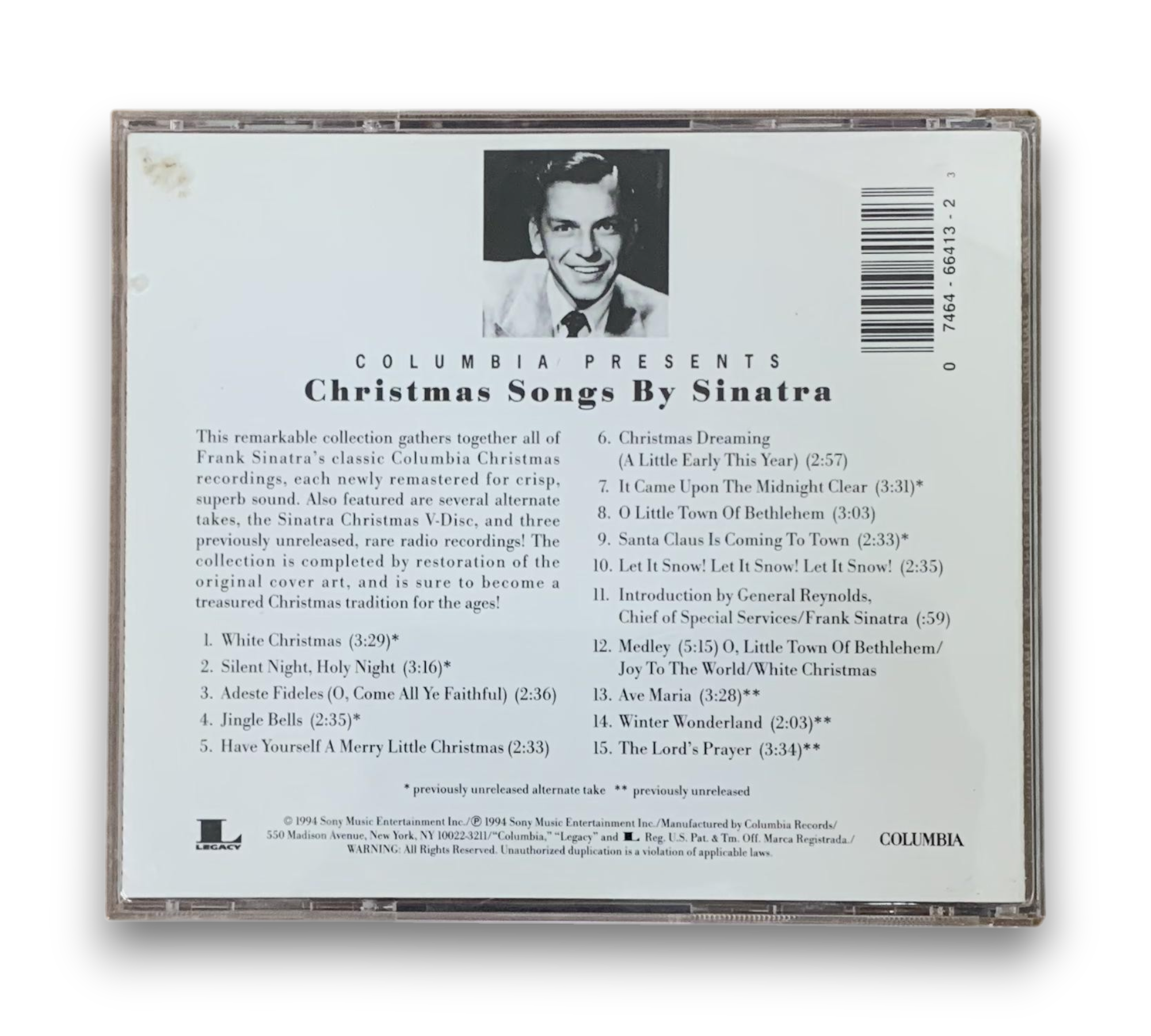 Celebrate the holiday season with "Christmas Songs By Sinatra," a beautifully remastered CD featuring Frank Sinatra's classic Columbia Christmas recordings. This collection includes timeless favorites like "White Christmas," "Silent Night, Holy Night," and "Jingle Bells," along with alternate takes and previously unreleased radio recordings, making it a unique addition to your festive music library. Housed in a standard jewel case, this CD is perfect for both longtime fans and new listeners looking to embrace the spirit of Christmas with Sinatra's smooth vocals.