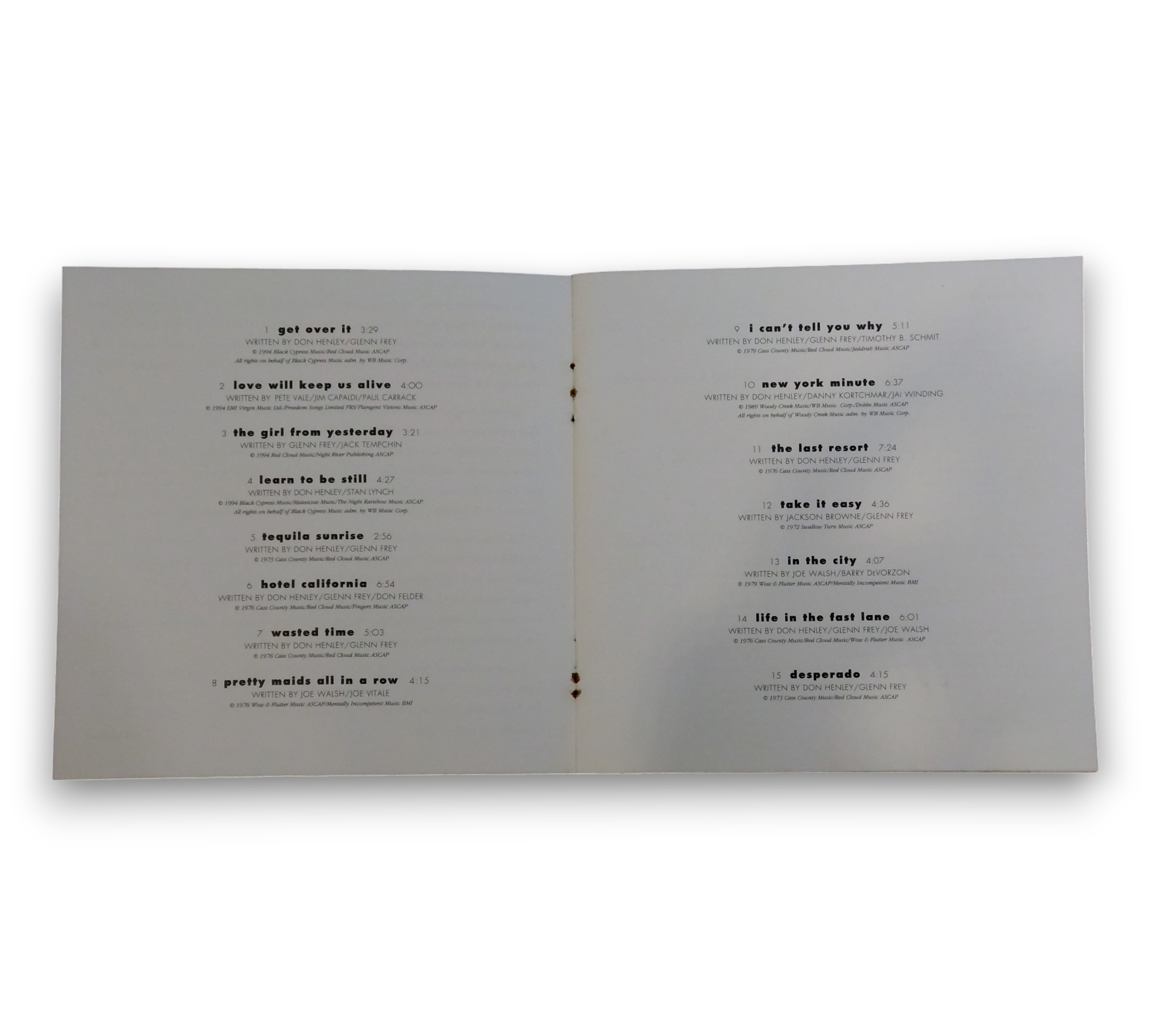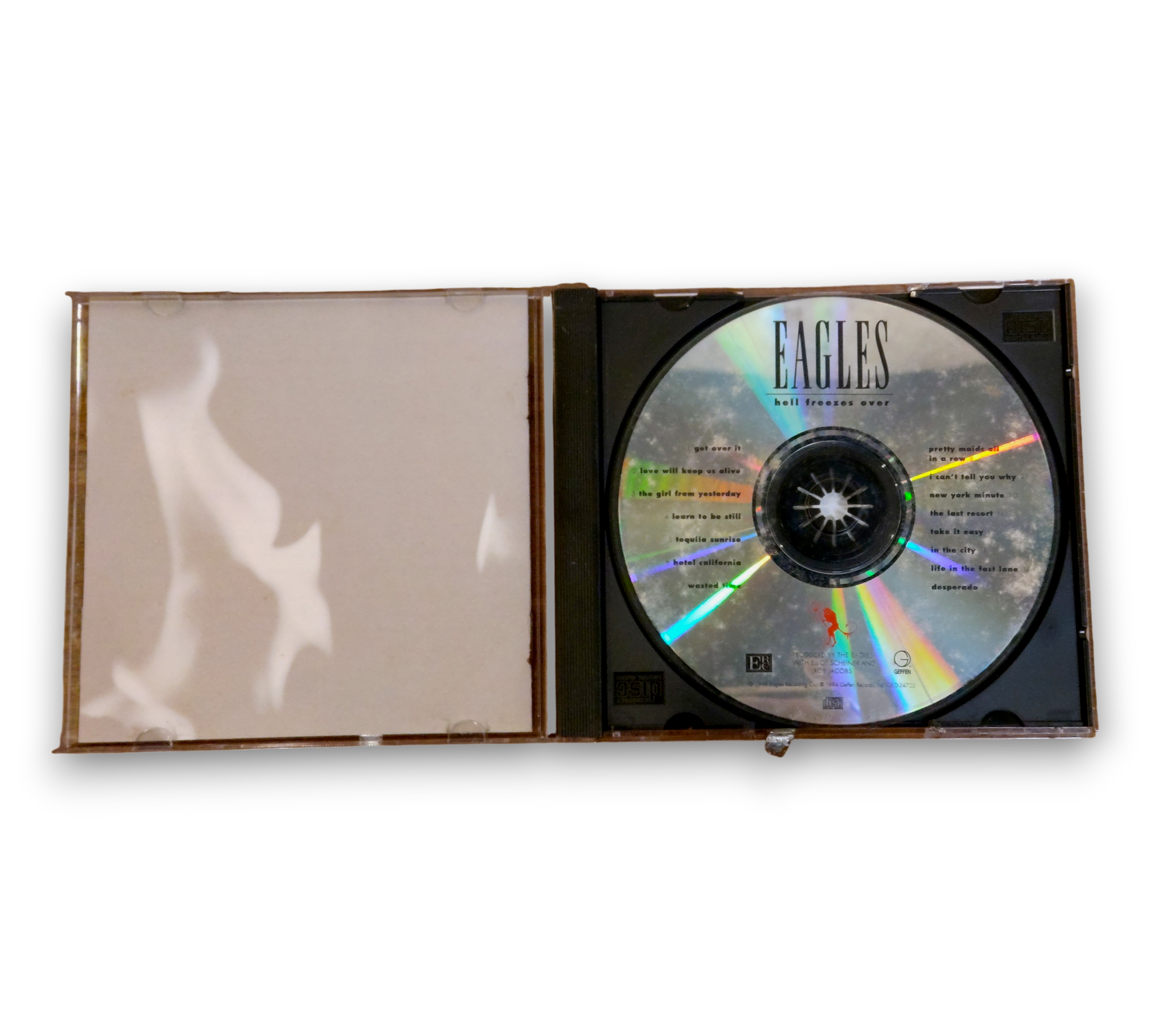The listing features the Eagles' "Hell Freezes Over" CD, which includes a booklet containing the lyrics to four tracks along with a black and white band photo. Please refer to the accompanying images for a detailed view of the packaging and contents, as any additional information regarding inserts or packaging may not be accurate.