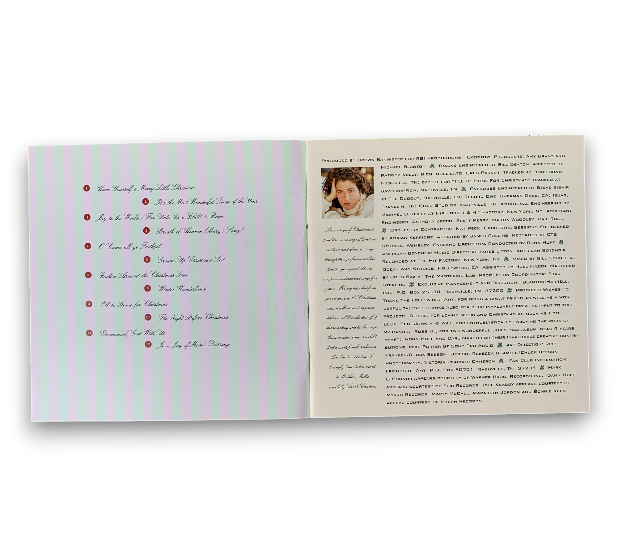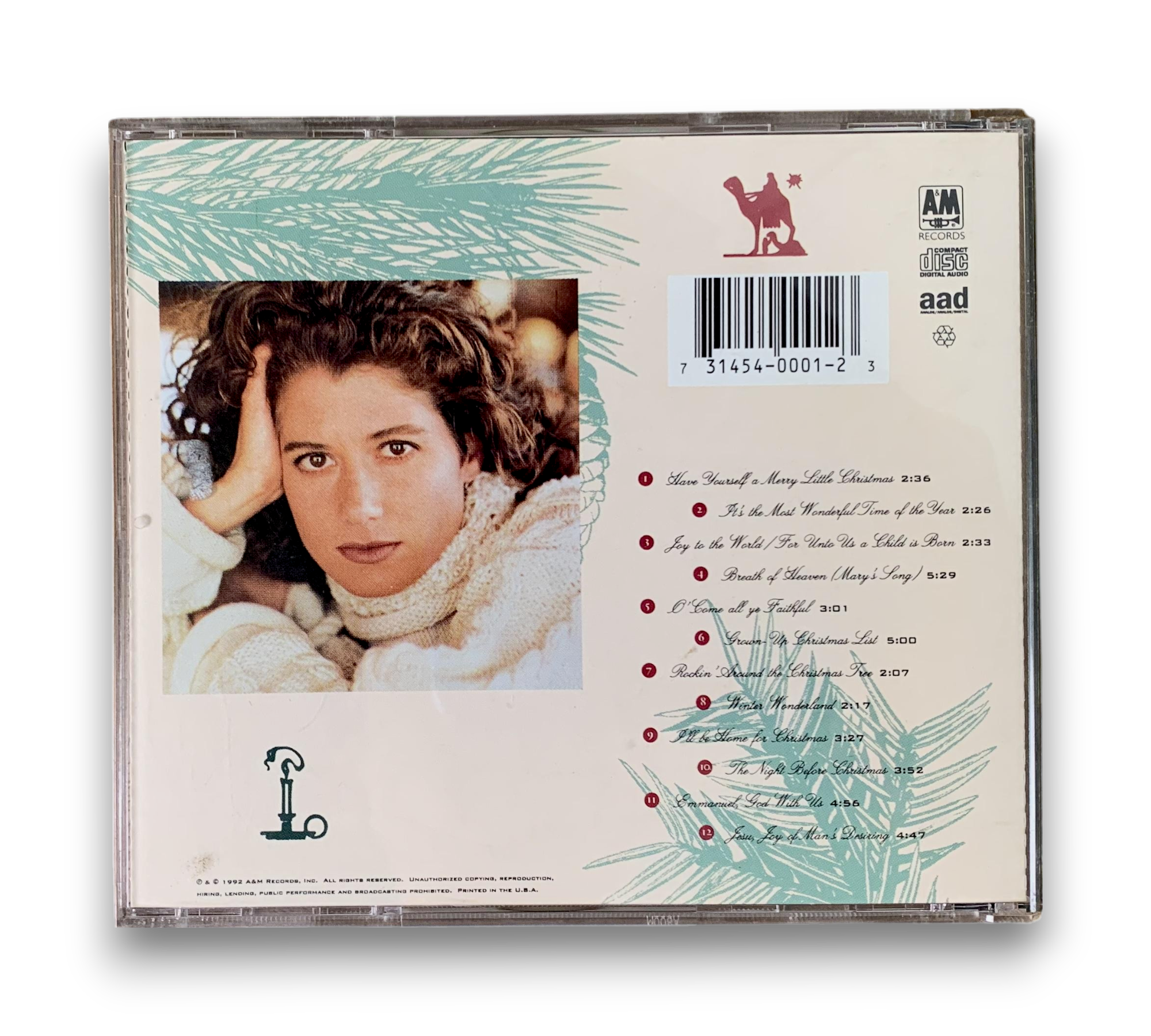 ℗&© 1992 A&M Records, Inc. This release features contributions from various artists, including Mark O'Connor, Dann Huff, Phil Keaggy, Marabeth Jordon, and Bonnie Keen, all appearing courtesy of their respective labels. The CD includes a collection of holiday tracks, showcasing Amy Grant's signature style. For specific details regarding packaging and inserts, please refer to the accompanying photos.