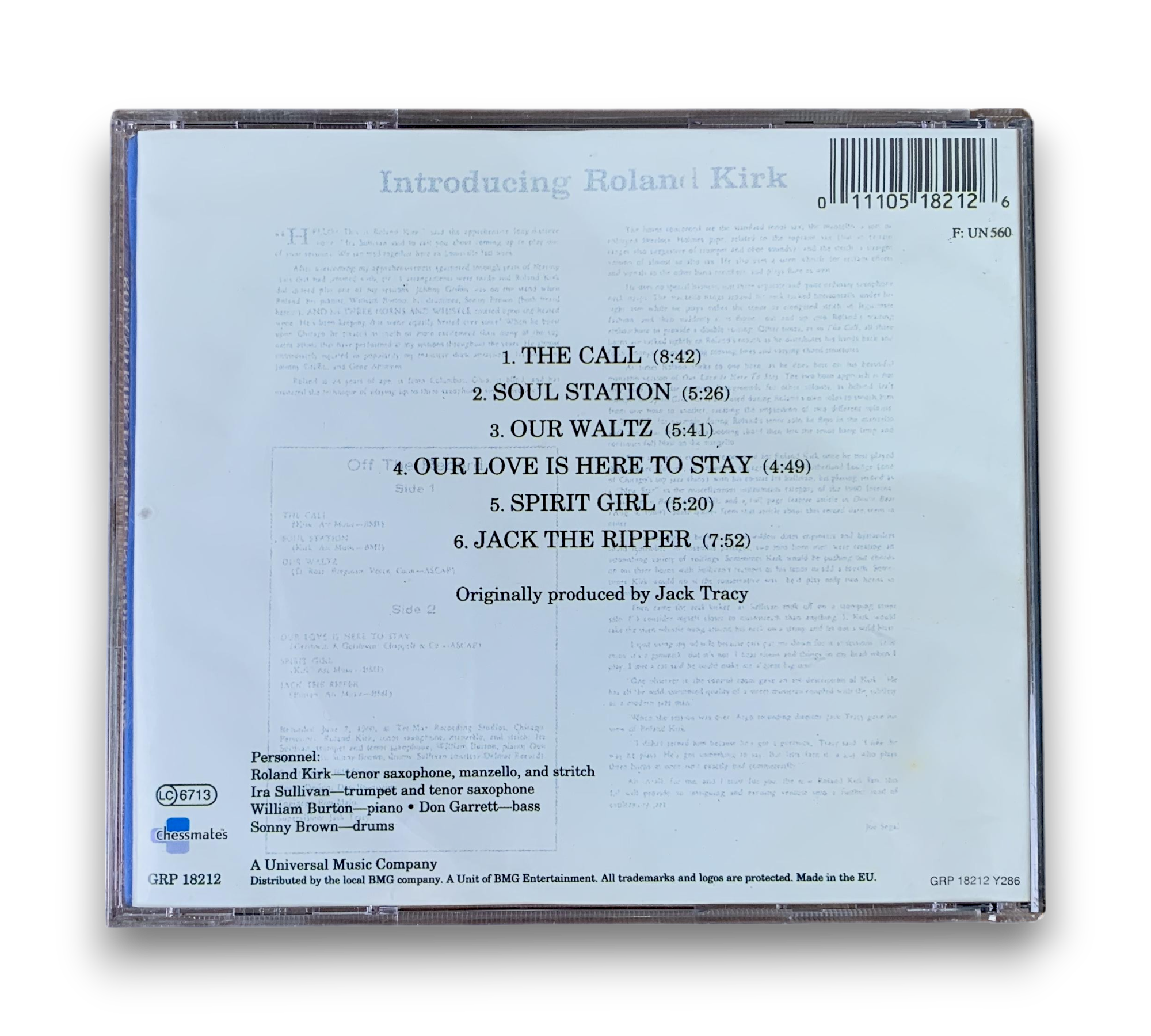 Experience the innovative sounds of jazz with Roland Kirk's "Introducing Roland Kirk," recorded in 1960 and released on CD in 1998. This album showcases Kirk's exceptional talent on the tenor saxophone, manzello, and stritch, featuring standout tracks like "The Call," "Soul Station," and "Jack the Ripper." With its cool jazz style, this release is a testament to Kirk's musical prowess and creativity. Please refer to the accompanying photos for details regarding the packaging and inserts.