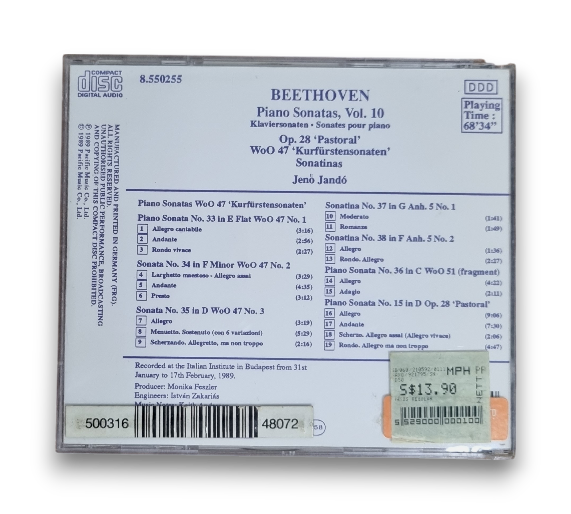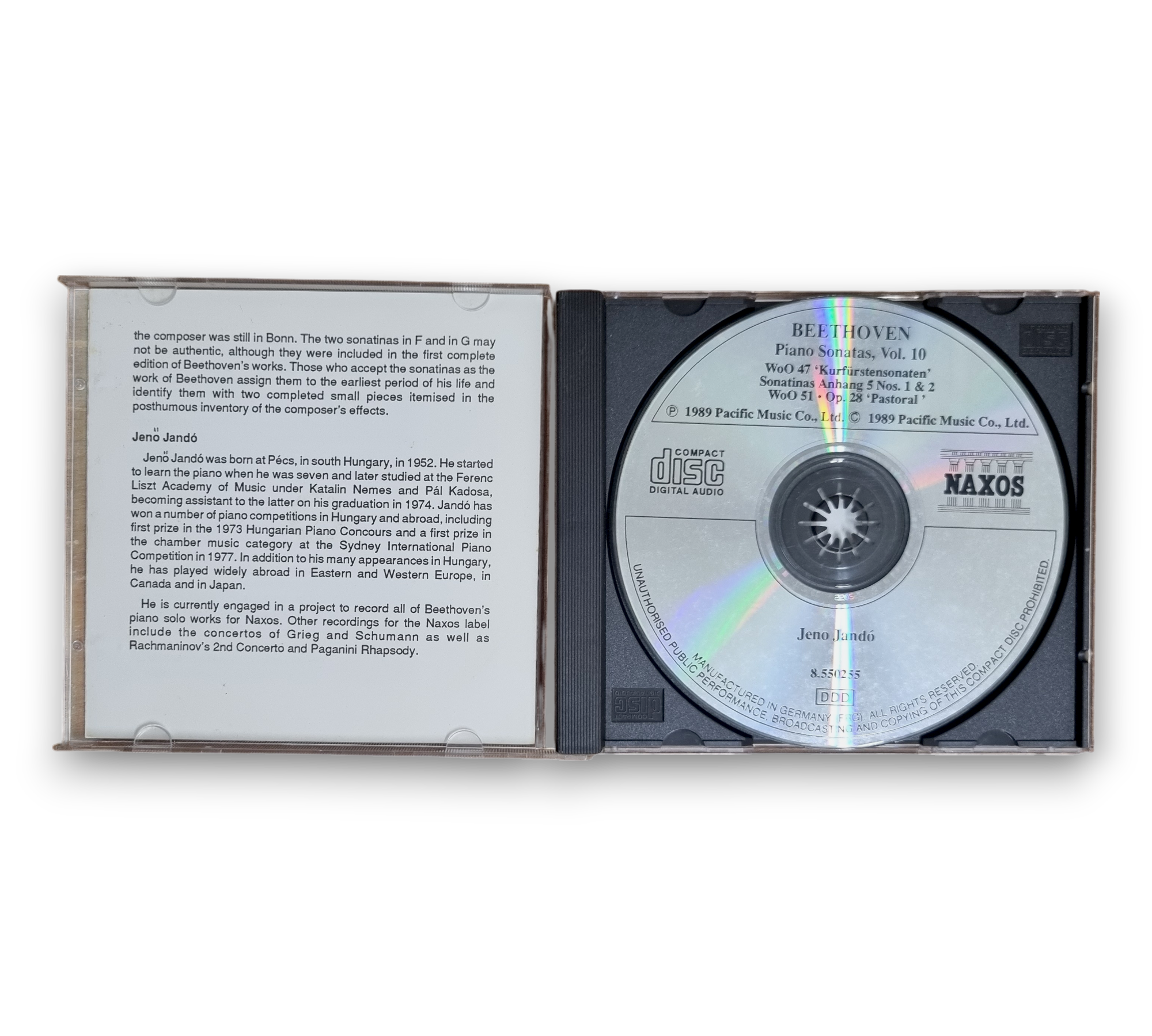 Discover the timeless elegance of Beethoven with "Piano Sonatas, Vol. 10," featuring the exceptional artistry of pianist Jenö Jandó. Released in 1989, this CD showcases a selection of Beethoven's lesser-known works, including the 'Kurfürstensonaten' and the 'Pastoral' Sonata, offering a captivating journey through his classical genius. With intricate melodies and emotive performances, this album is a must-have for classical music enthusiasts and collectors alike.