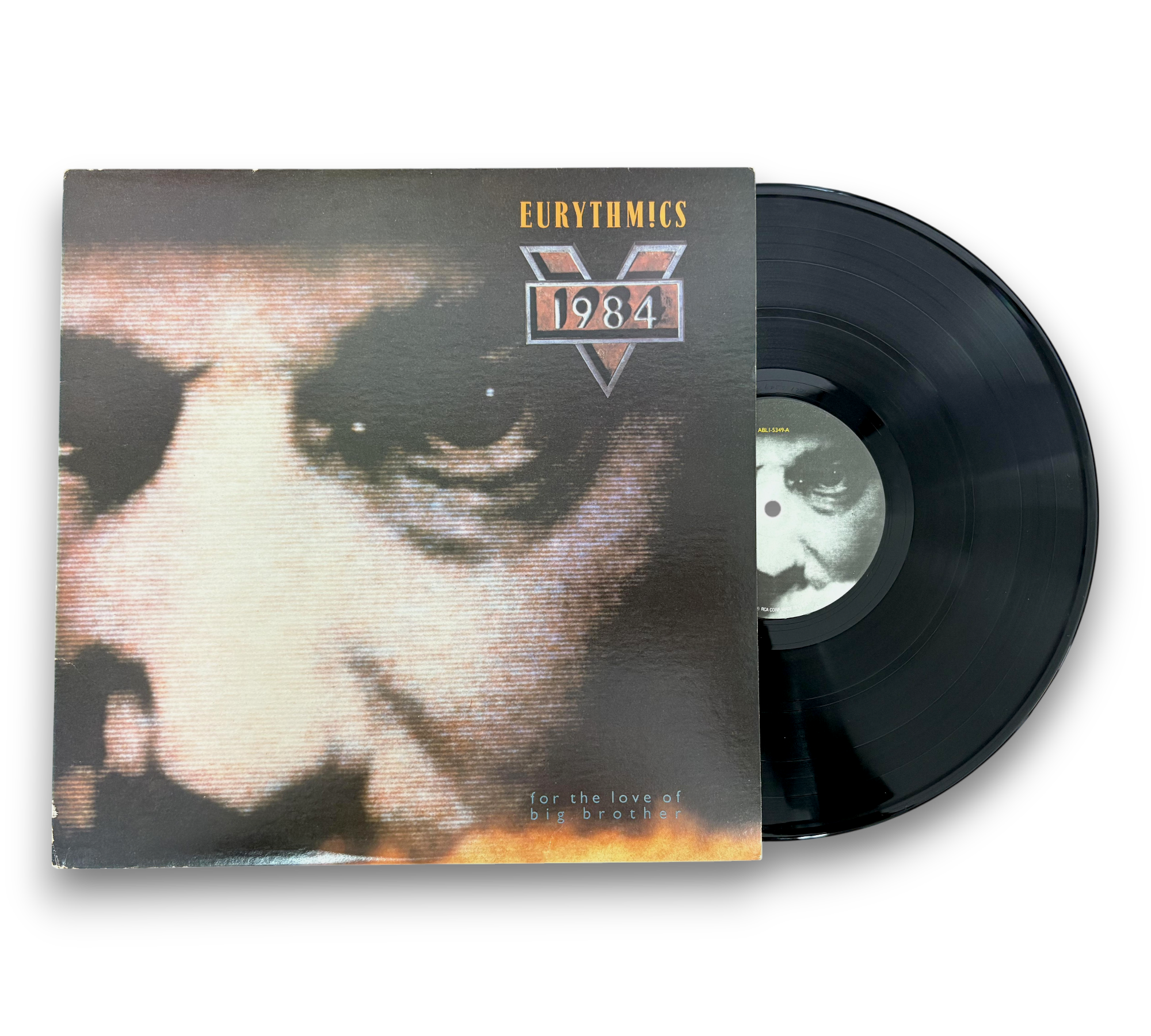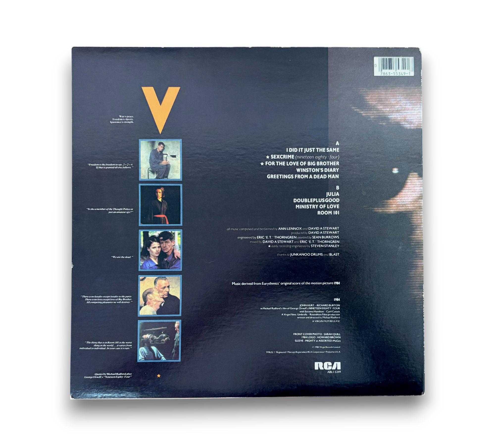 This record features music derived from Eurythmics' original score for the motion picture "1984." It is pressed by RCA Records at their Indianapolis facility, as indicated by the "I" stamped in the runouts. The release includes a printed inner sleeve, and the sleeve artwork showcases striking imagery related to the film. The labels confirm the release year as 1984, with all music composed by Annie Lennox and David Stewart. For further details regarding the packaging and inserts, please refer to the accompanying photos.