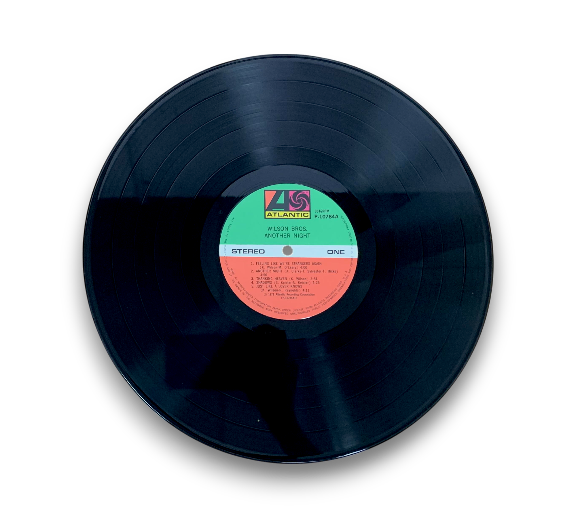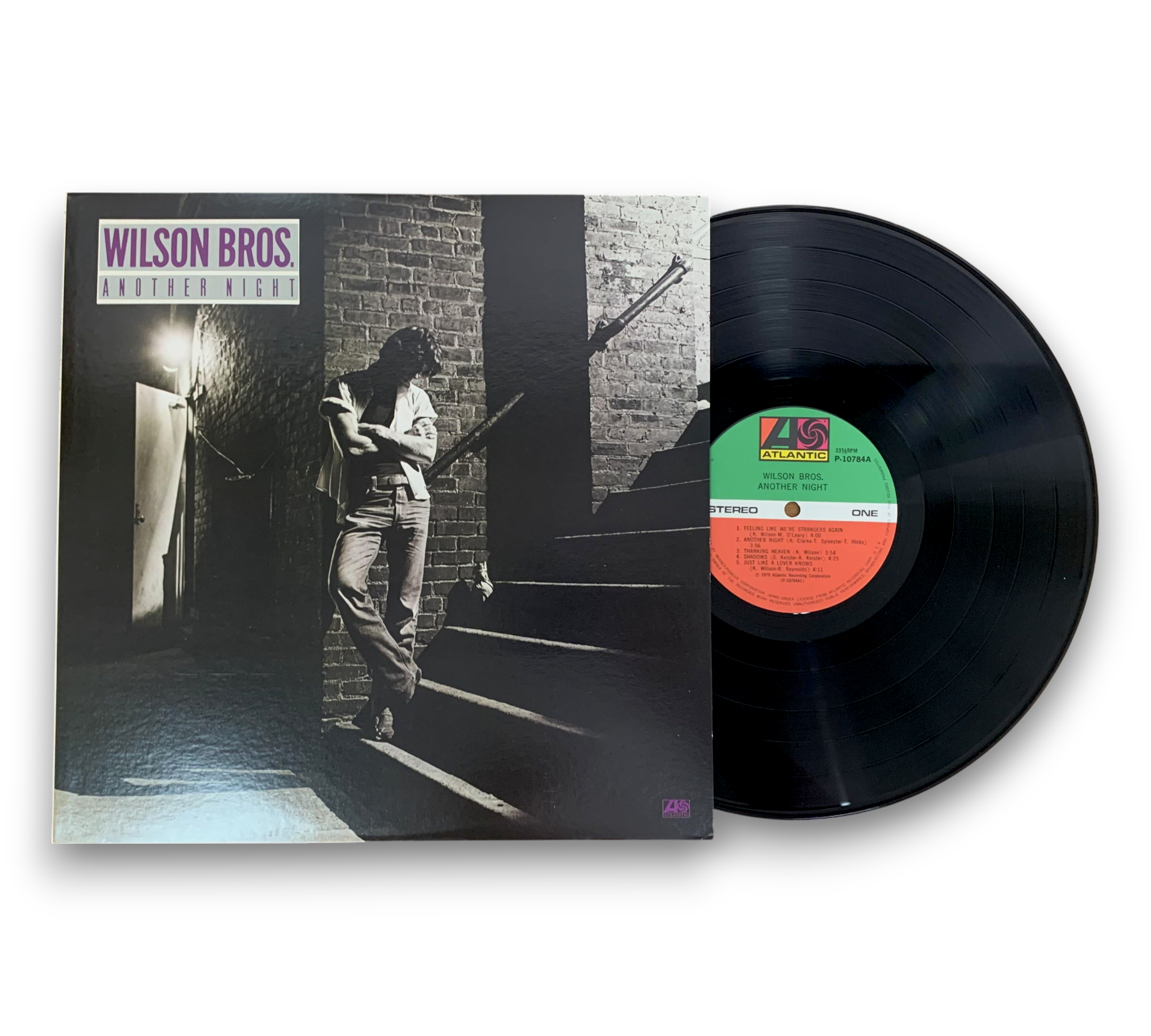 ℗ 1979 Atlantic Recording Corporation. This album, "Another Night" by Wilson Bros., was made by Warner-Pioneer Corporation in Japan and features recordings from various studios, including Doc's Place in Hendersonville, TN, and Cherokee Studios in Los Angeles, CA. The mastering was completed at Mastering Lab in Hollywood, CA. A lyric sheet is included; please refer to the accompanying photos for further details on the packaging and inserts.