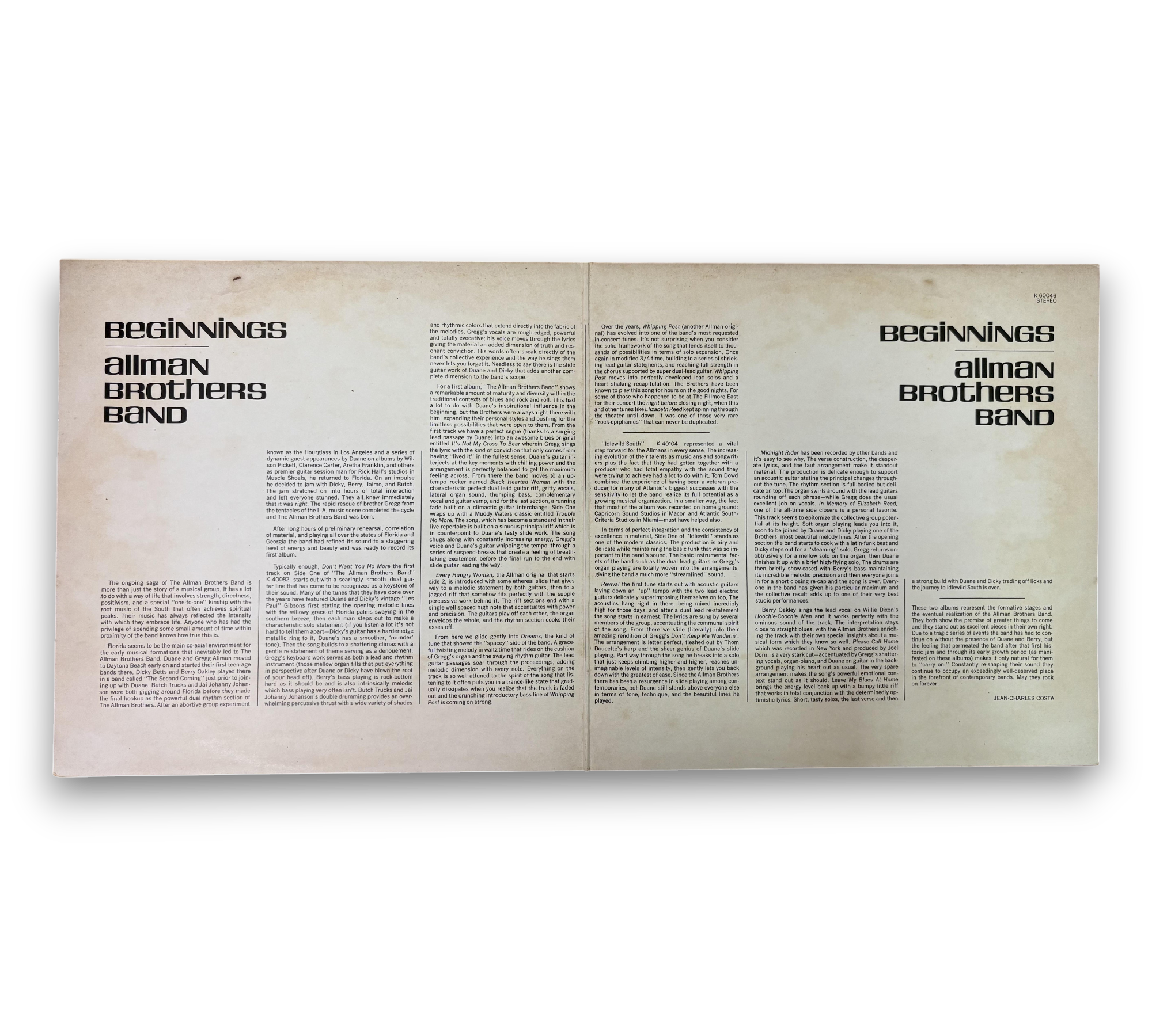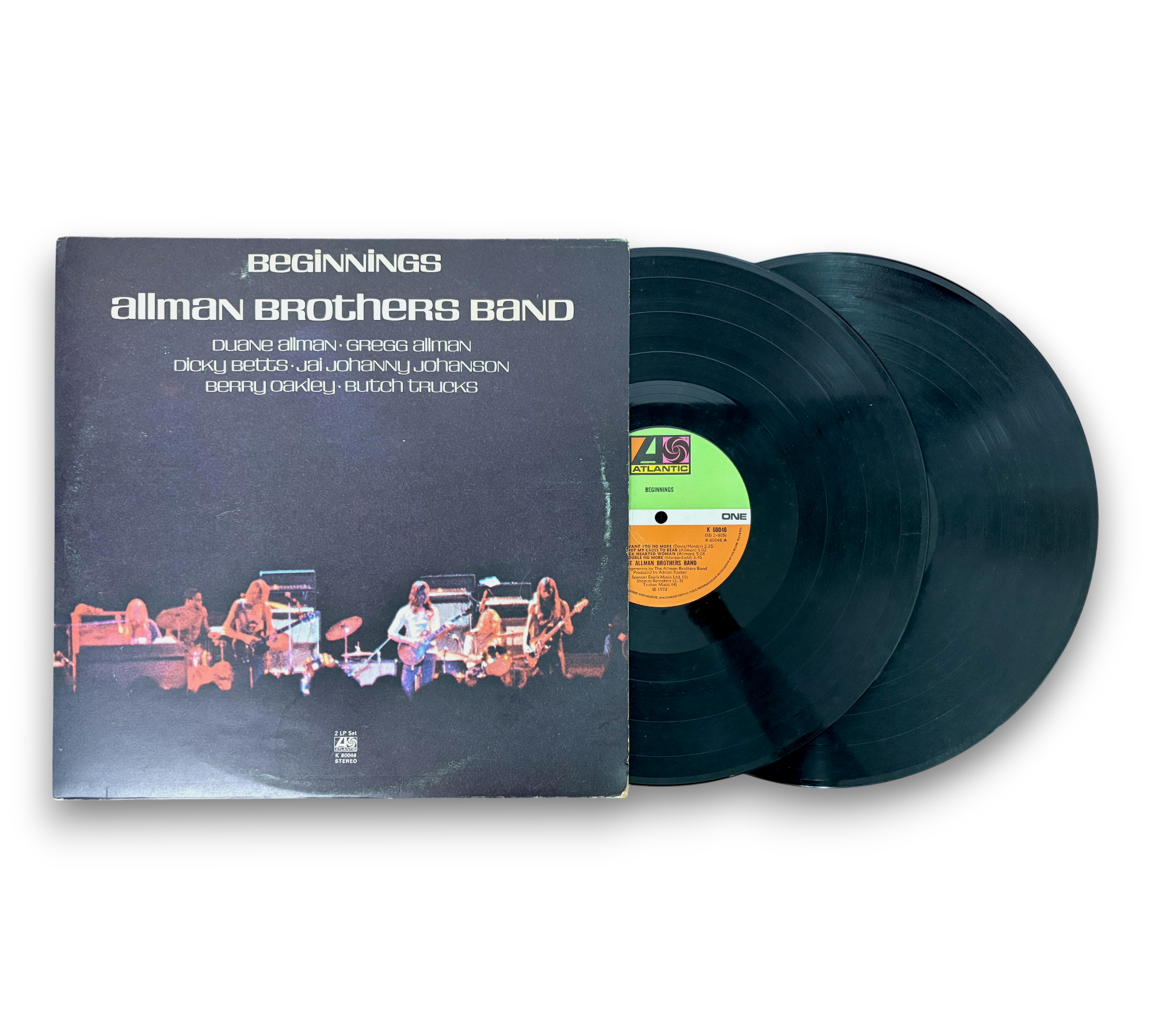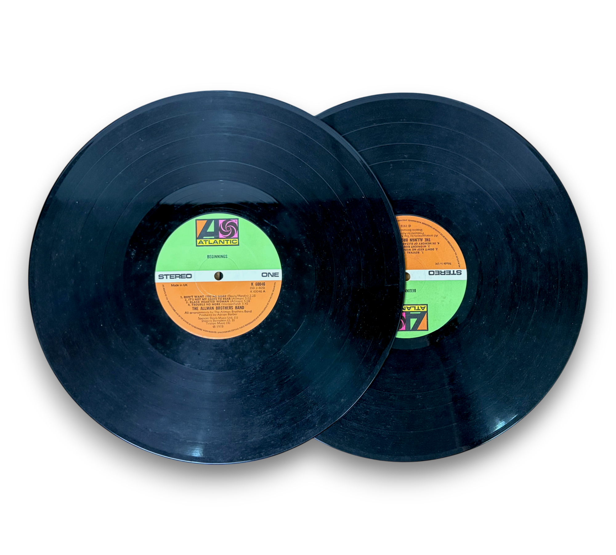 Discover the timeless sounds of The Allman Brothers Band with "Beginnings," a 1973 UK release featuring their first two albums, "The Allman Brothers Band" and "Idlewild South." This set comes in an unlaminated gatefold cover with striking all-white lettering and includes vinyl records with green and red Atlantic labels. Enjoy classic tracks like "Whipping Post," "Midnight Rider," and "In Memory Of Elizabeth Reed," showcasing the band's signature blend of rock and blues. A must-have for any vinyl collector!