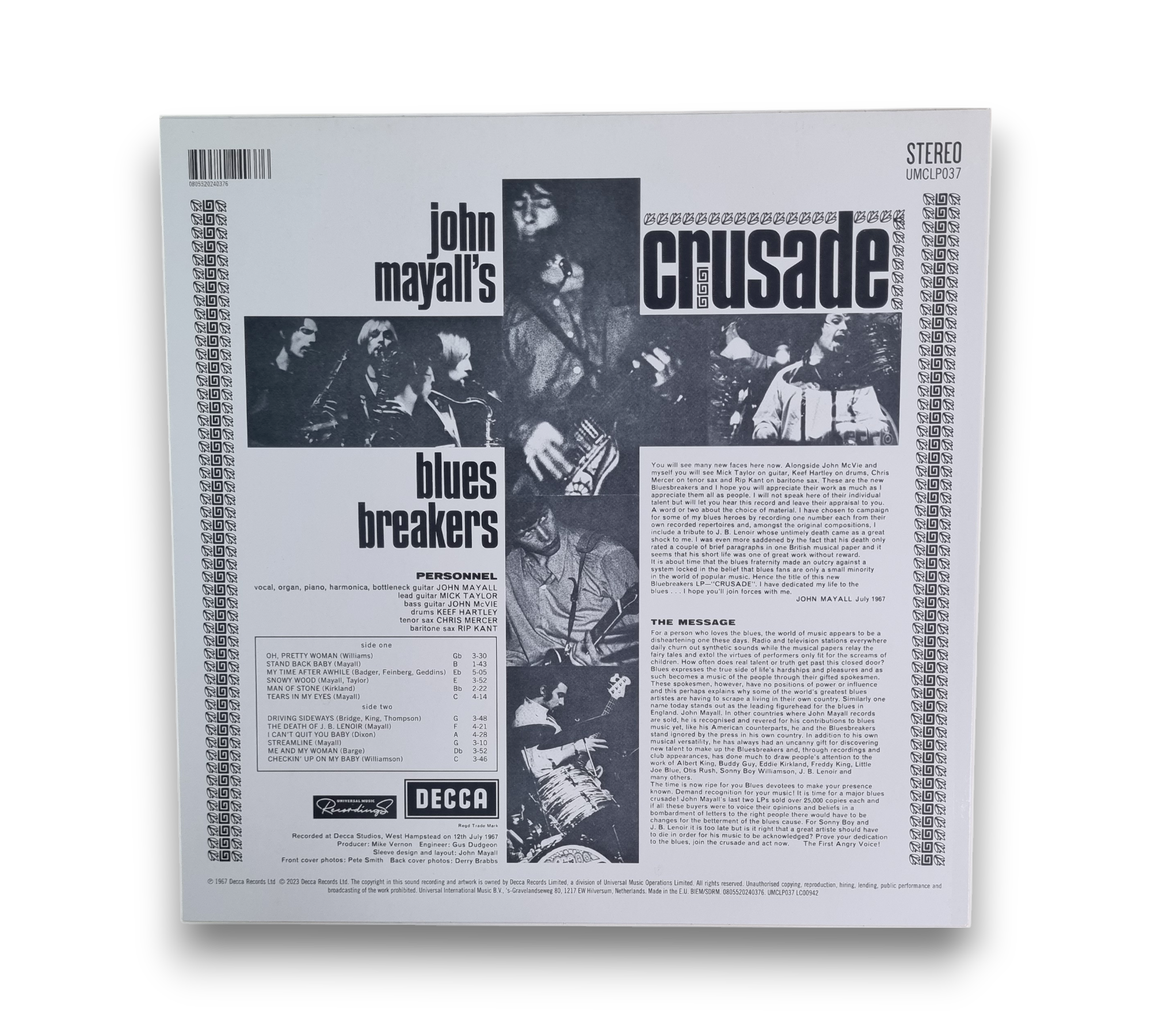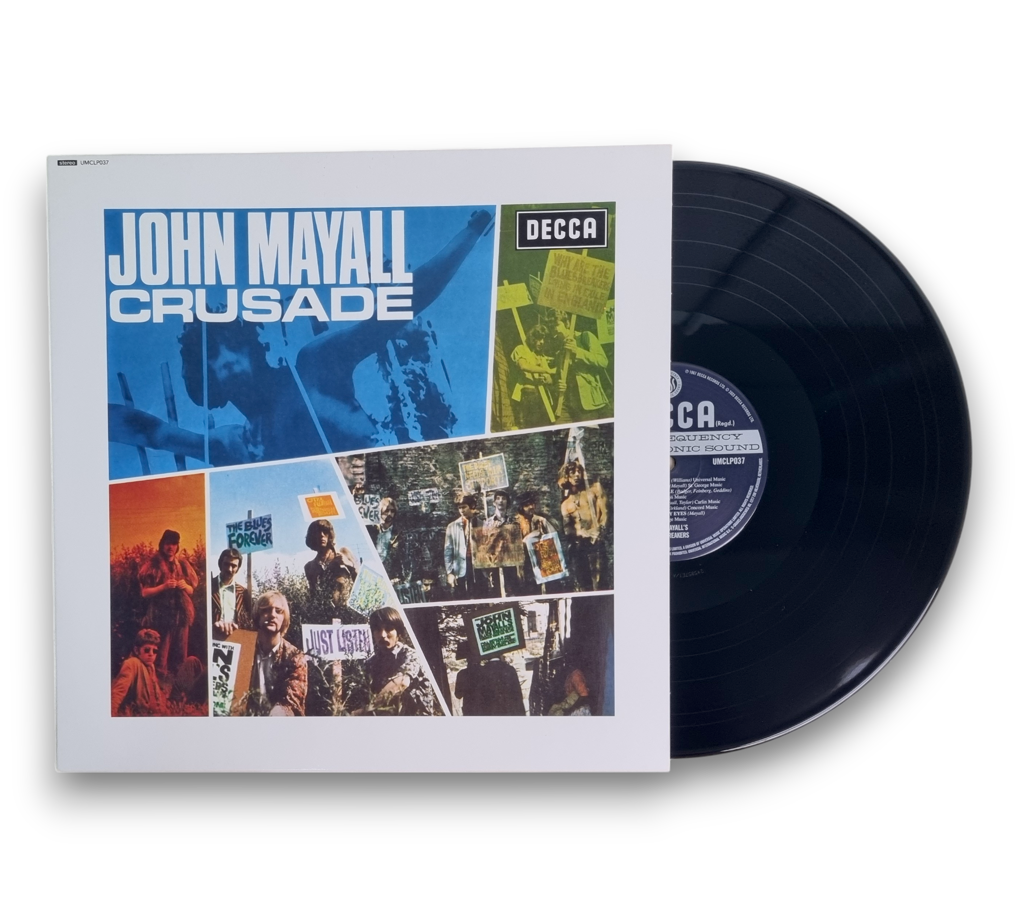 This record features John Mayall's "Crusade," with a plain white poly lined inner sleeve. While the front cover credits only John Mayall as the main artist, the spine, back cover, and labels correctly reflect the full title. The album was recorded at Decca Studios in West Hampstead on July 12, 1967, and is released under Decca Records Ltd. The copyright information indicates that the sound recording and artwork are owned by Decca Records Limited, a division of Universal Music Operations Limited. For further details regarding the packaging and inserts, please refer to the accompanying photos.