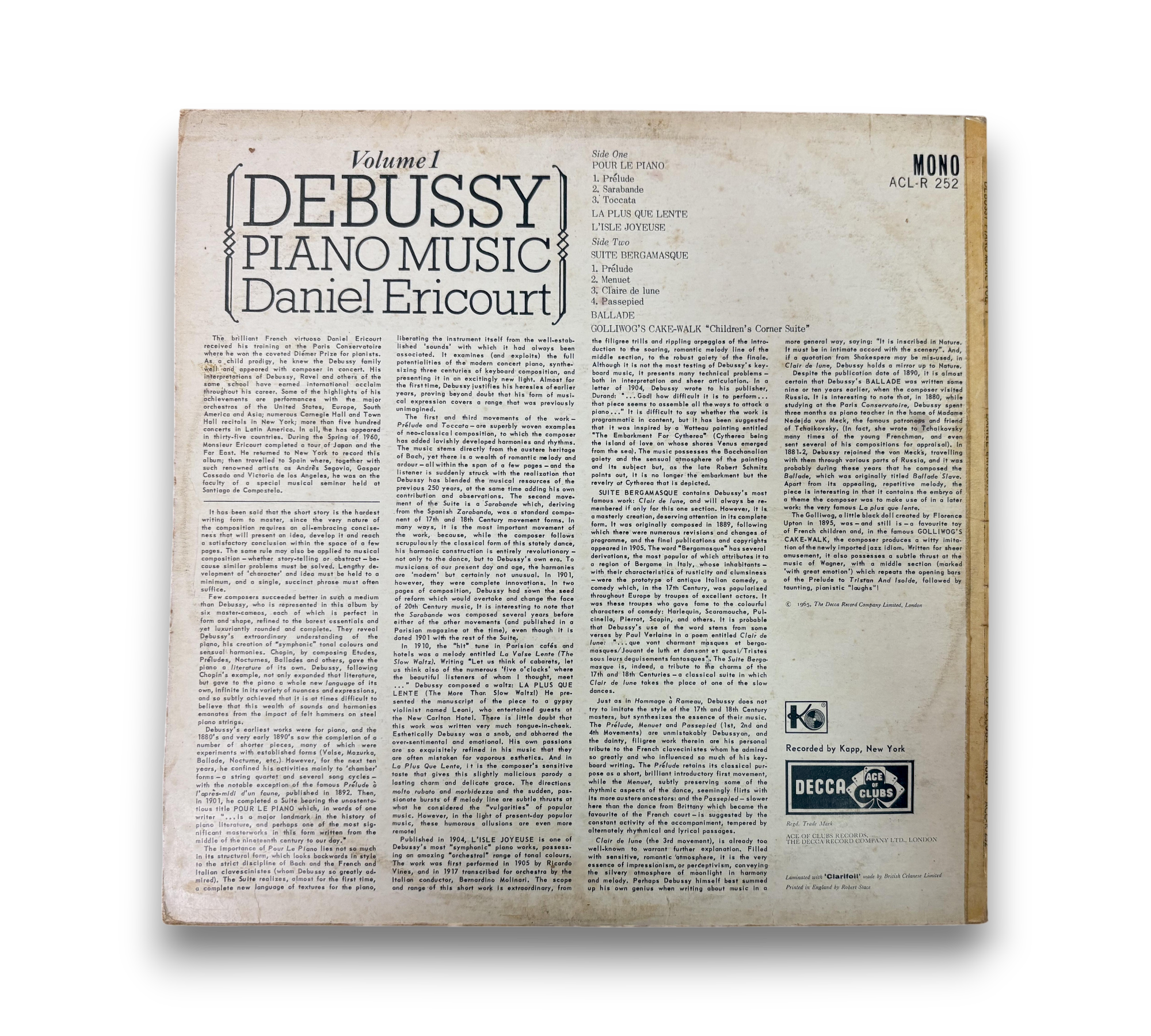 Experience the enchanting world of Claude Debussy with "Piano Music Volume 2," featuring the masterful interpretations of pianist Daniel Ericourt. Released in 1965, this vinyl record showcases a selection of Debussy's most celebrated works, including "La cathédrale engloutie" and "Reflets dans l'eau." This collection is a must-have for classical music enthusiasts, offering a captivating journey through Debussy's innovative compositions. Enjoy the timeless beauty of these pieces, beautifully pressed for an exceptional listening experience.