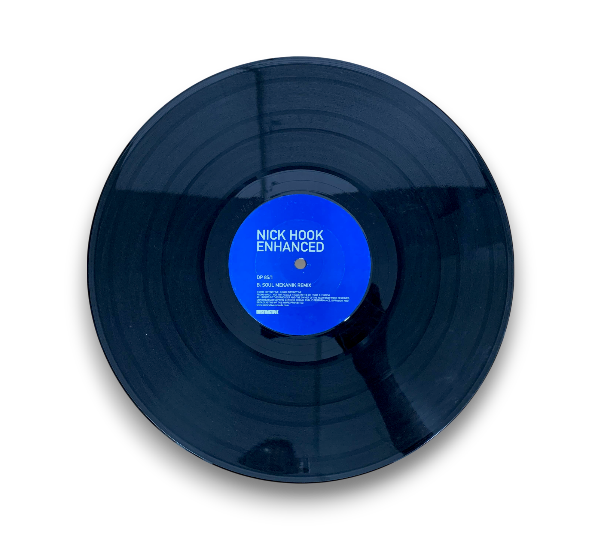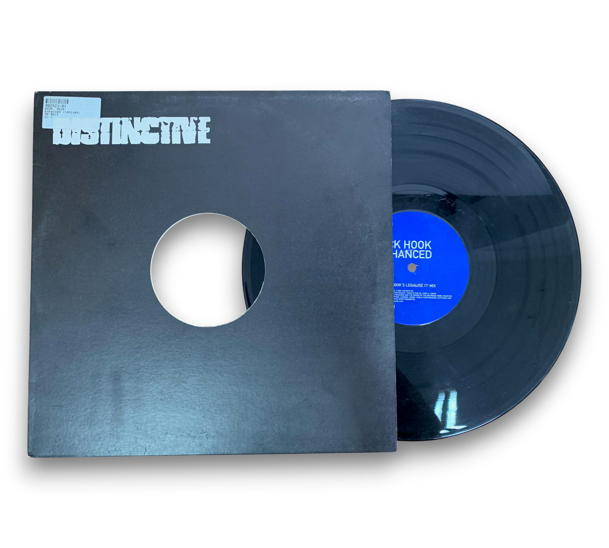 Promo only release from Distinct'ive, this record features tracks by Nick Hook, including "Legalise It Mix" and "Soul Mekanik Remix." The release is marked with ℗ 2001 Distinct'ive and is made in the UK. Some copies may include a sticker on the back with the catalog number 'DP85/1' and a barcode. For further details regarding the packaging and inserts, please refer to the accompanying photos.
