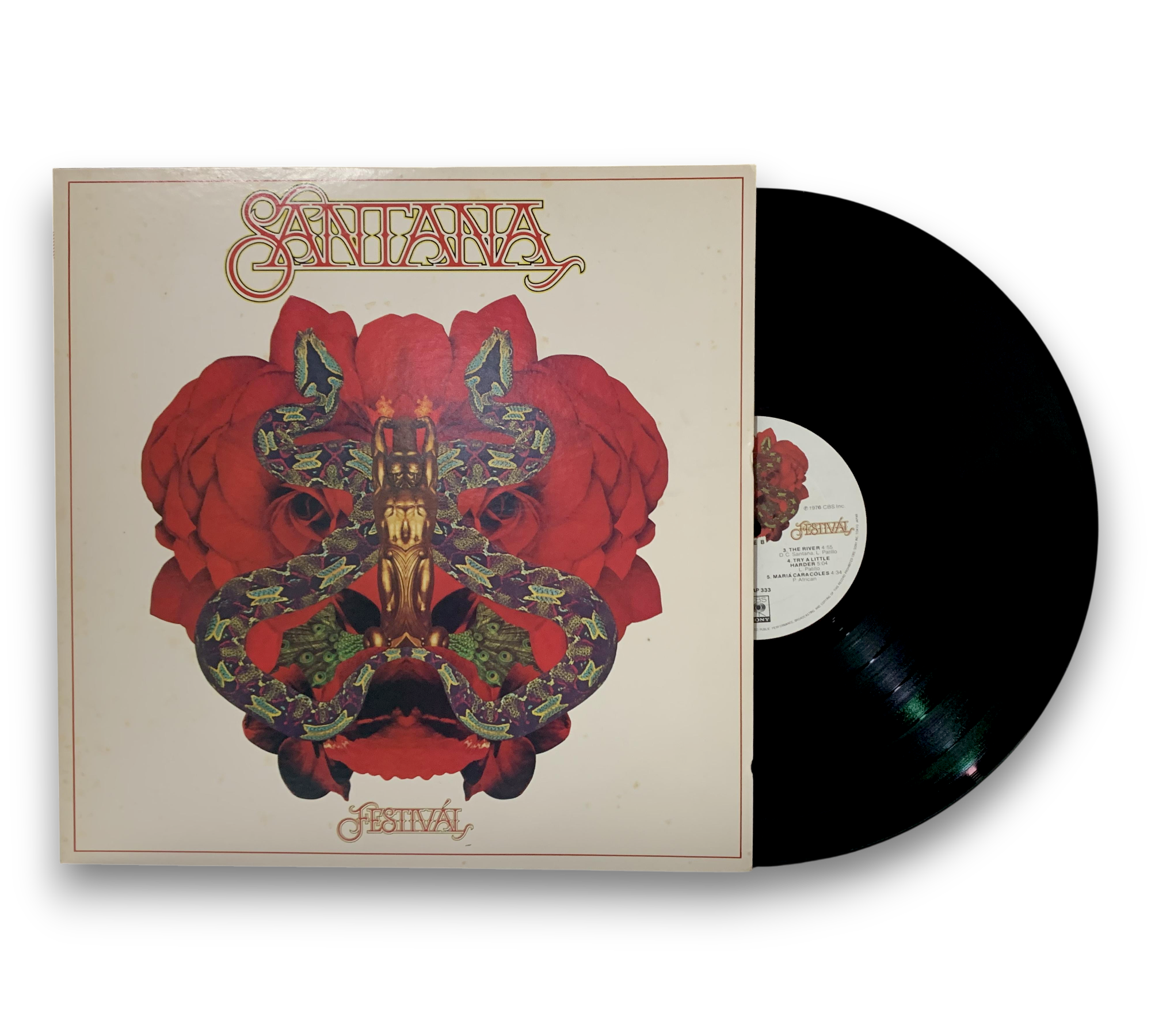 This listing features a record by Santana, complete with an obi and a four-page insert that includes liner notes in Japanese, English lyrics, photos, and a discography. The record is housed in a color inner sleeve. For further details regarding the packaging and inserts, please refer to the accompanying photos.