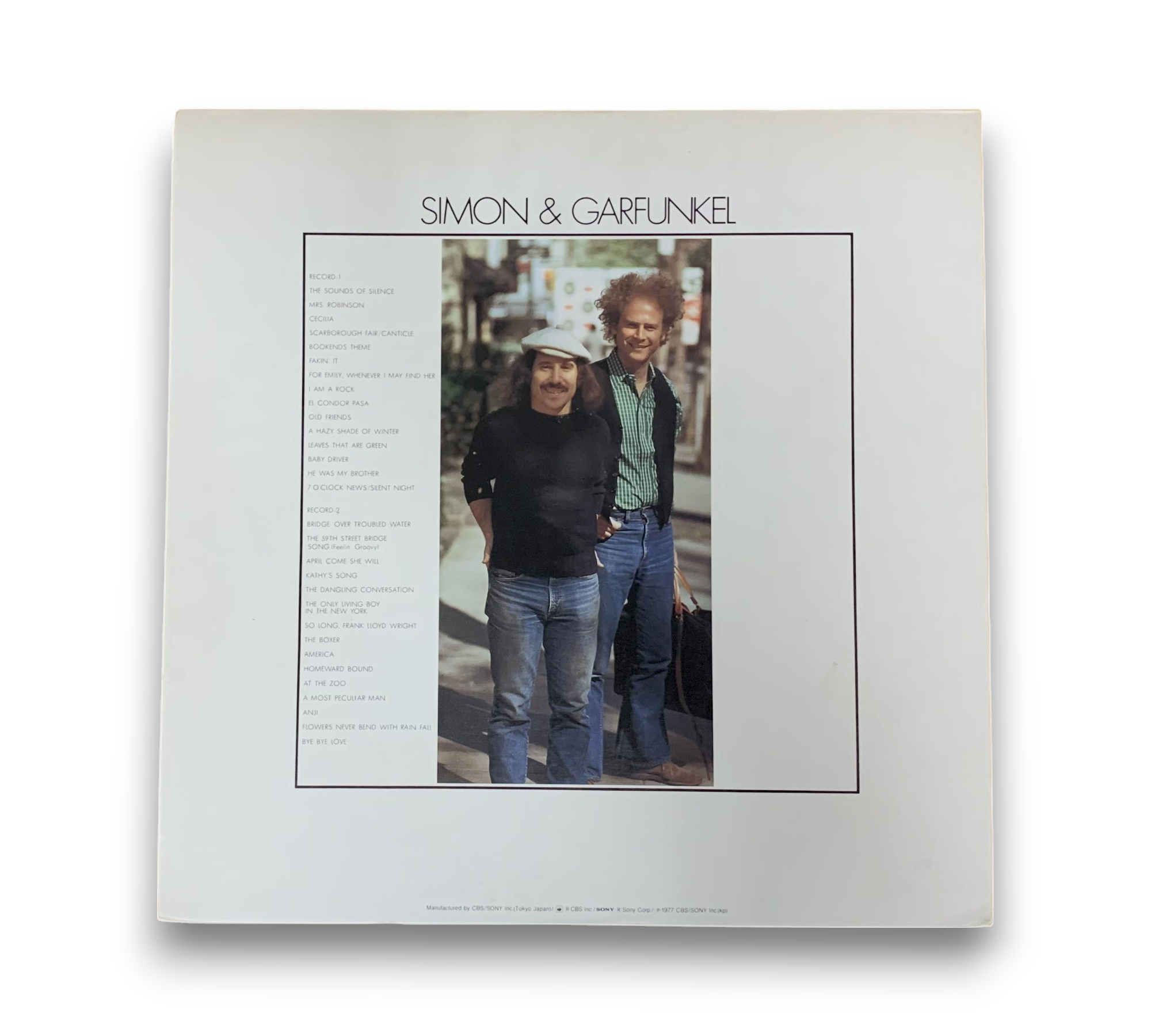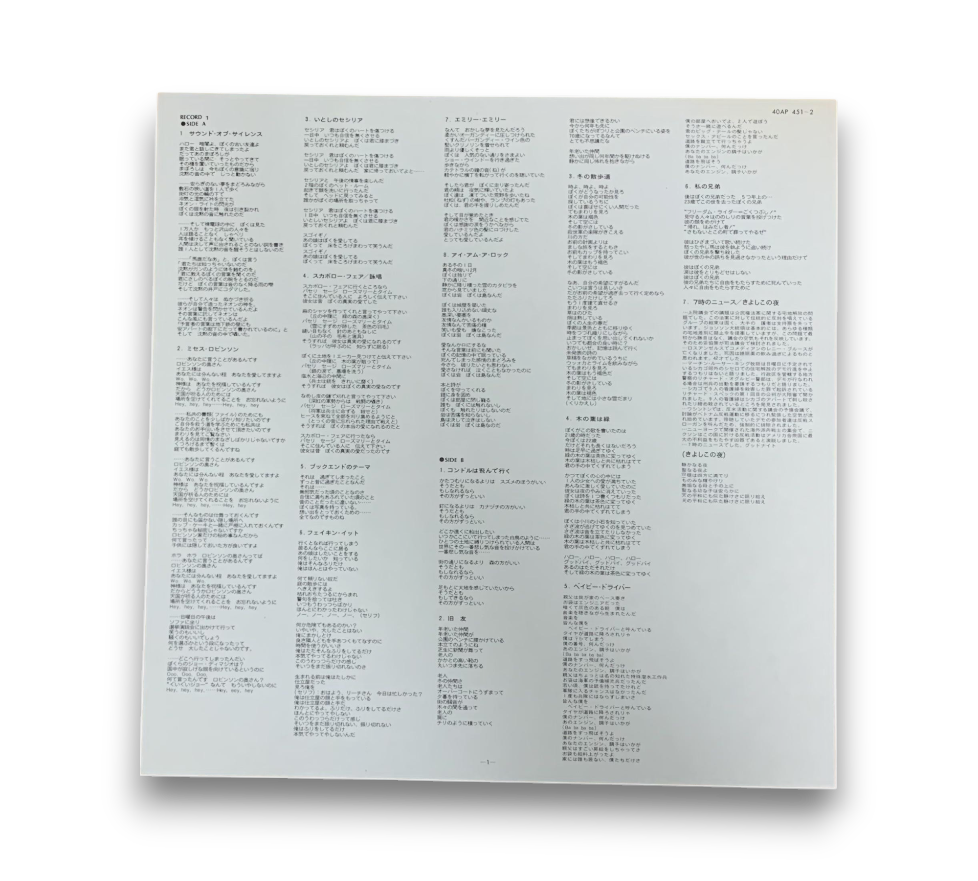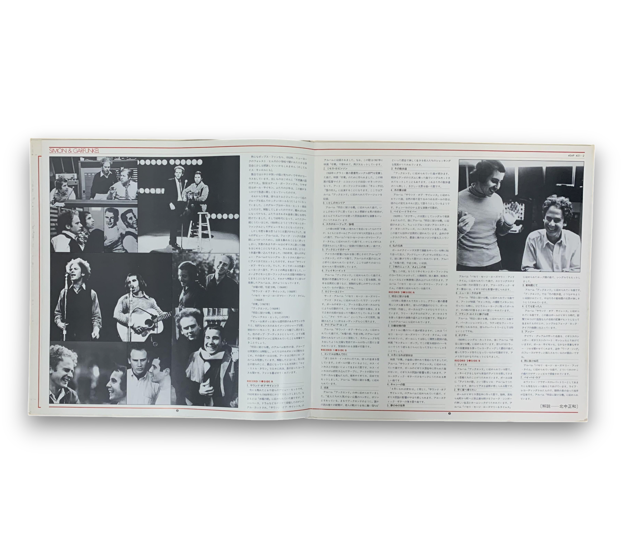 This listing features a gatefold record by Simon & Garfunkel, complete with an obi and a 4-page glued insert, which includes Japanese liner notes and English lyrics. Additionally, there is a 2-page insert containing Japanese lyrics. Please note that track titles have discrepancies: "The Only Living Boy In New York" is incorrectly labeled as "The Only Living Boy In The New York," and "Flowers Never Bend With The Rainfall" is misprinted as "Flowers Never Bend With Rainfall." The spine and labels display the artist's name as "Simon And Garfunkel," while the front and back covers use "Simon & Garfunkel." For further details regarding the packaging and inserts, please refer to the accompanying photos.
