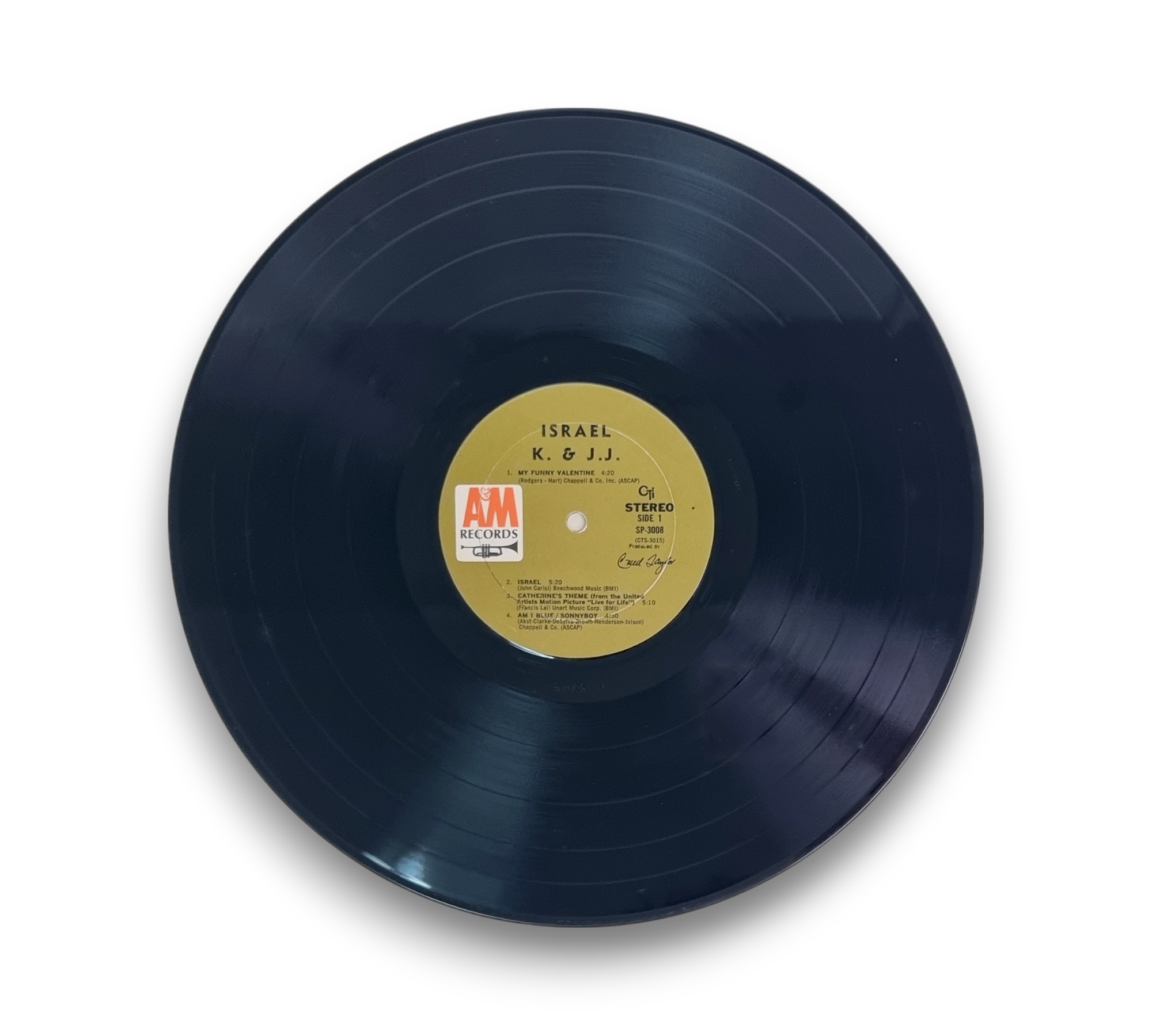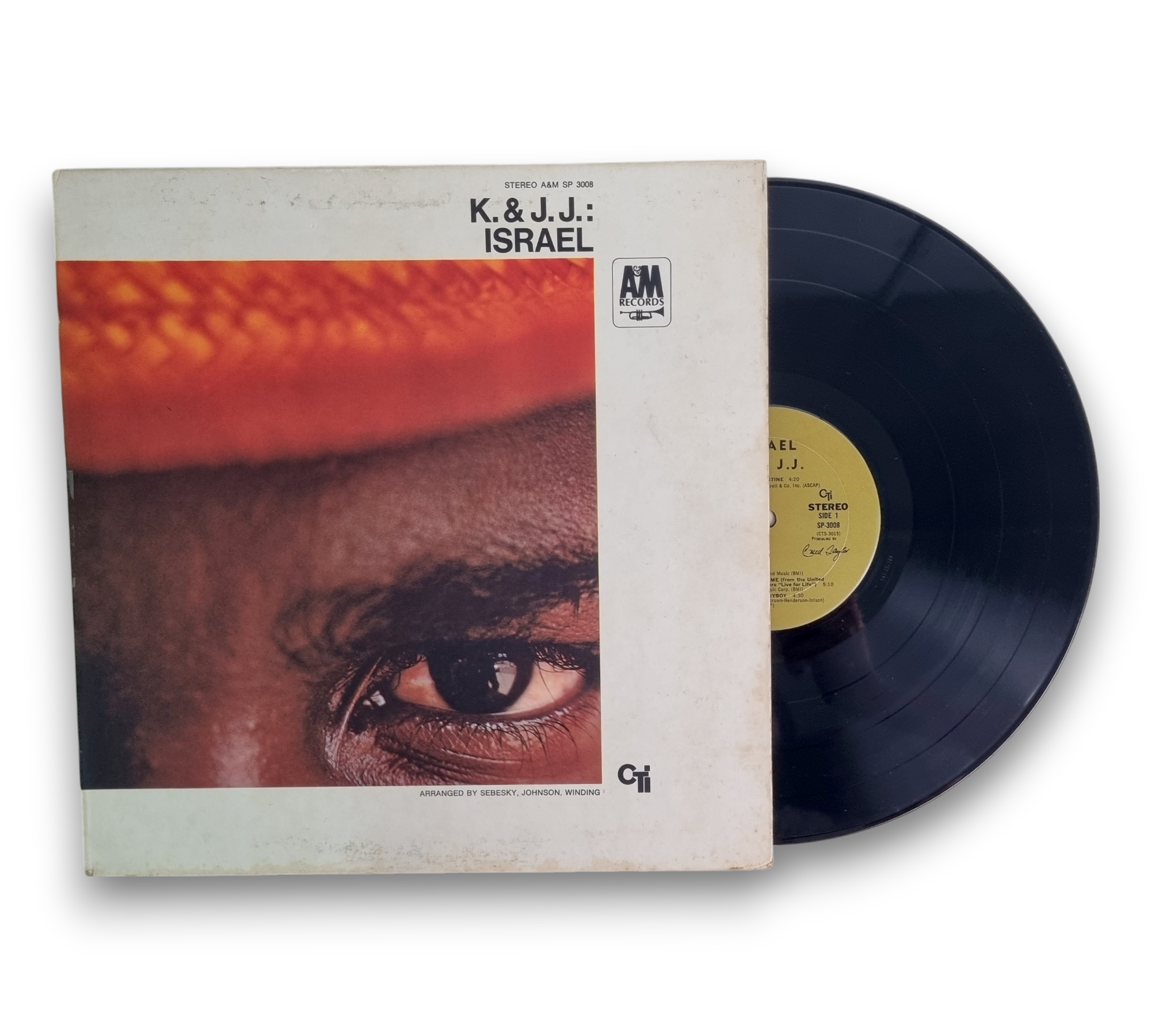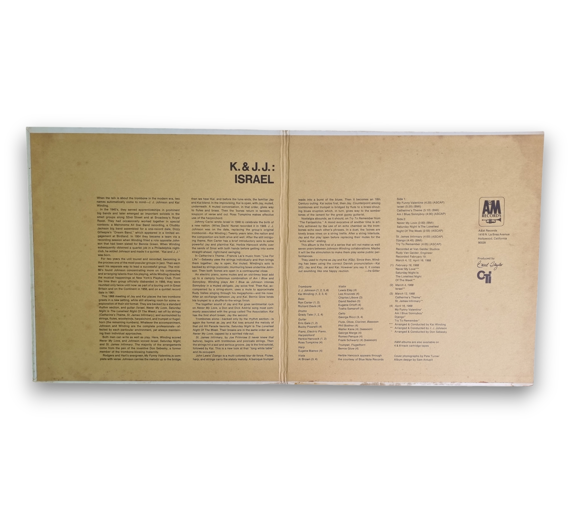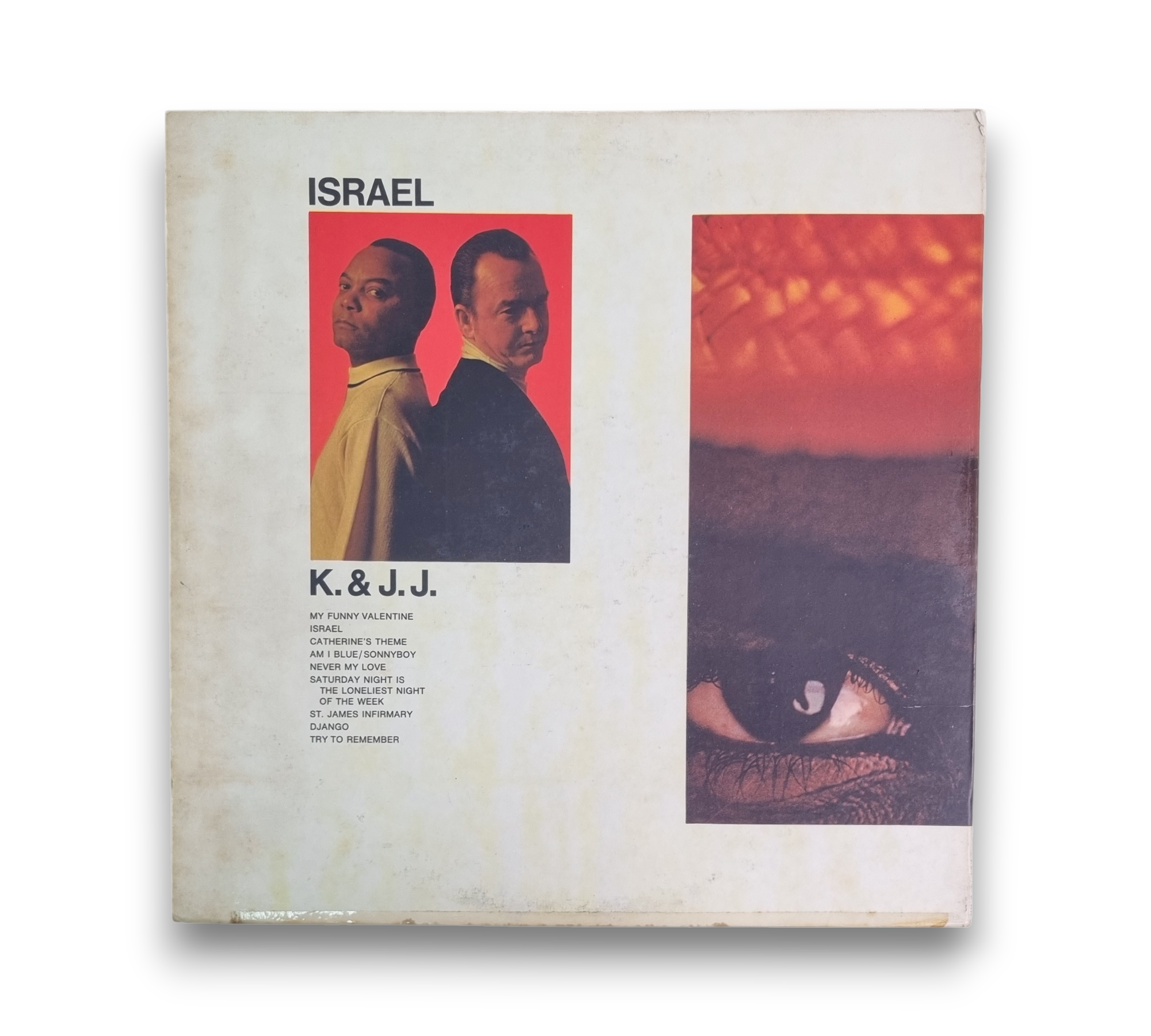 This record, titled "Israel" by K. & J. J., was recorded at Van Gelder Studios in 1968 and produced by Creed Taylor. The album features a variety of tracks, including "My Funny Valentine" and "Catherine's Theme." The listing includes a printed gatefold sleeve that provides information about the album and the artists. For further details regarding the condition and specific features of the packaging, please refer to the accompanying photos.
