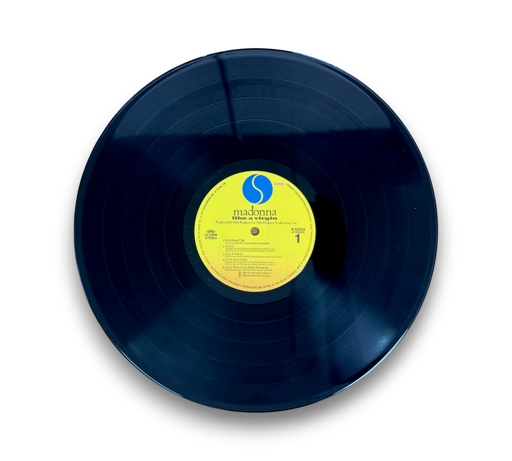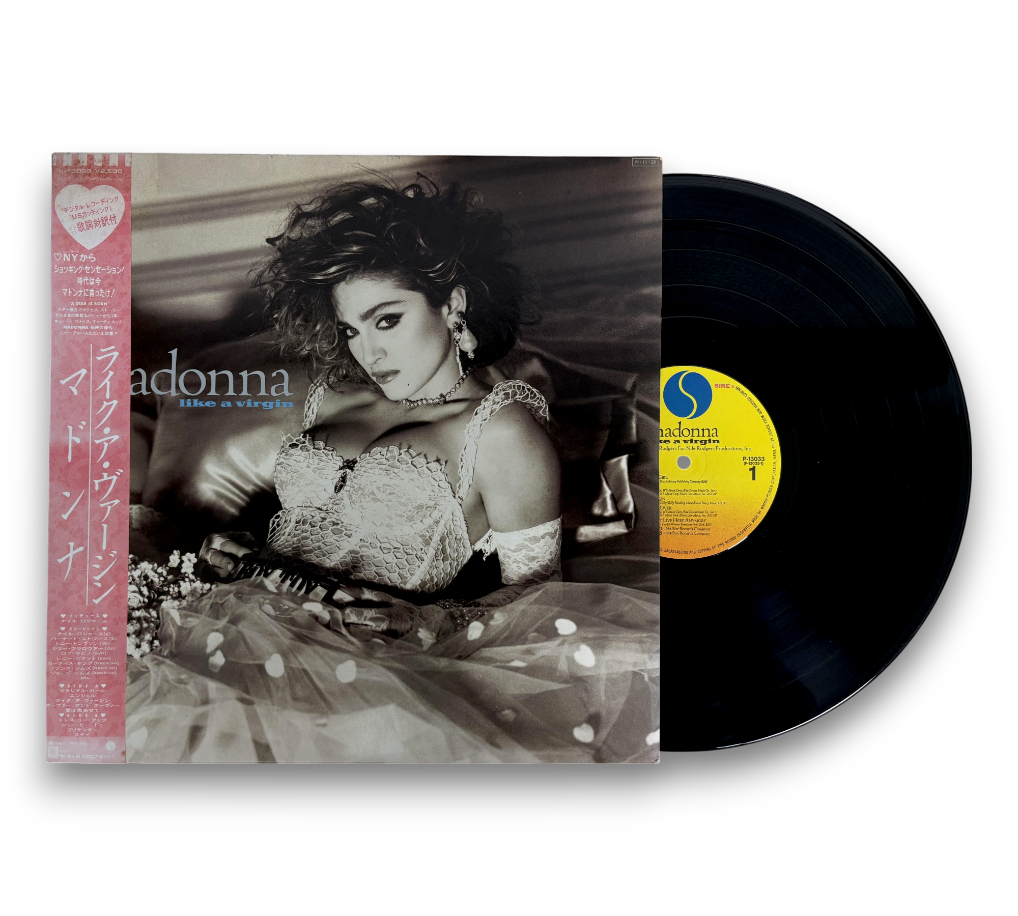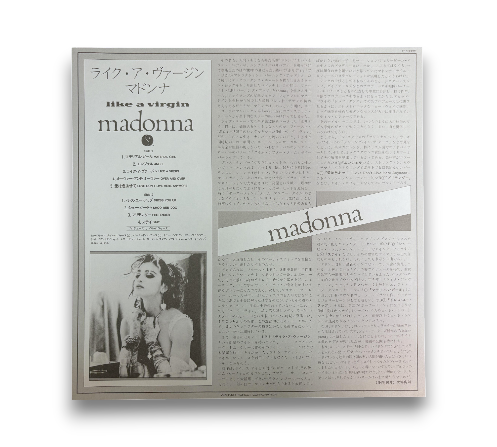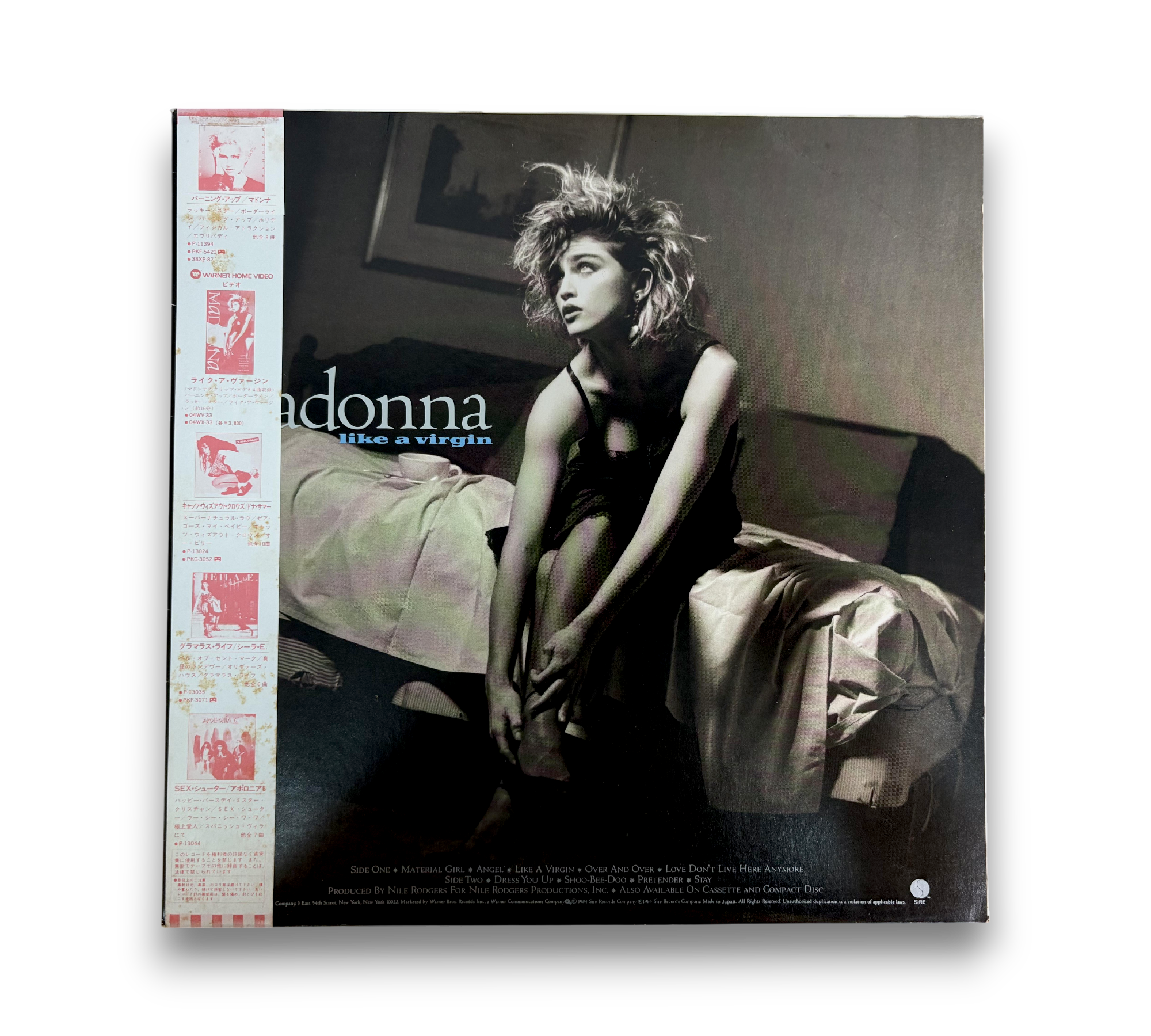 This release of Madonna's "Like a Virgin" is the second edition featuring a different Obi-strip, which includes "32XP-102" printed at the bottom. The record comes with two lyric/info inserts: one single-sided and another four-page insert, totaling five pages. The album was originally released in 1984 under Sire Records Company and produced by Warner-Pioneer Corporation in Japan. For further details regarding the packaging and inserts, please refer to the accompanying photos.