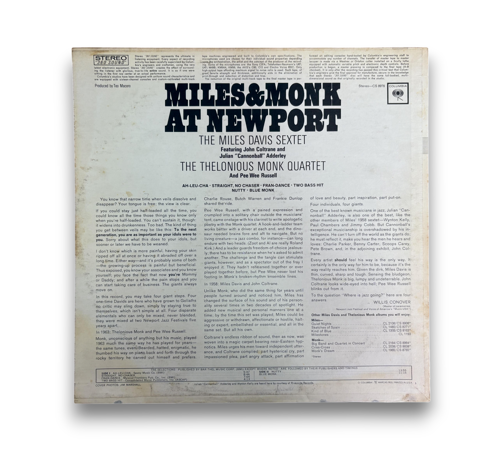 Experience the magic of live jazz with "Miles & Monk At Newport," featuring electrifying performances from the Miles Davis Sextet and Thelonious Monk Quartet at the renowned Newport Jazz Festival. Originally released in 1963, this late 1970s reissue captures the essence of hard bop and modal jazz with standout tracks like "Straight, No Chaser" and "Blue Monk." This vinyl edition, identifiable by its catalog number PC 8978, is a must-have for any jazz aficionado looking to relive a historic moment in music.