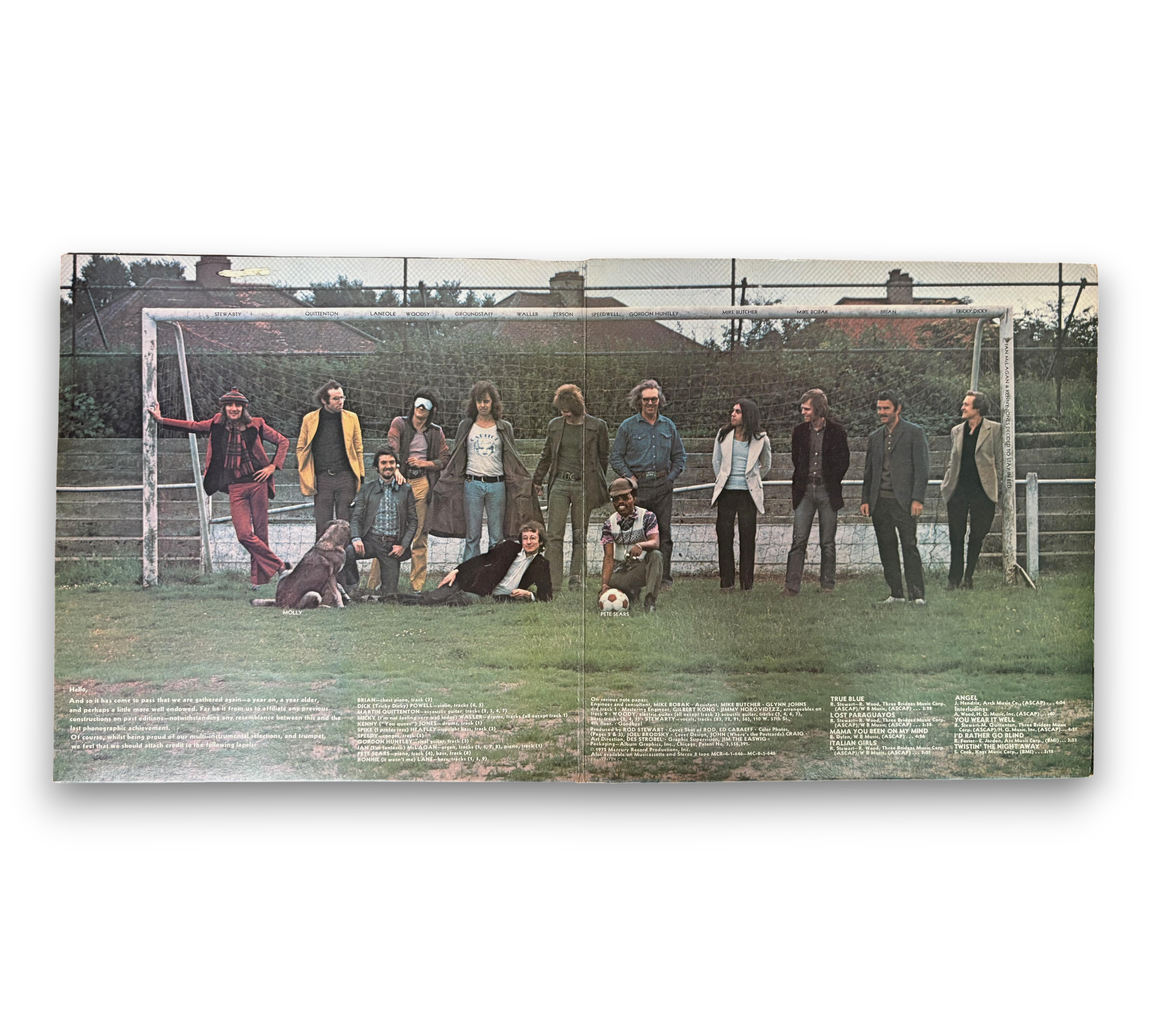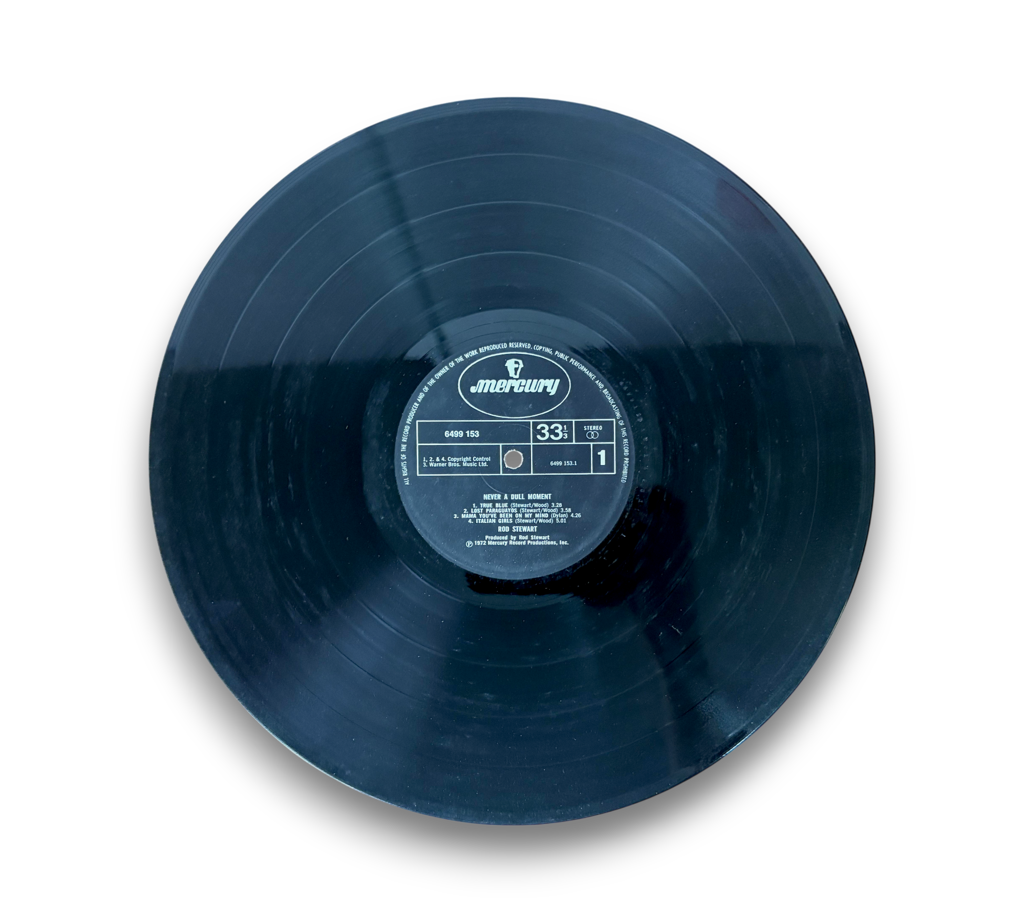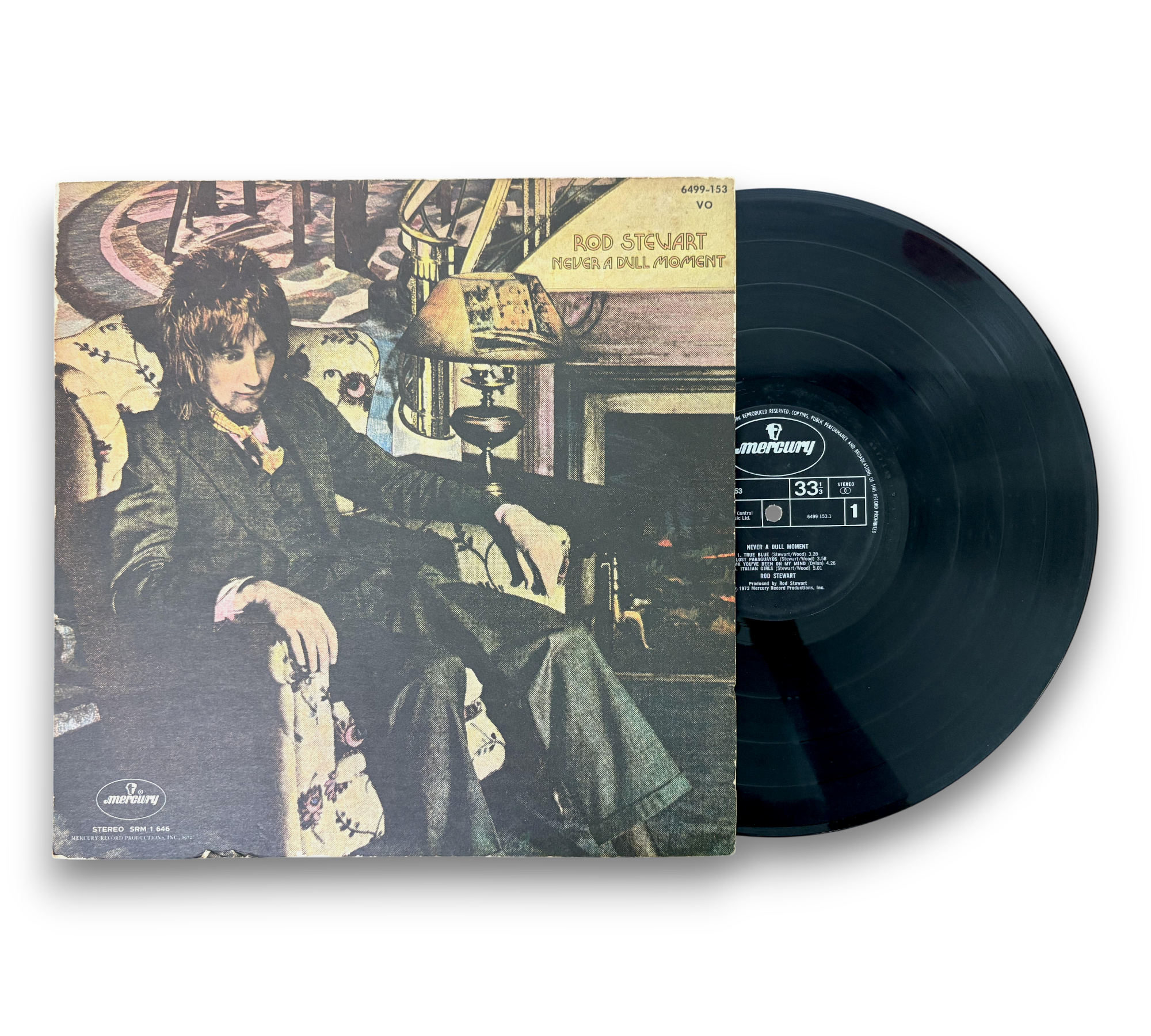 Original UK release of "Never a Dull Moment" by Rod Stewart, featuring a double gatefold sleeve. The Side A label displays publishing credits on two lines, while Side B has them on four lines. Notably, the writing credit for track B5 is listed as S. Cook on the cover and Cooke on the label. The record is produced by Mercury Record Productions, Inc. in 1972. For detailed visuals of the packaging and inserts, please refer to the accompanying photos.