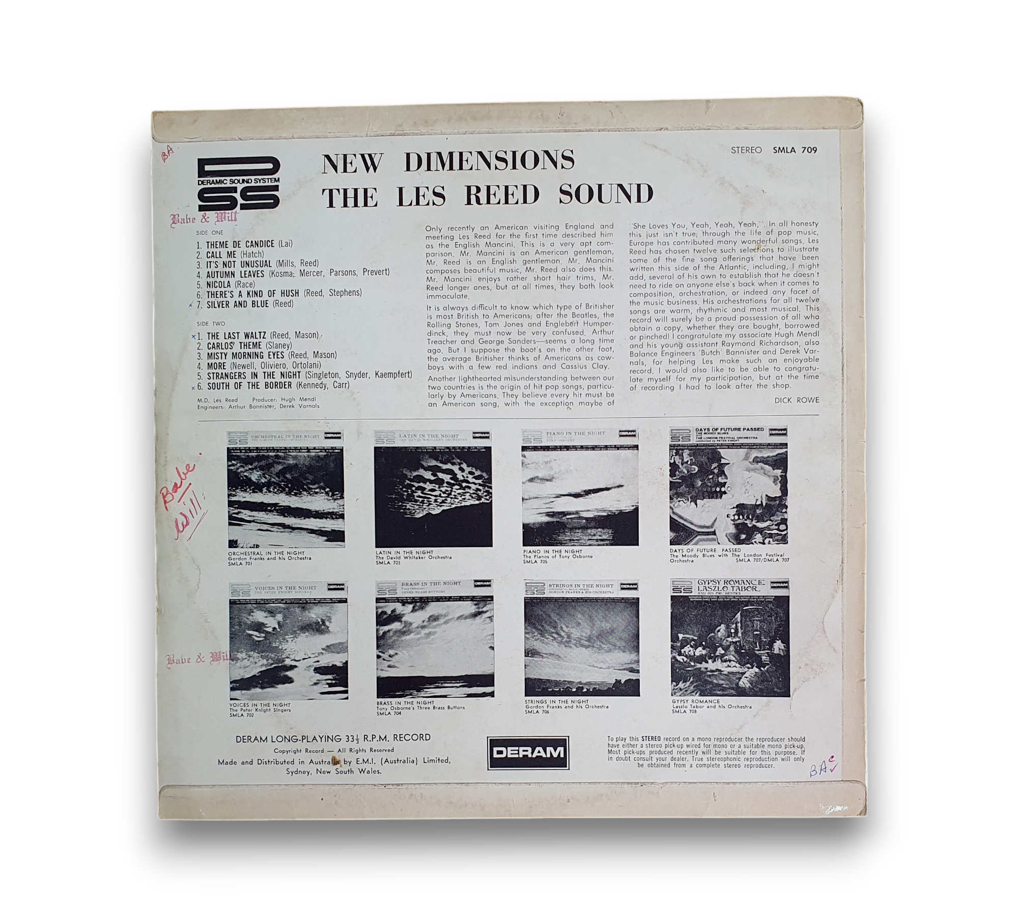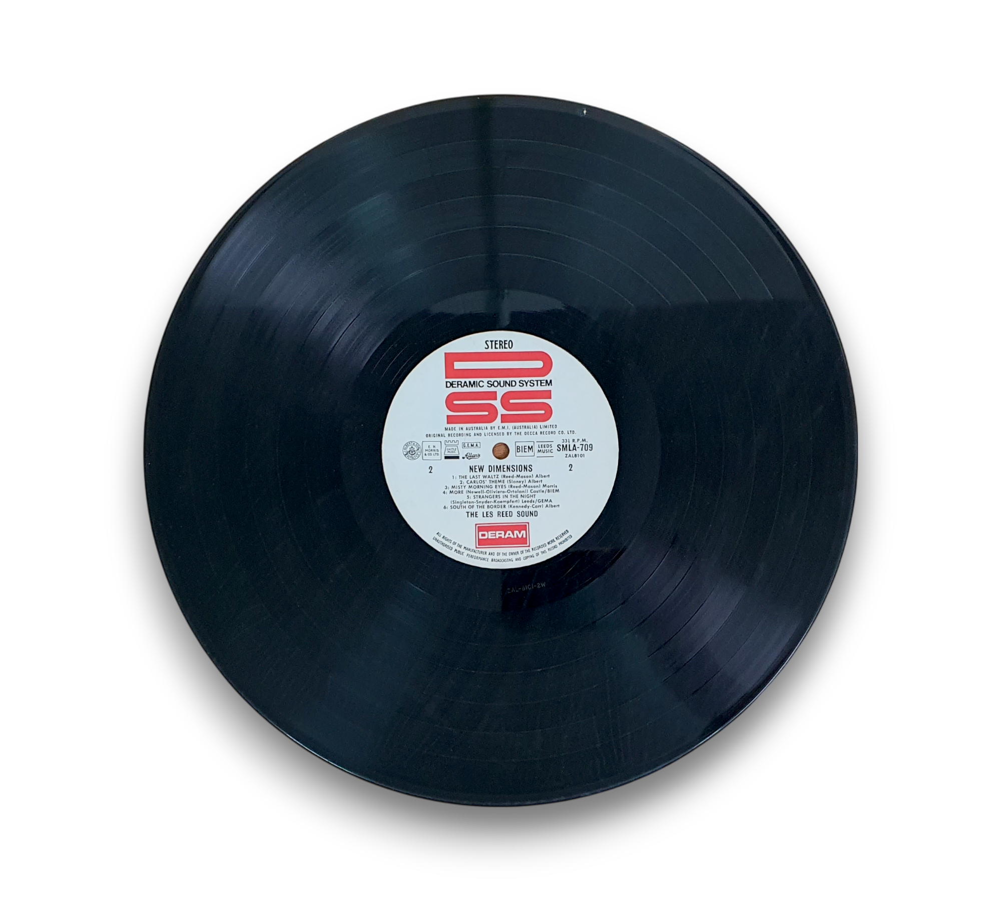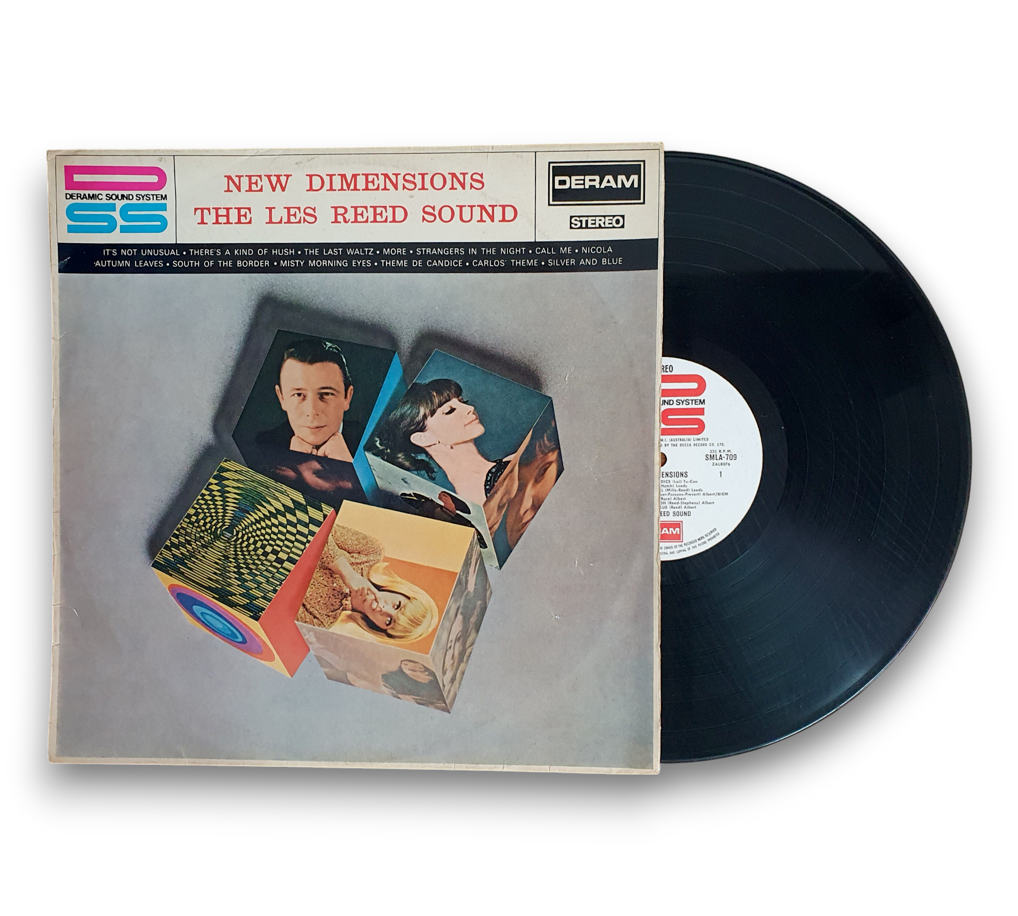 This listing features "New Dimensions" by The Les Reed Sound, released under the Decca Record Company in 1968. The cover is laminated on the front only, showcasing a vibrant design with a mix of images and colors. The record itself is pressed on white labels adorned with a red 'DSS' logo. The catalog number appears as SMLA 709 on the cover and as SML 709 on the label. For further details regarding the condition and specifics of the packaging, please refer to the accompanying photos.