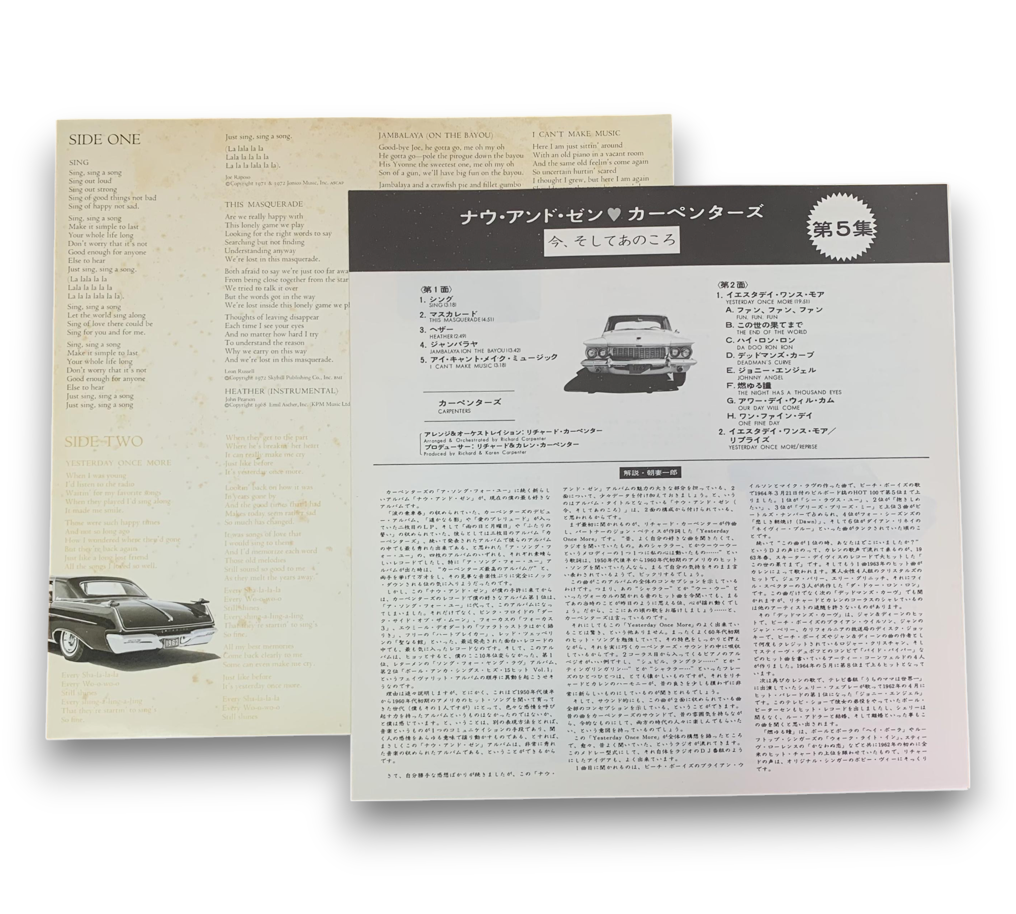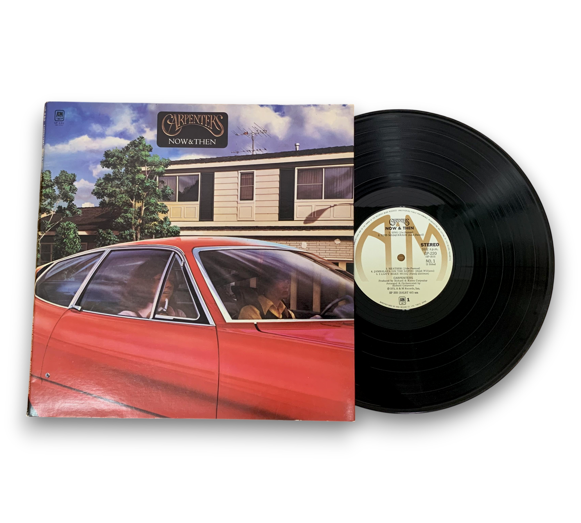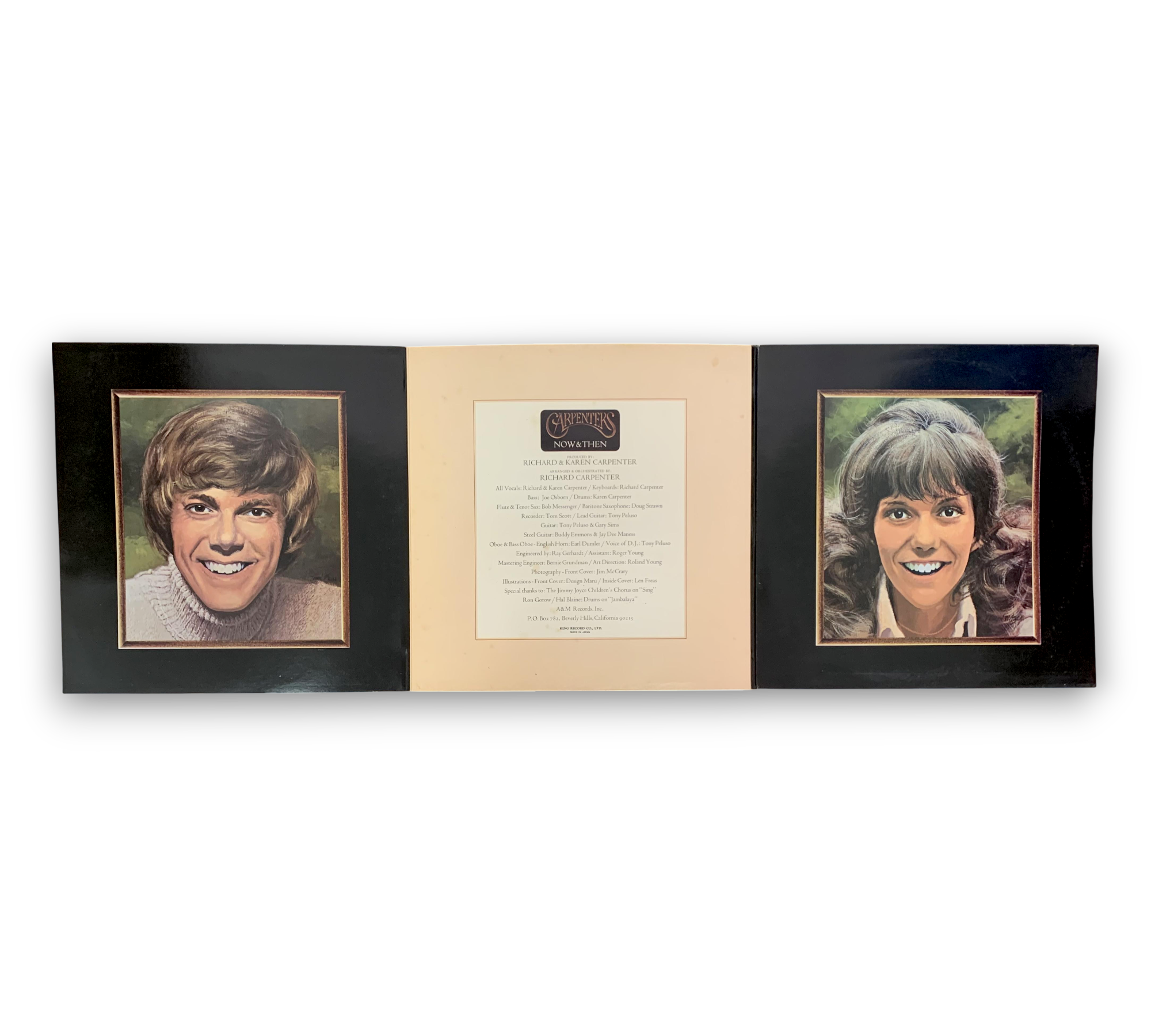 This listing features the album "Now & Then" by The Carpenters, presented in a foldout sleeve with a printed inner sleeve. The record showcases light brown A&M labels. Notably, the inner paper sleeve displays the inscription "Printed in U.S.A." beneath "Printed in Japan." For further details regarding the condition and specifics of the packaging, please refer to the accompanying photos.