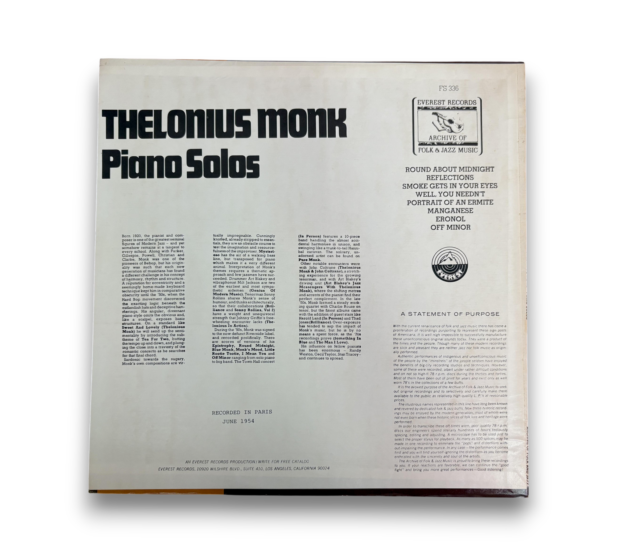 Recorded in Paris in June 1954, "Piano Solos" by Thelonious Monk showcases the artist's unique style and improvisational skills. The album features a selection of tracks, including "Round About Midnight," "Reflections," and "Smoke Gets in Your Eyes," among others. The cover art and label design reflect the era's aesthetic, adding to the album's appeal for collectors and jazz enthusiasts alike. For further details regarding the packaging and inserts, please refer to the accompanying photos.