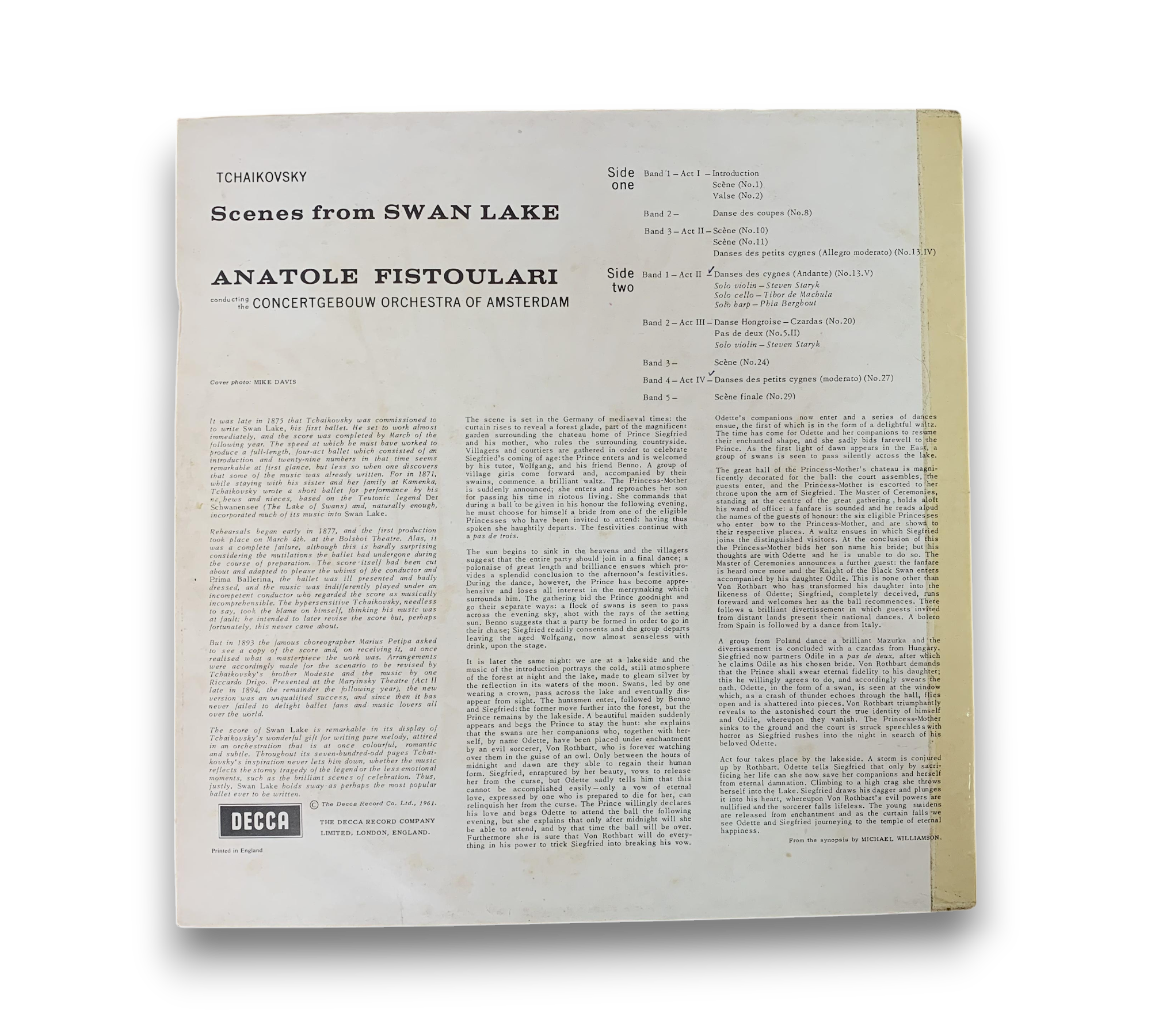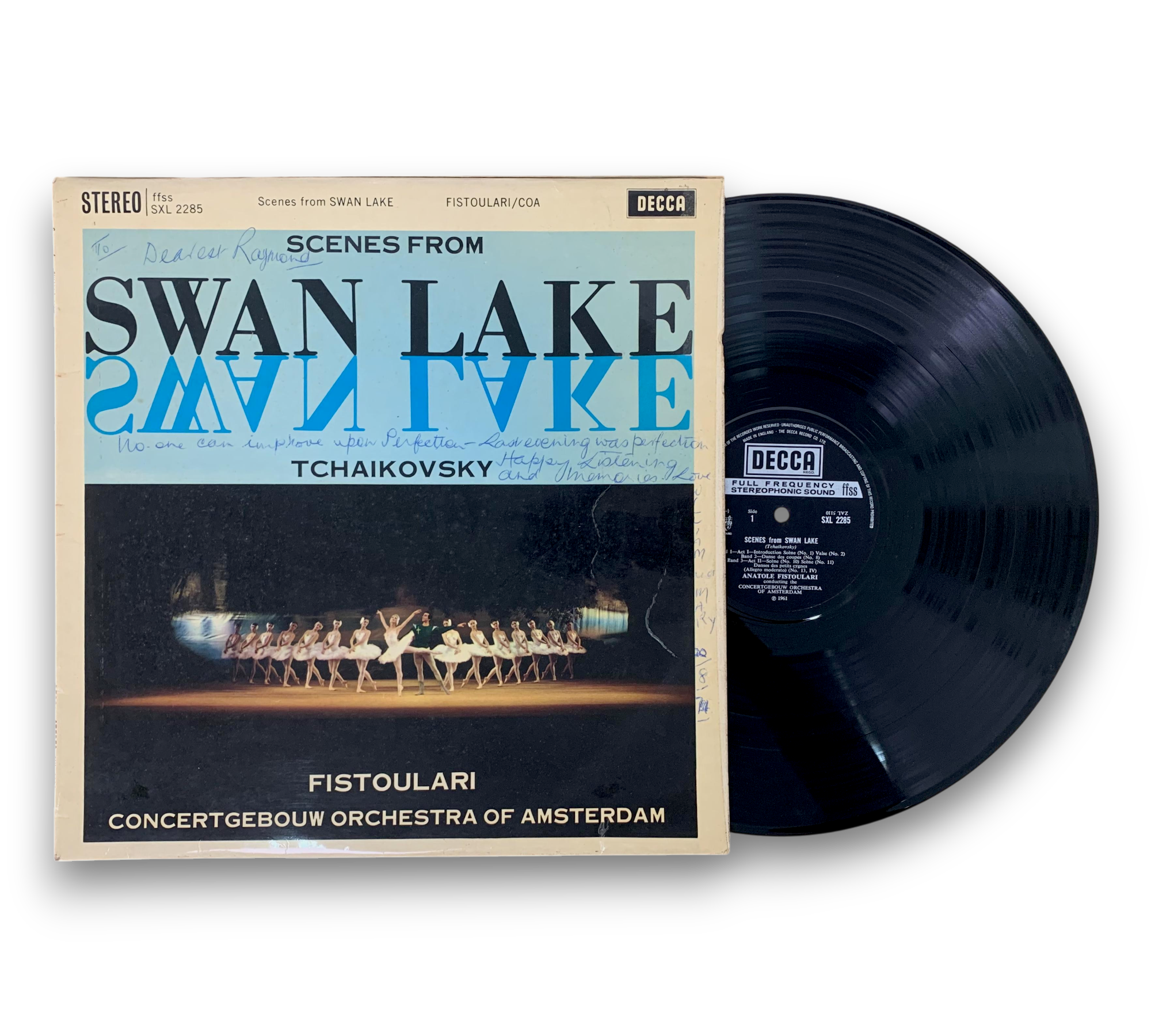 Experience the enchanting melodies of Tchaikovsky's "Scenes from Swan Lake," conducted by Anatole Fistoulari with the renowned Concertgebouw Orchestra of Amsterdam. This vinyl record, pressed on a narrow band, features a captivating selection of pieces from the beloved ballet, showcasing the Romantic style that has made Tchaikovsky a timeless composer. Please note that the cover shows some signs of wear, and detailed notes about the composition can be found on the back. For further details regarding the condition, please refer to the accompanying photos.