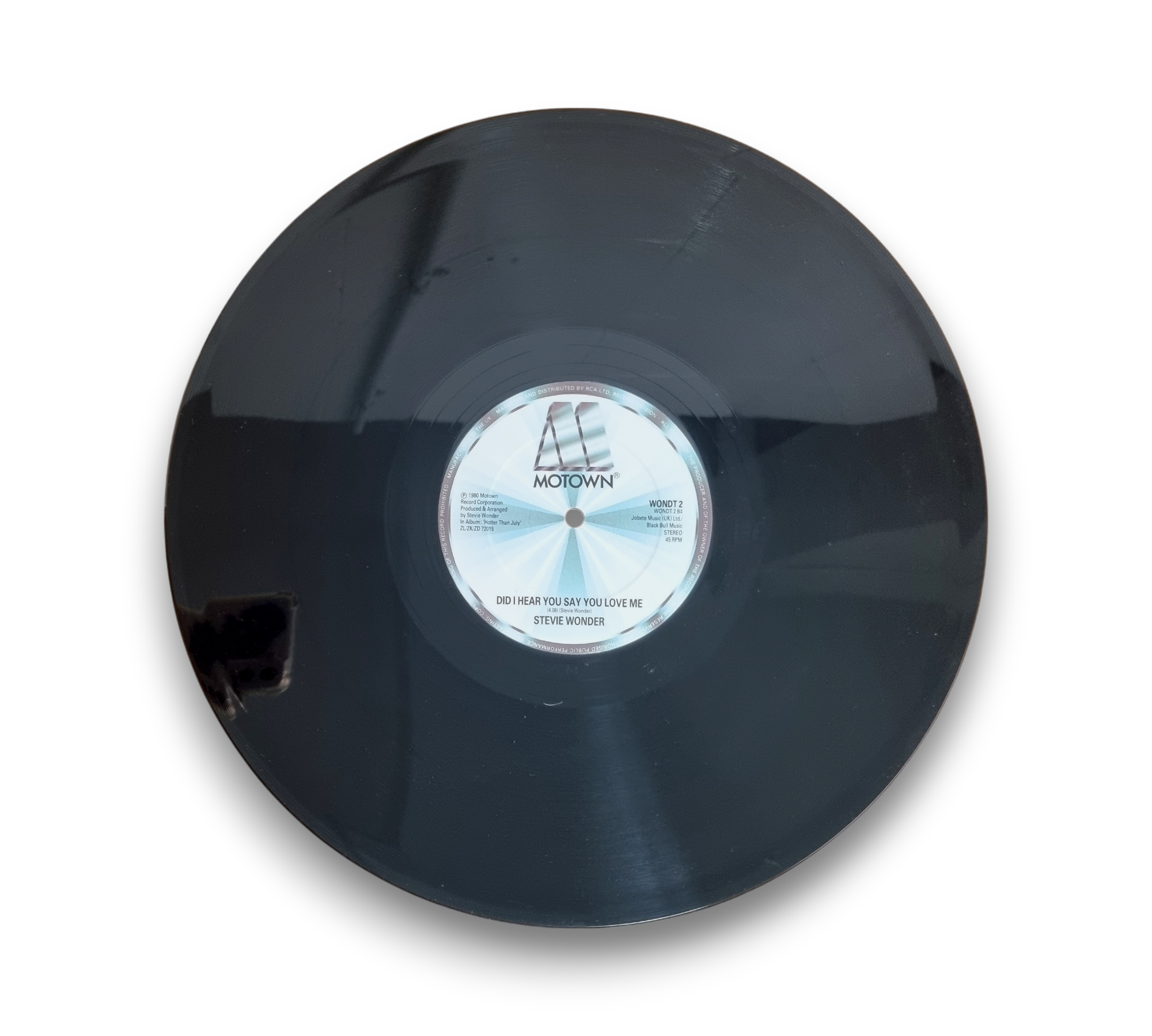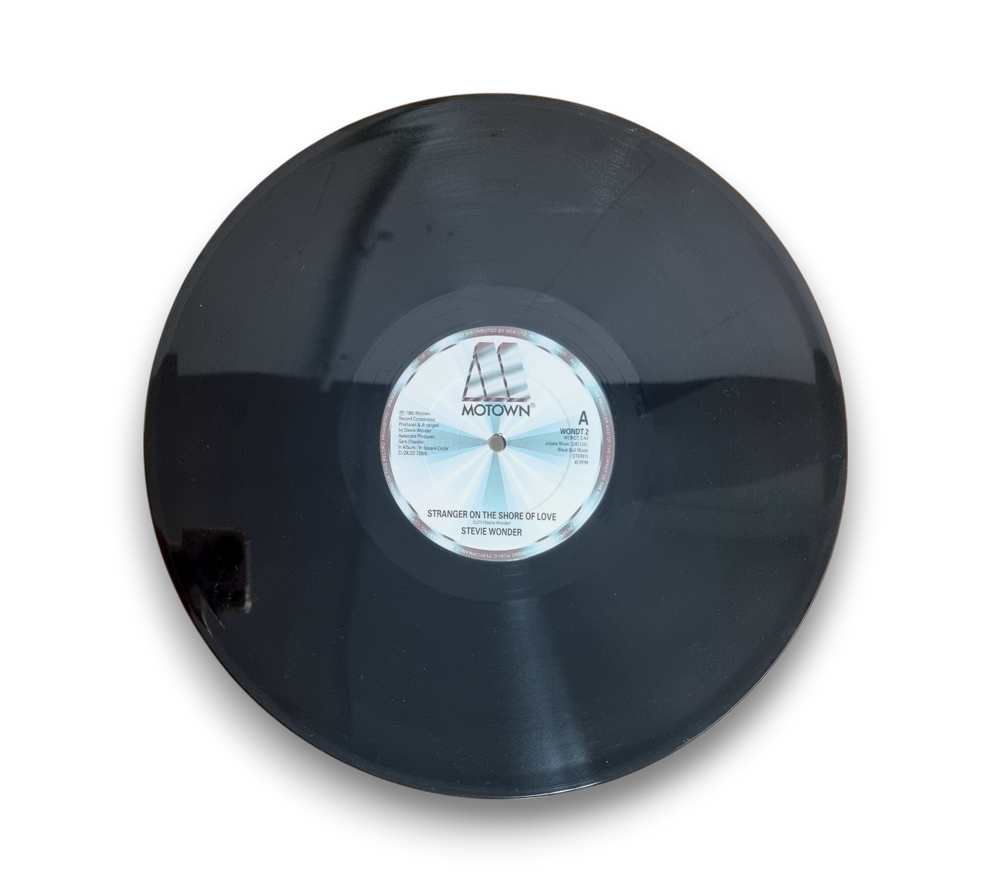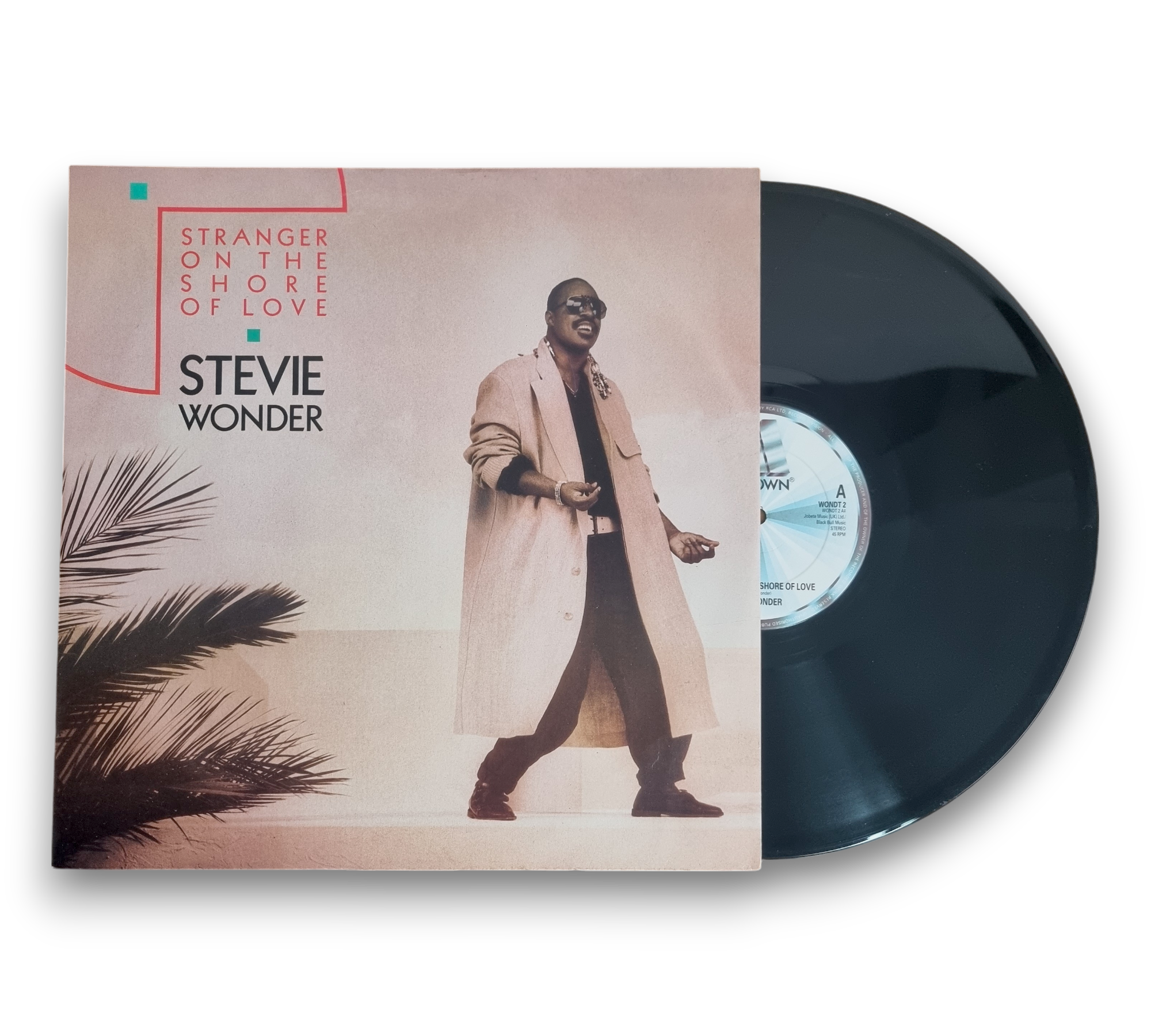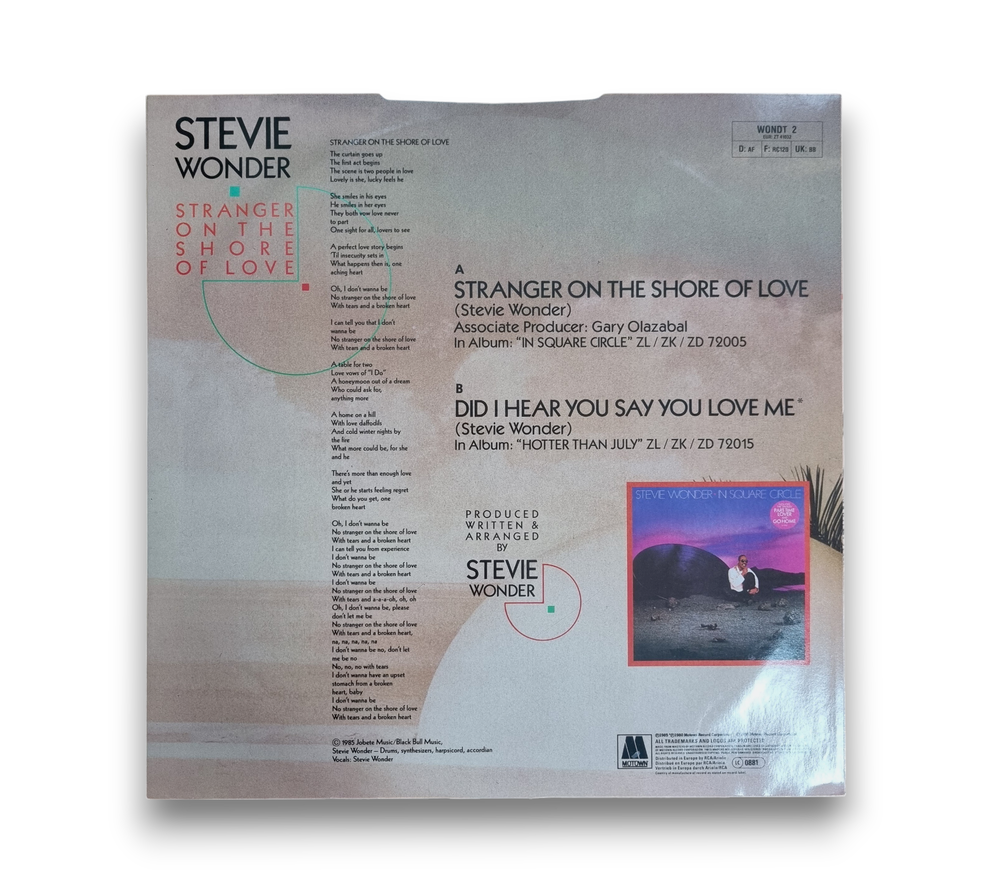This listing features the single "Stranger on the Shore of Love" by Stevie Wonder, which includes the tracks "Stranger on the Shore of Love" from the album *In A Square Circle* and "Did I Hear You Say You Love Me" from *Hotter Than July*. The record is manufactured in the UK and is identified by the catalog number WOND 2. For further details regarding the condition and packaging, please refer to the accompanying photos.