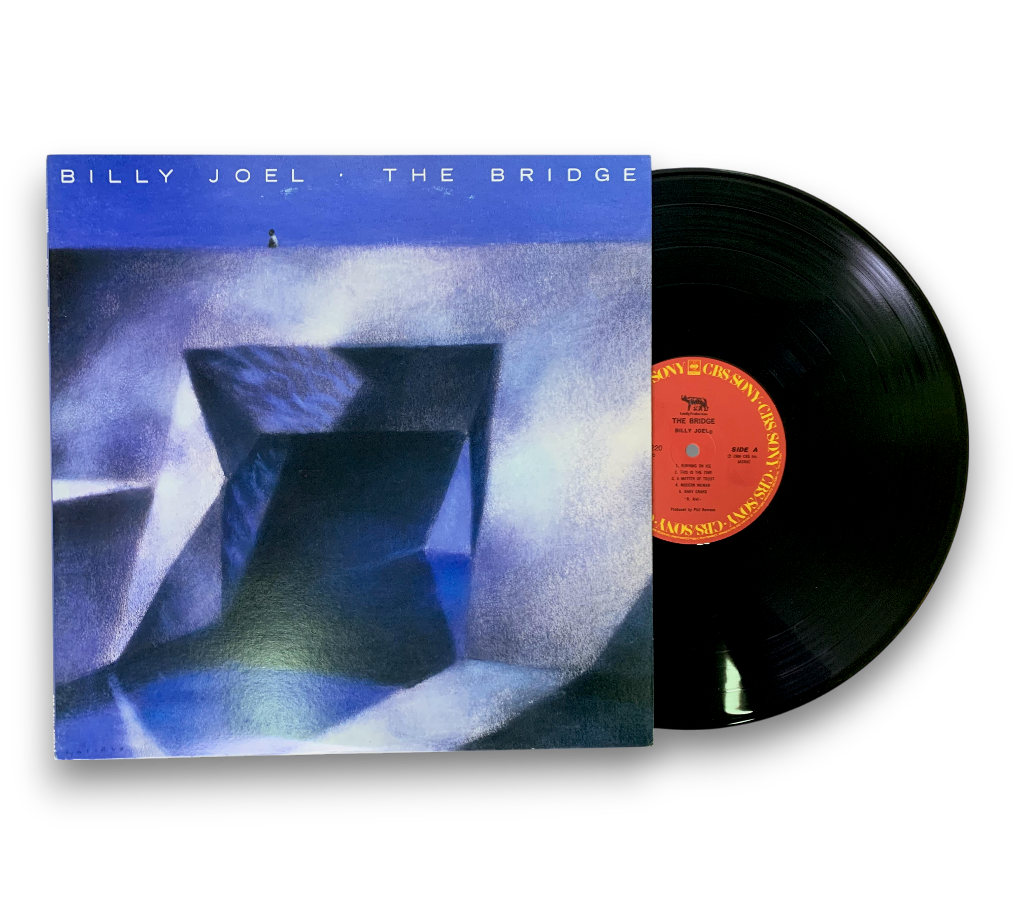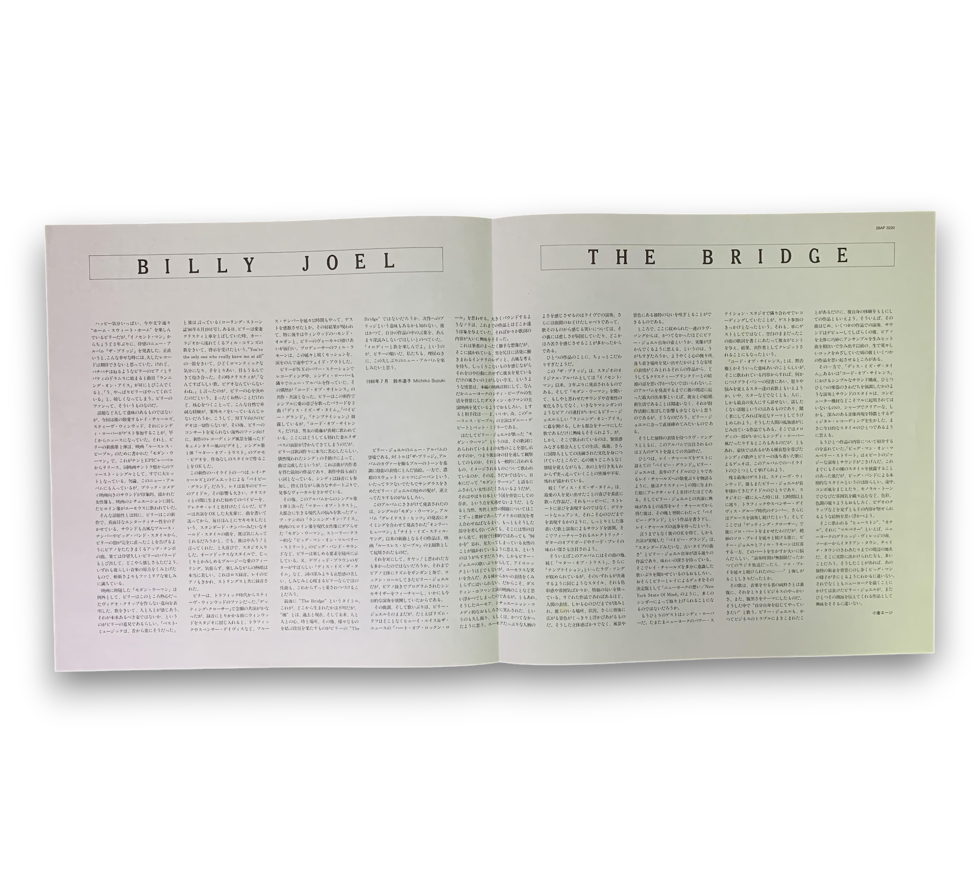 This record features a full-color lyric insert along with an additional black-and-white Japanese essay insert. The album, titled "The Bridge" by Billy Joel, showcases a blend of musical styles and thoughtful lyrics. For a closer look at the packaging and inserts, please refer to the accompanying photos.
