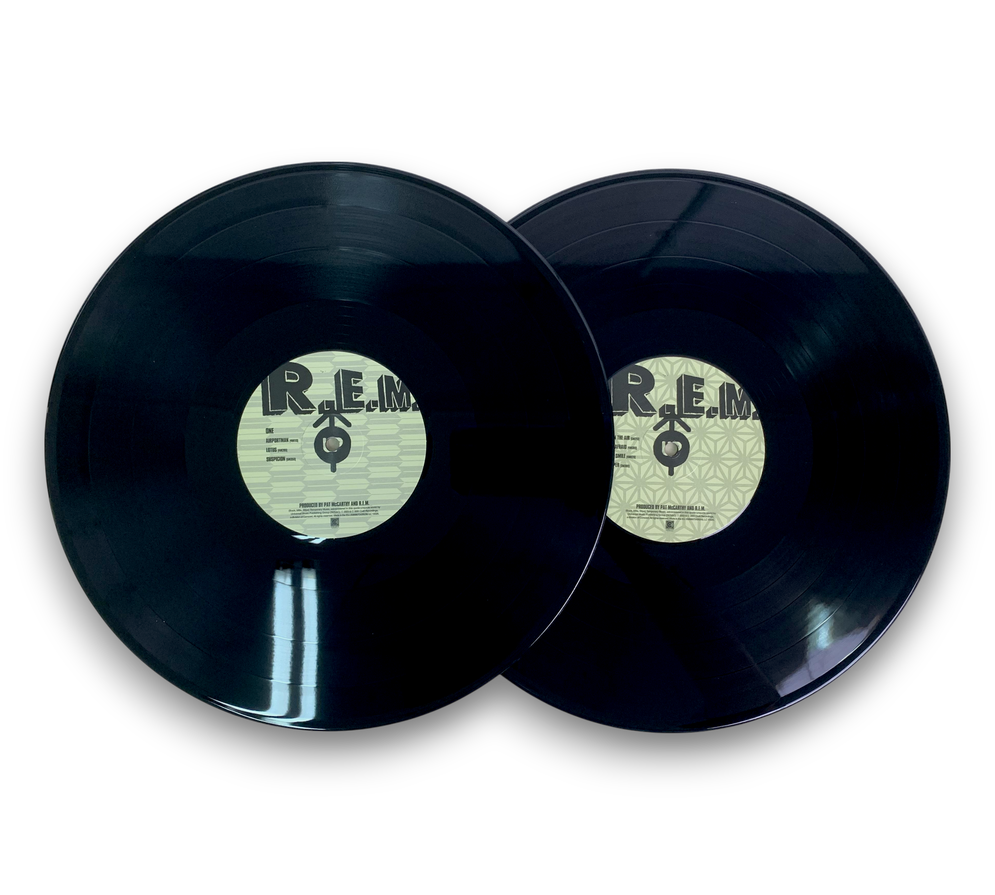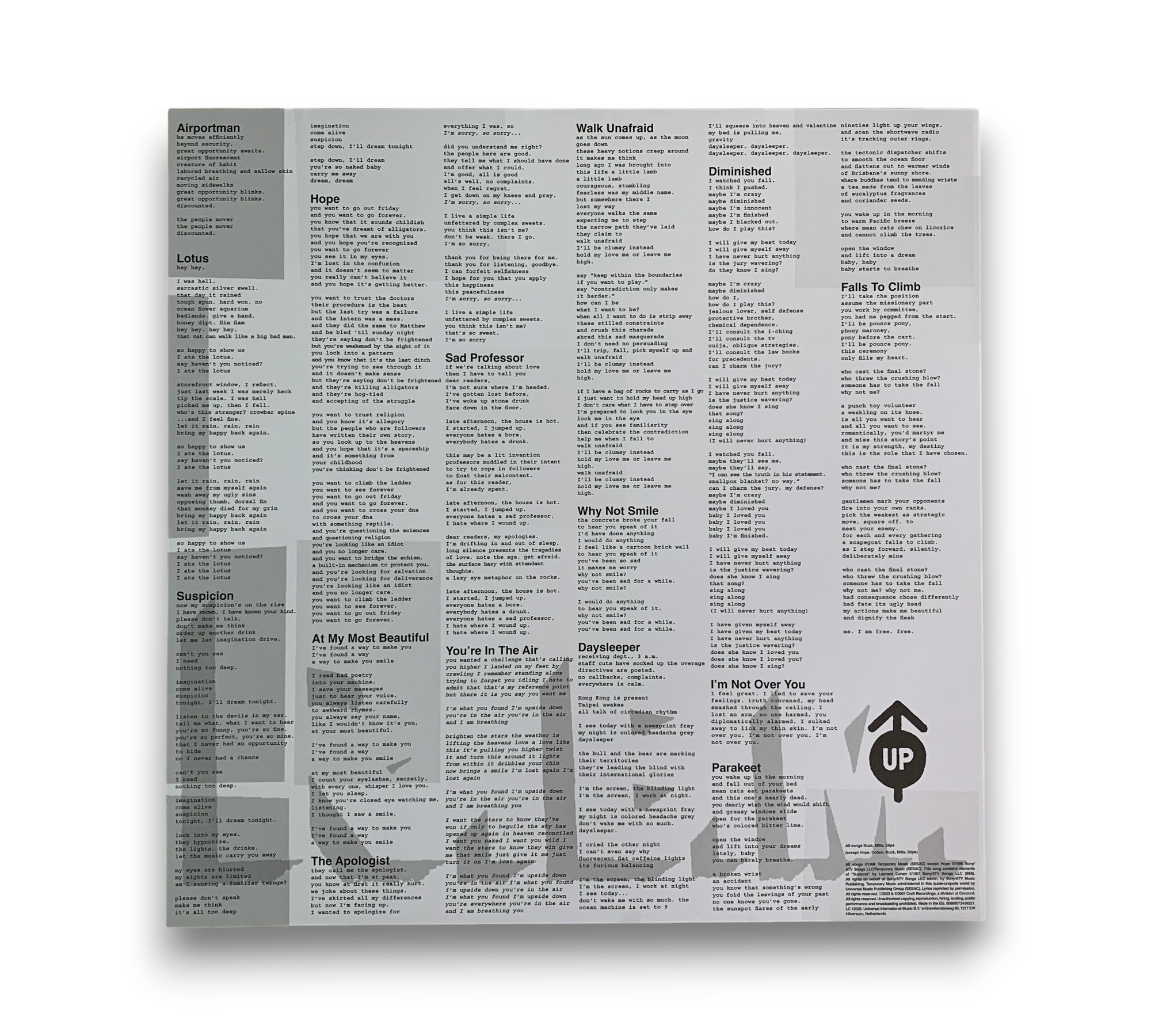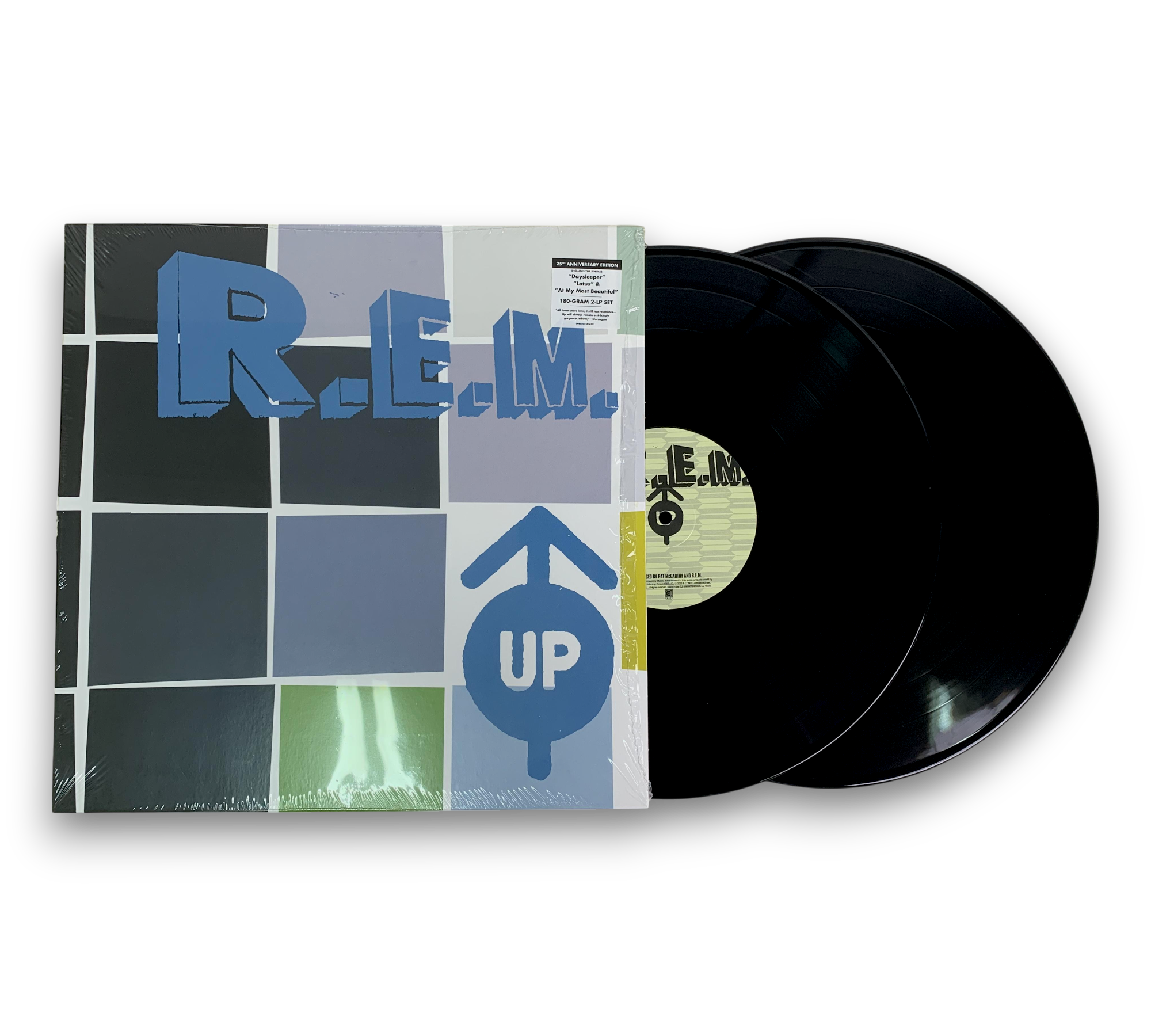 This 25th Anniversary Edition of R.E.M.'s album "Up" is presented as a 180-gram 2-LP set, featuring the singles "Daysleeper," "Lotus," and "At My Most Beautiful." The album includes an insert with lyrics and credits, and the end of track D1 features the short song "I'm Not Over You," which is noted only on the insert. The packaging is marked with a "Made in Czech Republic" sticker on the shrink wrap. For further details regarding the condition and contents, please refer to the accompanying photos.