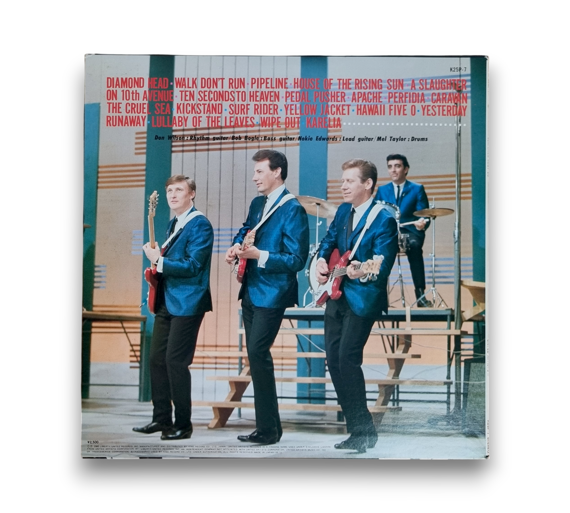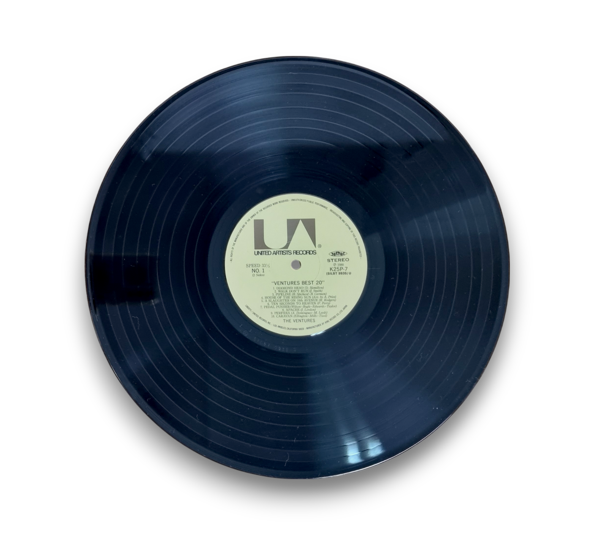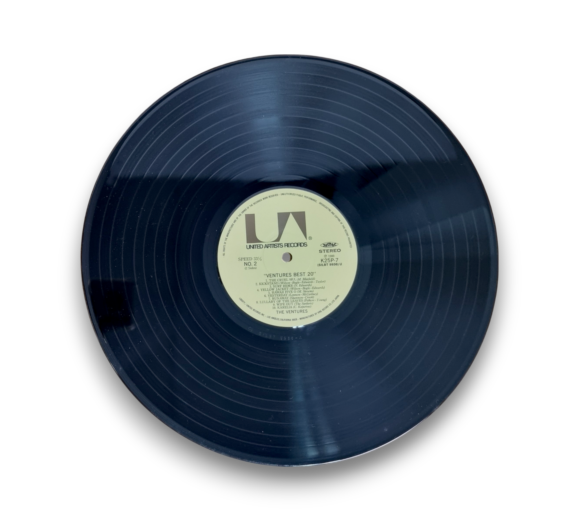This listing features "The Ventures! Best 20," a compilation album by The Ventures, originally released in 1980 under Liberty/United Records, Inc. The record showcases a collection of their most popular tracks, highlighting the band's signature surf rock sound. The album is manufactured and distributed by King Record Co., Ltd. in Japan, and it is presented in a stereo format. For specific details regarding the packaging and inserts, please refer to the accompanying photos.