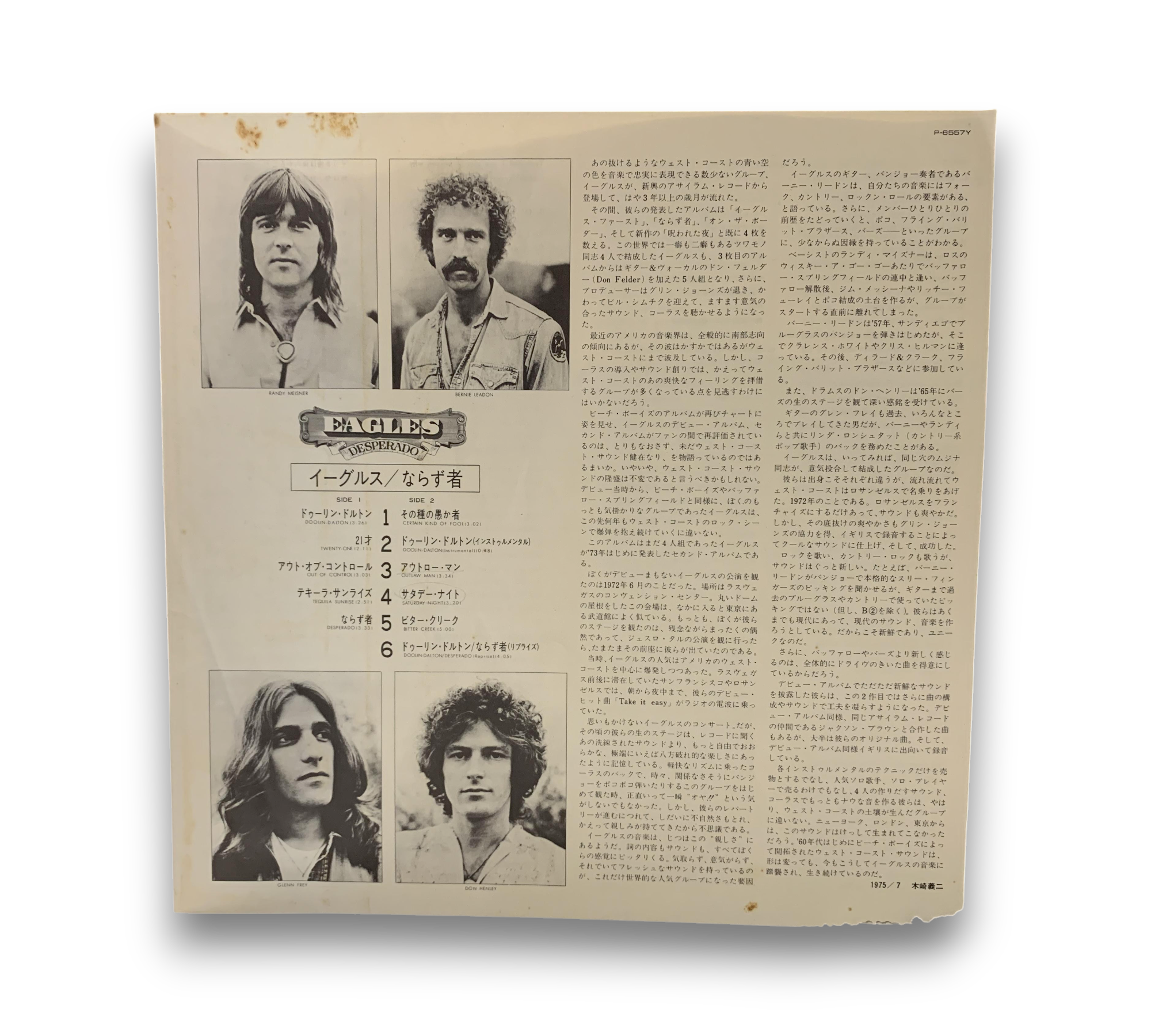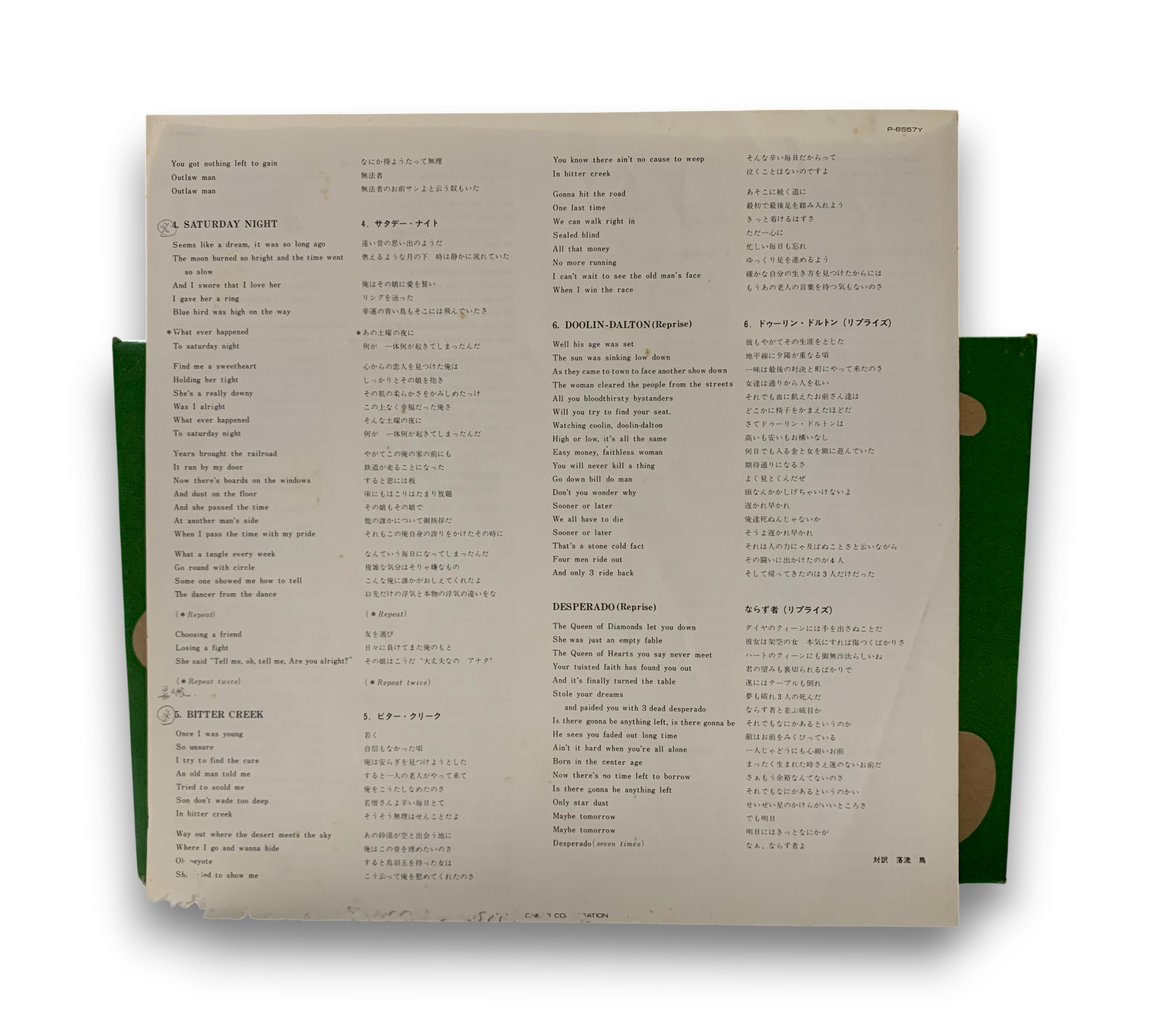 This listing features the 1973 release of "Desperado" by the Eagles, issued by Asylum Records. The record is presented in a textured sleeve, printed in Japan, and includes a black and white four-panel lyric insert featuring both Japanese and English text. The images provided showcase the album's cover and back, as well as the lyric insert. For further details regarding the condition and specific features of the packaging, please refer to the accompanying photos.