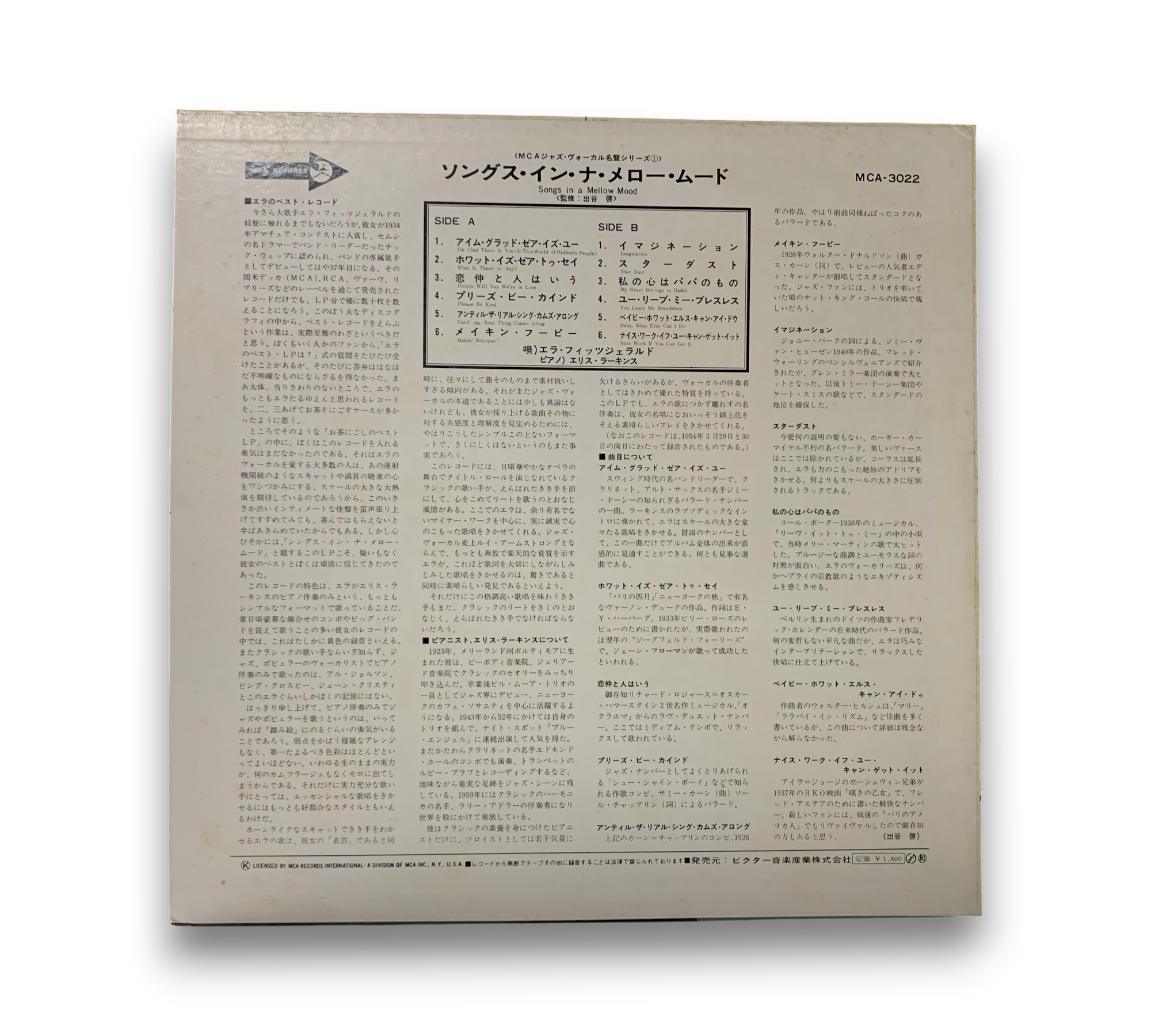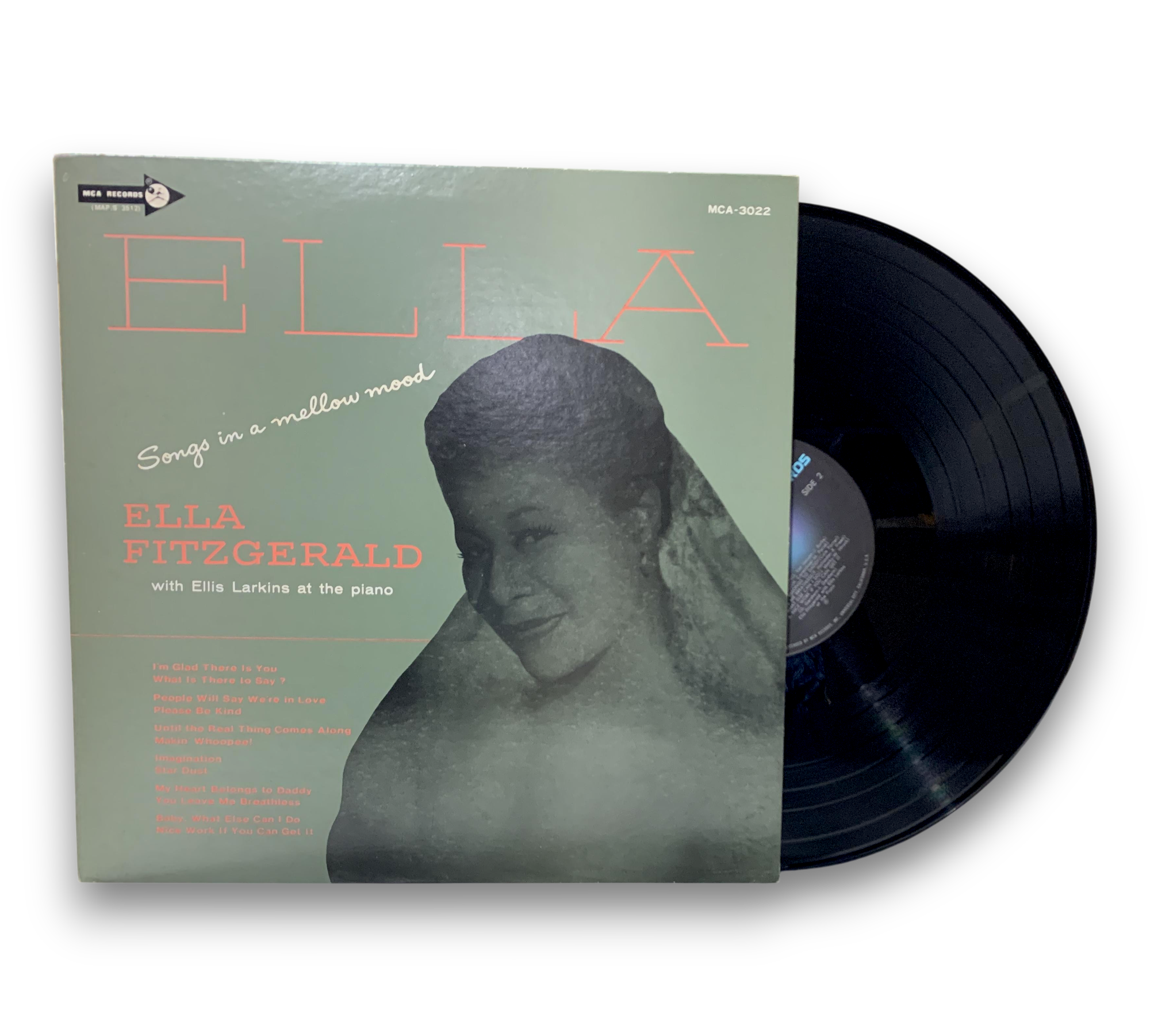 This listing features "Songs in a Mellow Mood" by Ella Fitzgerald, accompanied by Ellis Larkins on piano. The record is pressed on black rainbow MCA labels and includes a lyric insert. For further details regarding the condition and specific packaging elements, please refer to the accompanying photos.