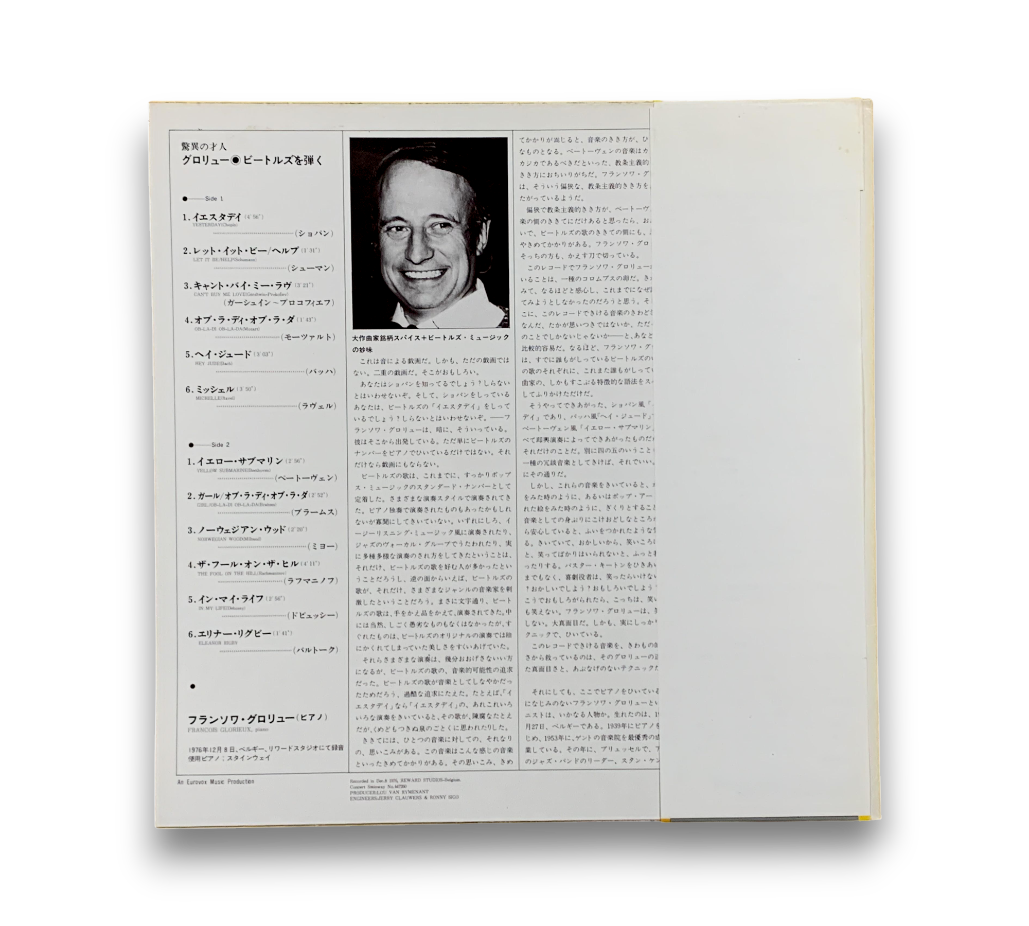 Francois Glorieux presents a unique interpretation of The Beatles, featuring all songs written by John Lennon and Paul McCartney. This album was produced by Lou Van Rymenant and recorded on December 8, 1976, showcasing Glorieux's piano skills on a Concert Steinway No. 447260. For further details regarding the packaging and inserts, please refer to the accompanying photos.