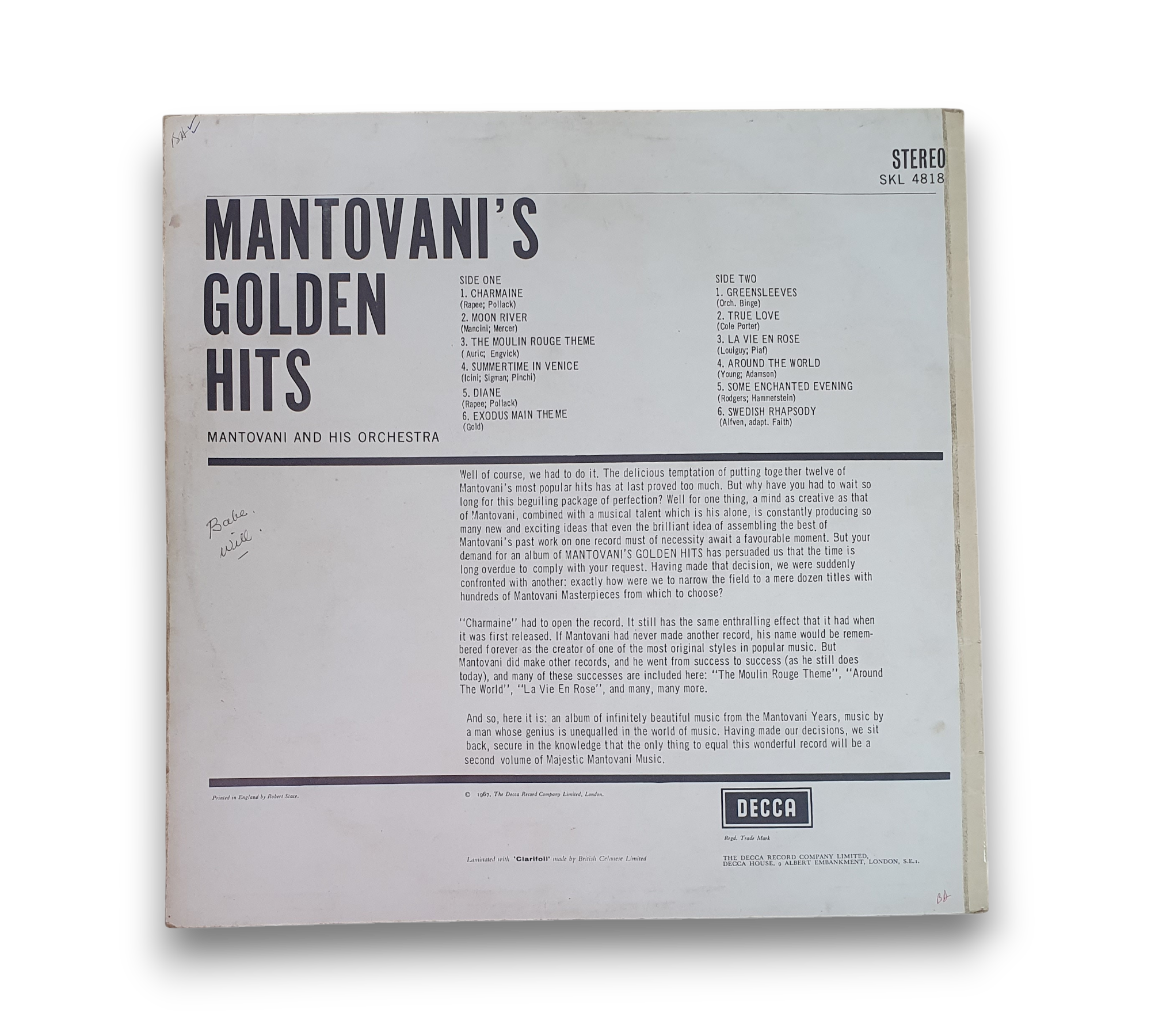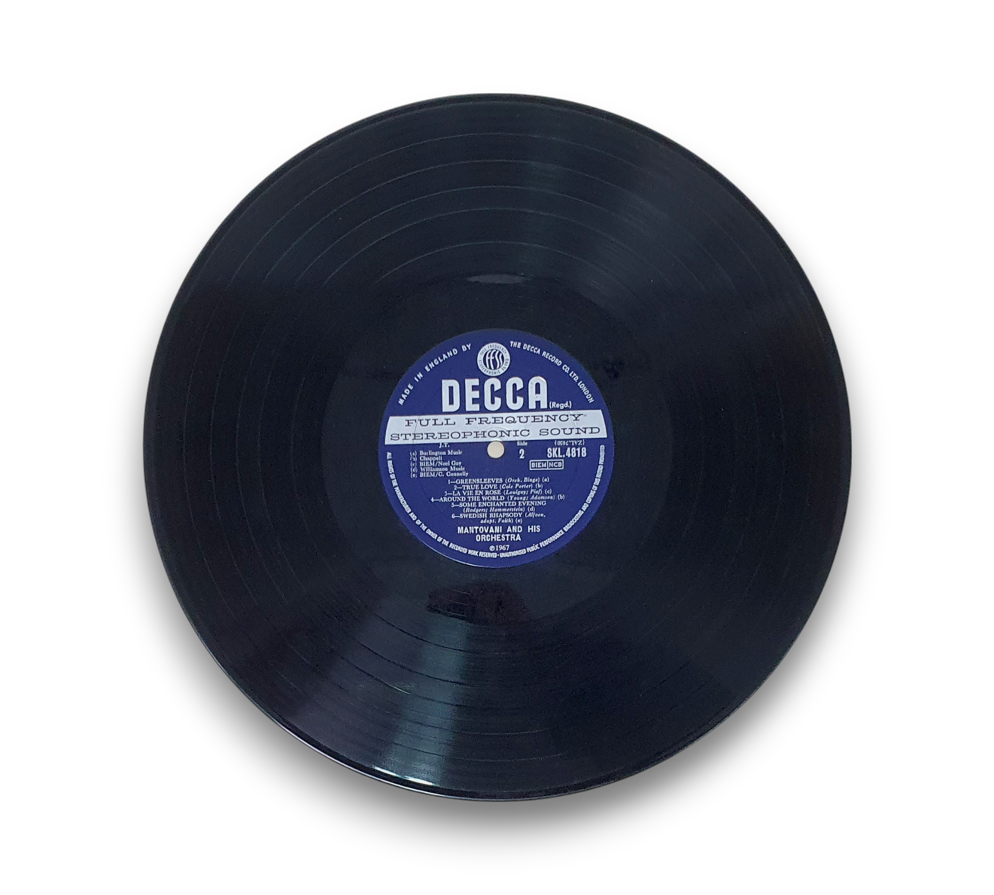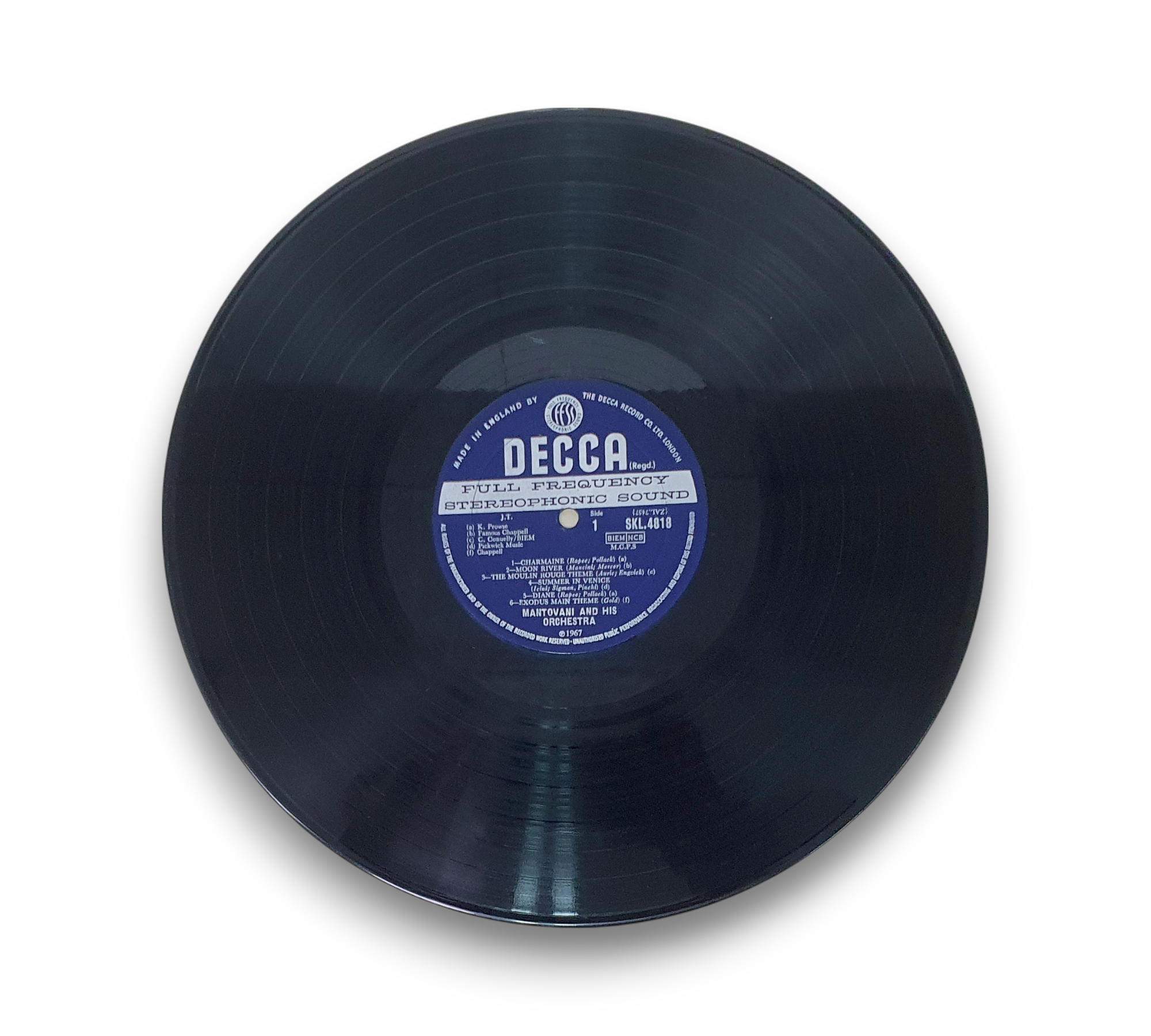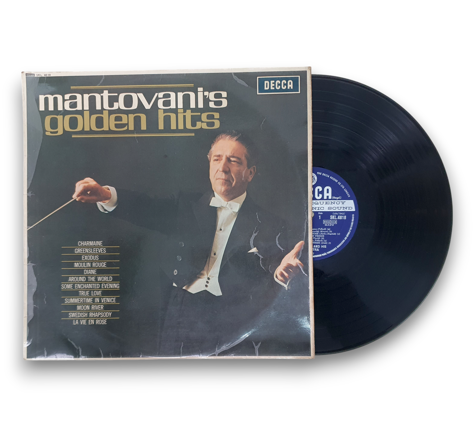 This listing features "Mantovani's Golden Hits," presented with the first catalog number on the cover and the second on the label. The record showcases blue and silver "unboxed" flat labels, characteristic of the release. For further details regarding the condition and any included packaging, please refer to the accompanying photos.