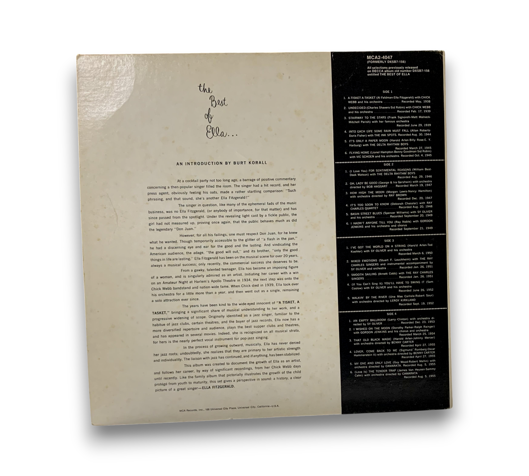 This record features a collection of selections from the renowned Ella Fitzgerald, previously released on the DECCA album numbered DXSB7-156, now presented under MCA Records. The set is a deluxe two-record compilation, showcasing some of her most celebrated performances. The packaging includes a detailed introduction by Burt Korall, providing insights into Fitzgerald's illustrious career. For further details regarding the condition and specific contents of the packaging, please refer to the accompanying photos.
