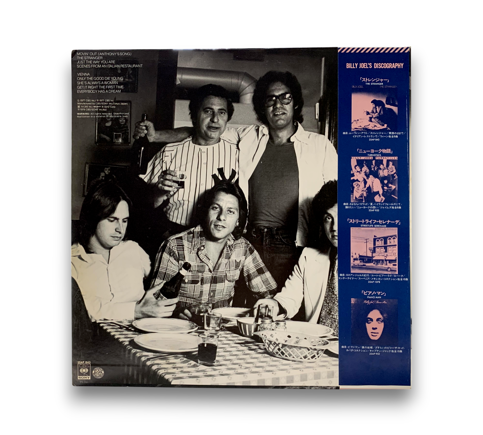 This listing features a believed 1977 pressing of Billy Joel's "The Stranger." The record includes notable contributions from various artists, with all songs copyrighted in 1977. The sleeve indicates copyright by CBS Inc. from both 1977 and 1978. The runouts are etched, adding to the authenticity of this pressing. For specific details regarding packaging and inserts, please refer to the accompanying photos, as they provide a visual representation of the item.