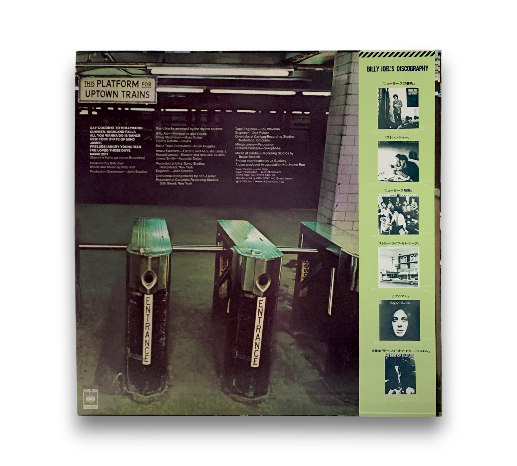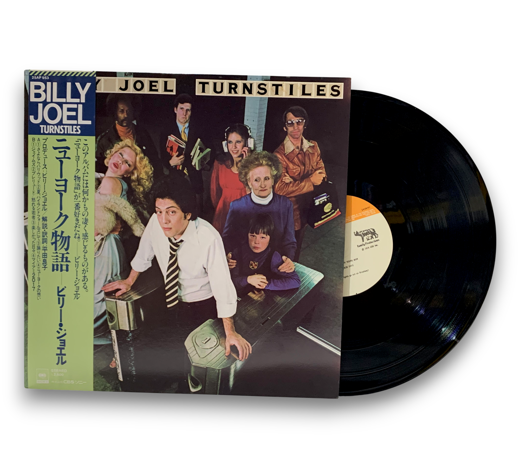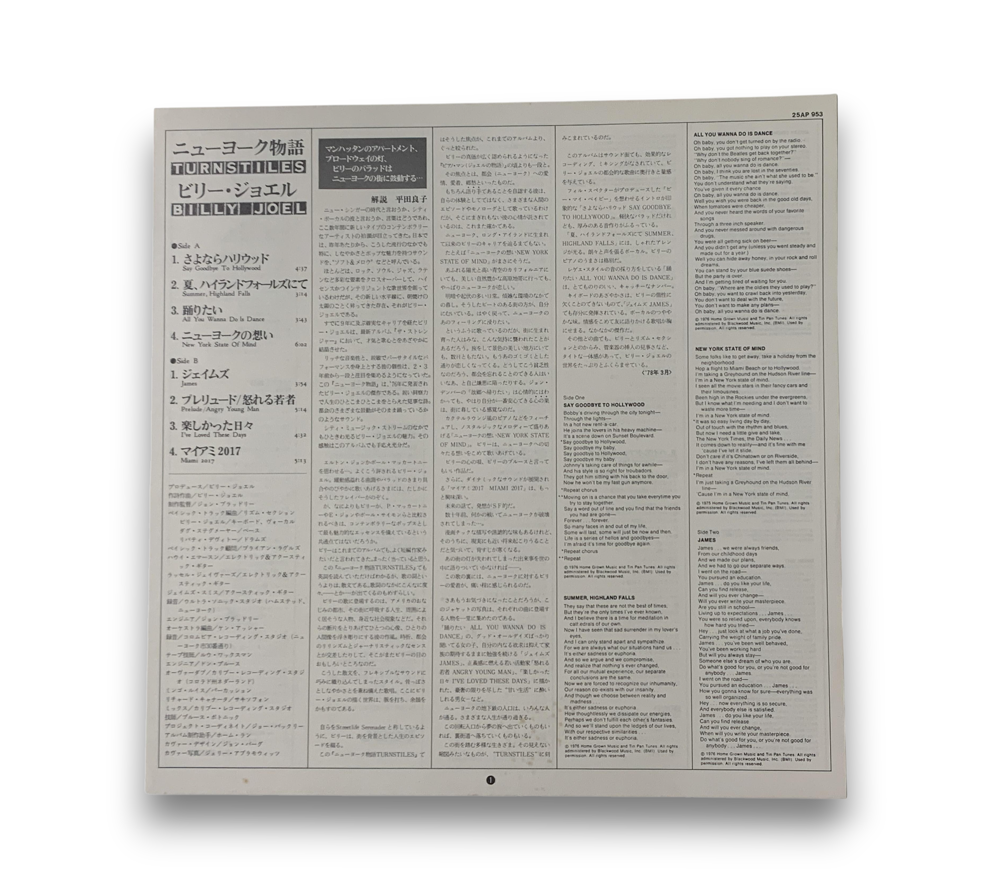 This listing features Billy Joel's album "Turnstiles," originally released in 1976. The record was produced in association with Home Run and showcases a variety of recording locations, including Ultra-Sonic Studios in Hempstead, New York, and Caribou Recording Studios in Nederland, Colorado. The album includes a printed inner sleeve, and the labels indicate that the songs are credited to Billy Joel as "B. Joel." Notably, side B track 4 is titled "Miami 2017 (Seen The Lights Go Out On Broadway)." For further details regarding the packaging and inserts, please refer to the accompanying photos.
