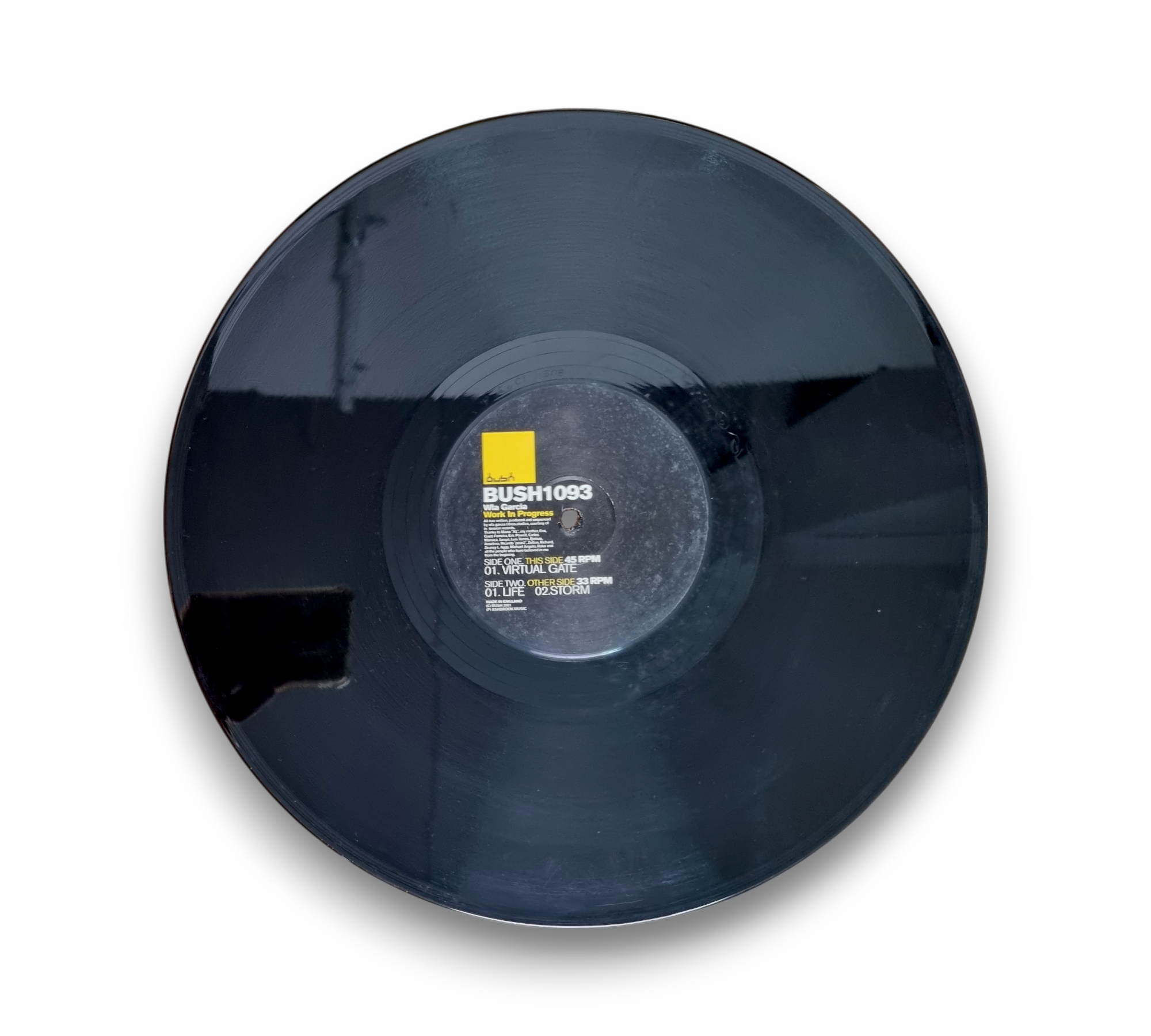 This record, released by Bush in 2001, features tracks produced and sequenced at Bros. Studios. It is distributed by KRD and is made in England. The record has a unique play format, with Side A playing at 45 RPM and Side B at 33⅓ RPM. For further details regarding the packaging and inserts, please refer to the accompanying photos.