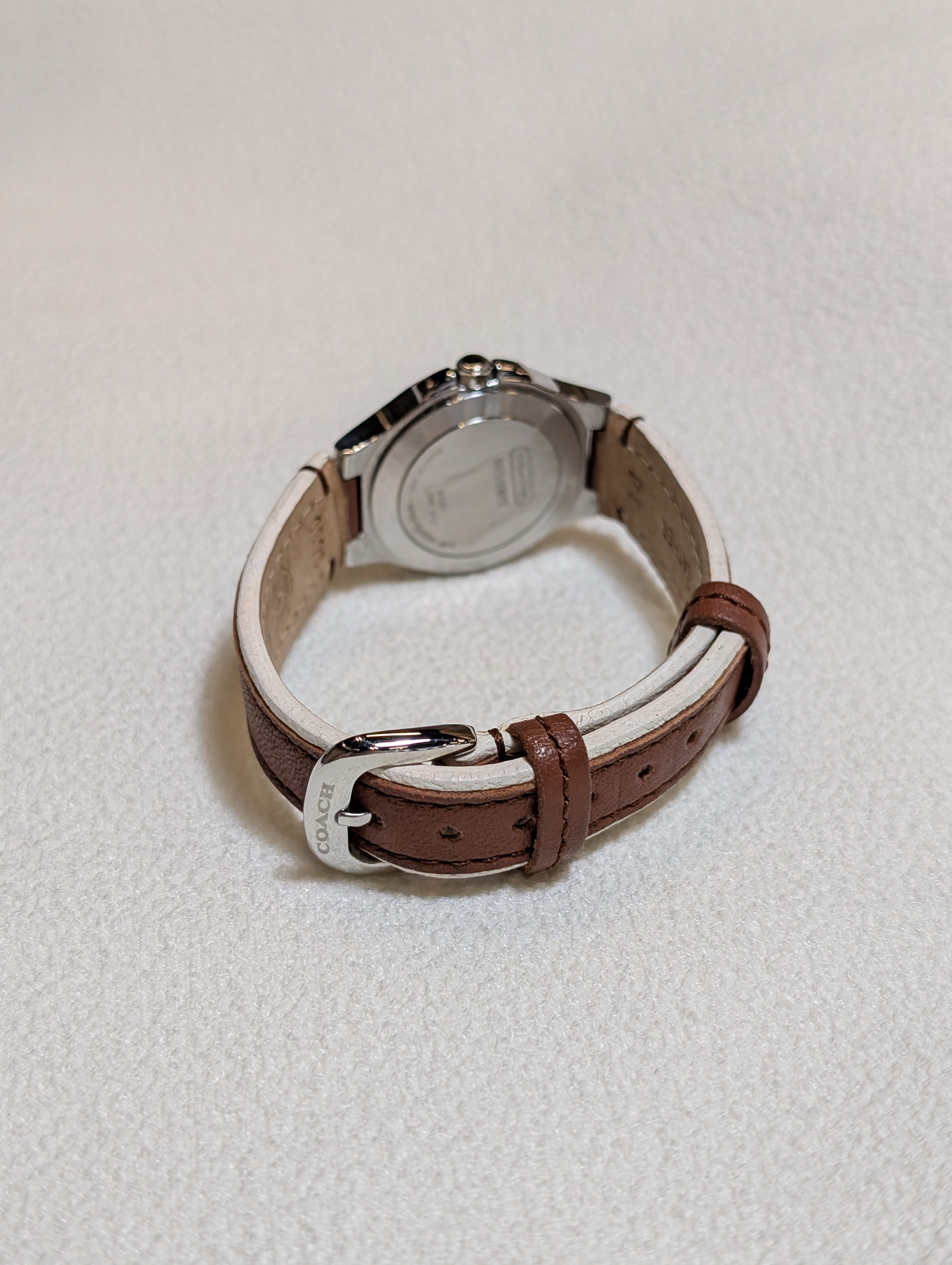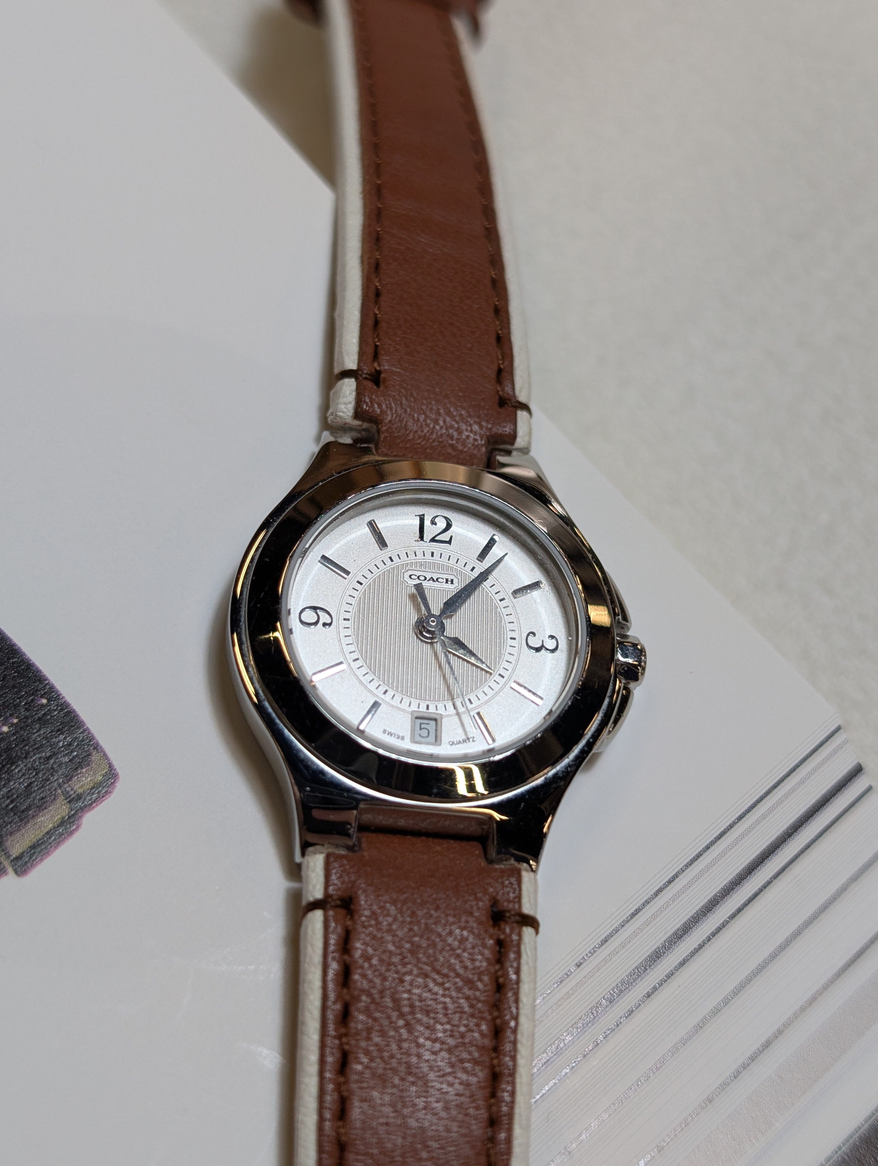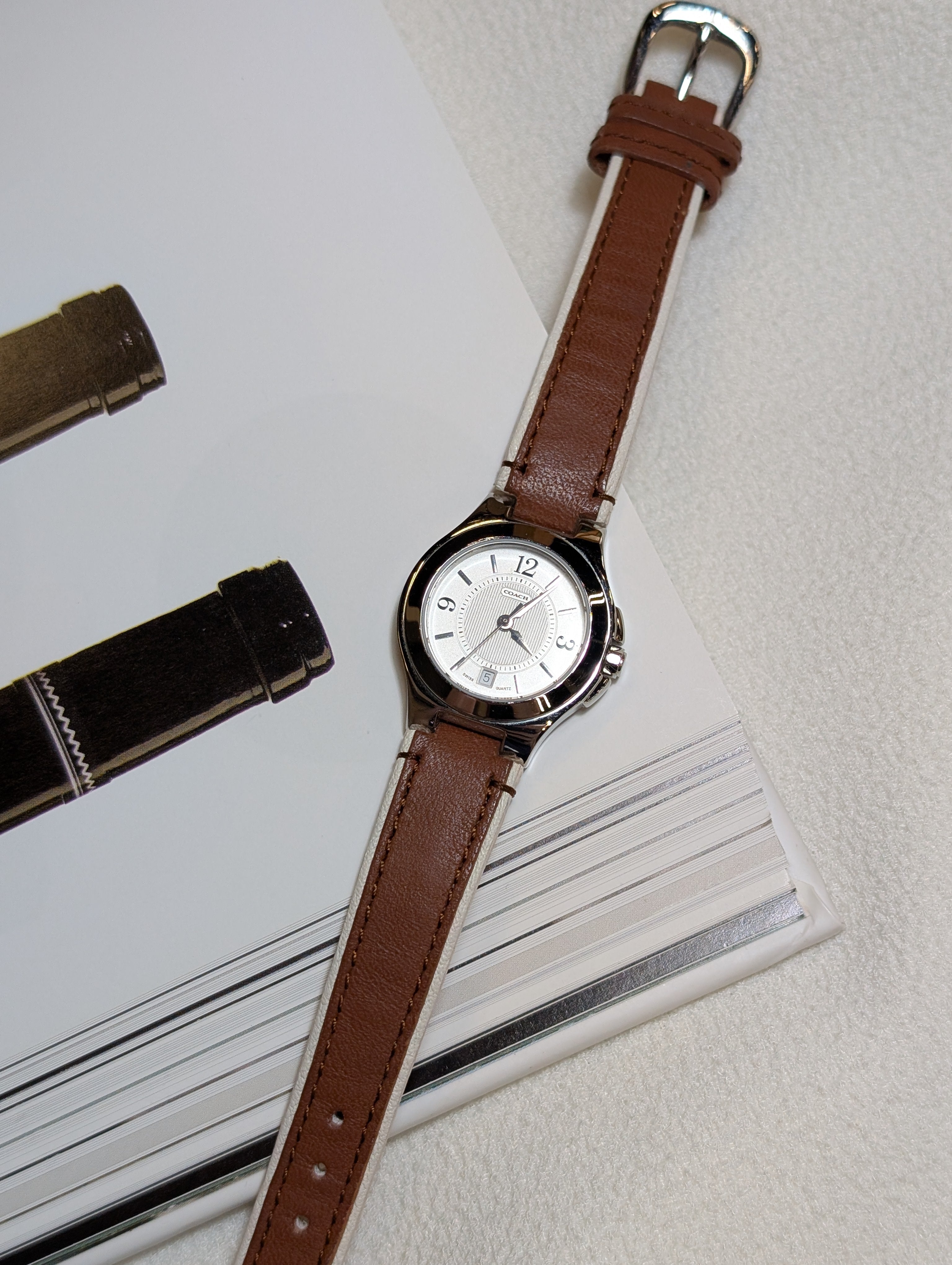 Elevate your style with this Vintage Coach Quartz Silver-Tone Round Brown Leather Strap Watch, a perfect blend of sophistication and versatility. Featuring a sleek silver dial housed in a robust stainless steel case, this analog watch effortlessly complements both casual and formal attire. The rich brown leather strap adds a touch of timeless elegance, while the convenient date display ensures you stay on track. Experience the perfect union of fashion and functionality with this exquisite timepiece from Coach.