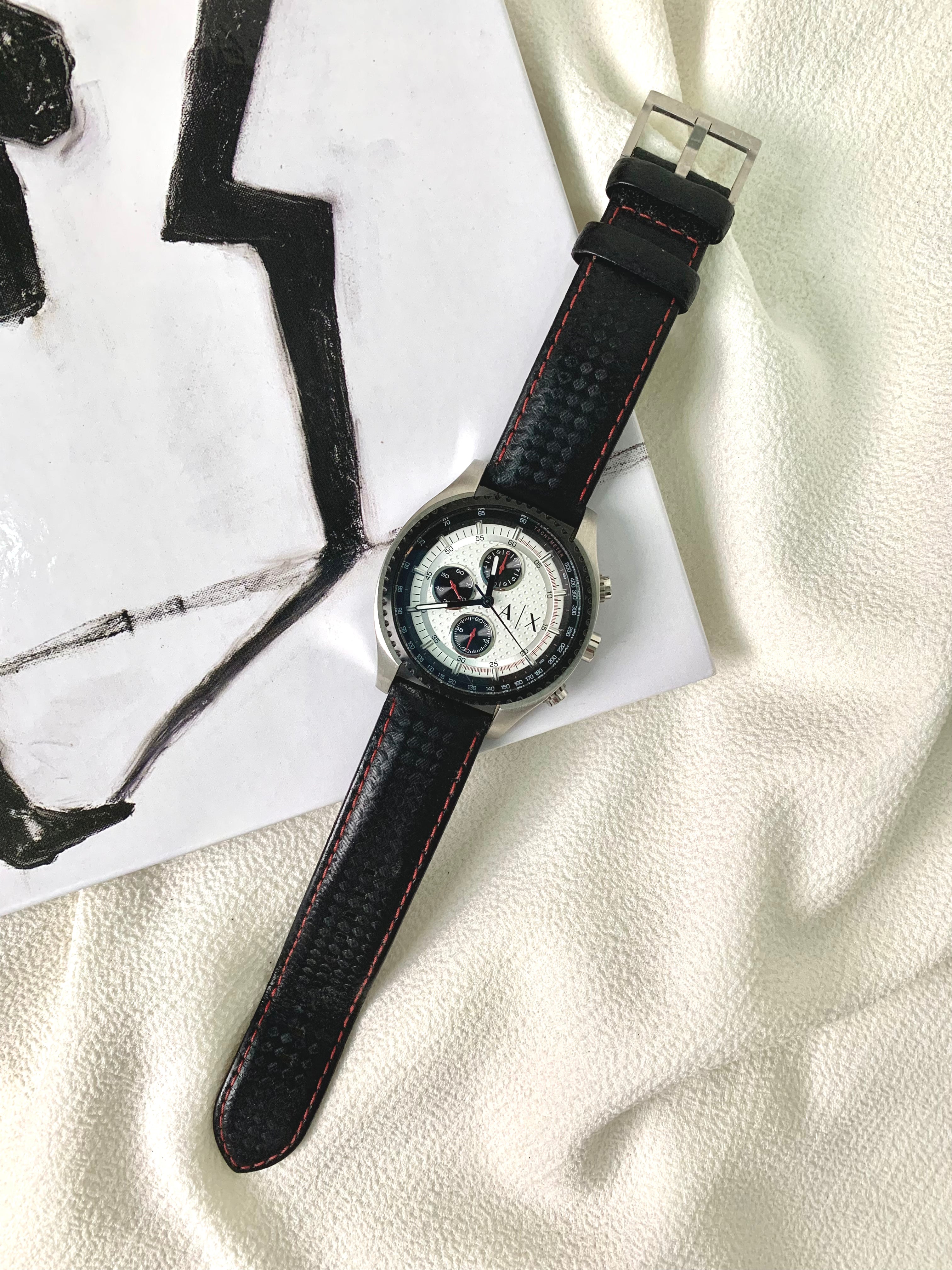 Armani Exchange Quartz Chronograph Silver Round Black Leather Strap Watch