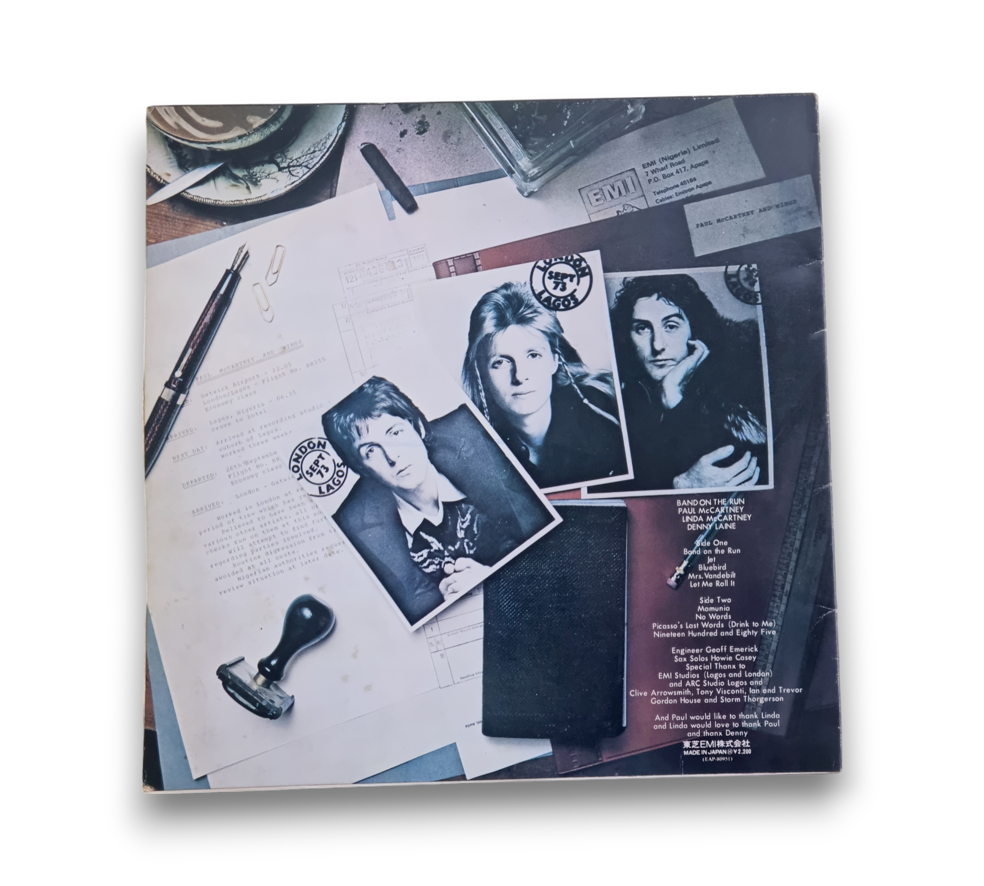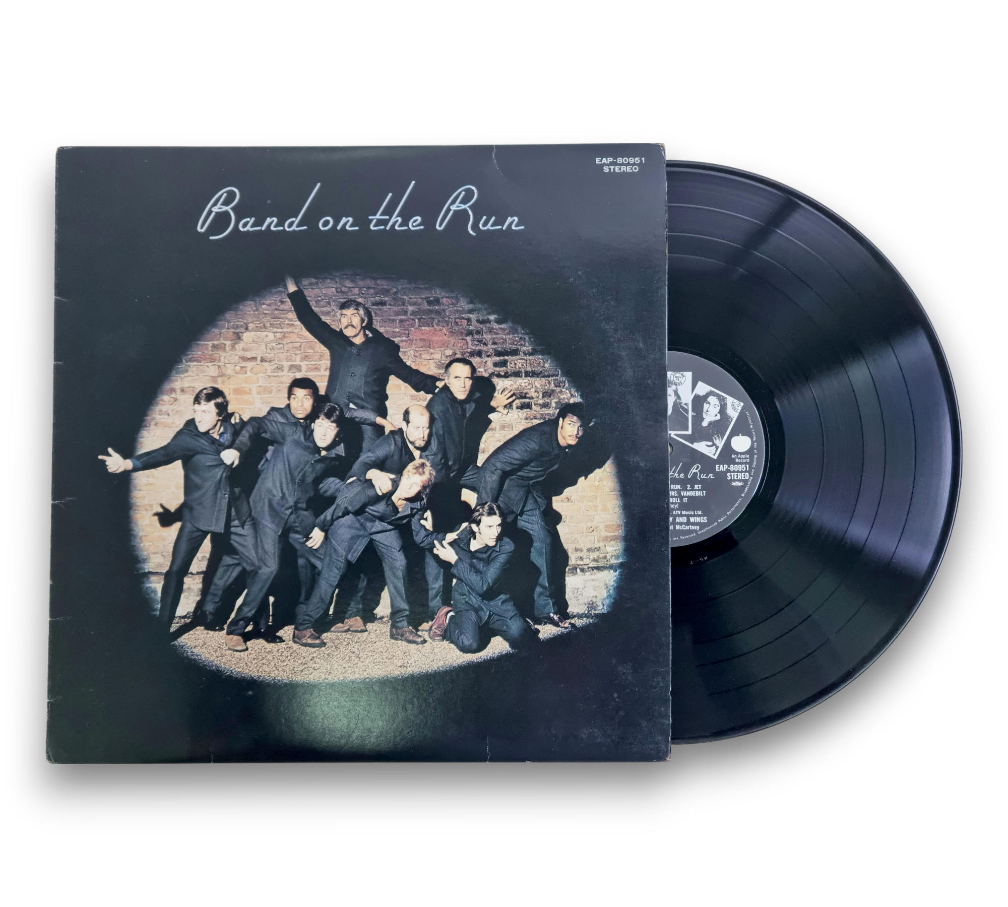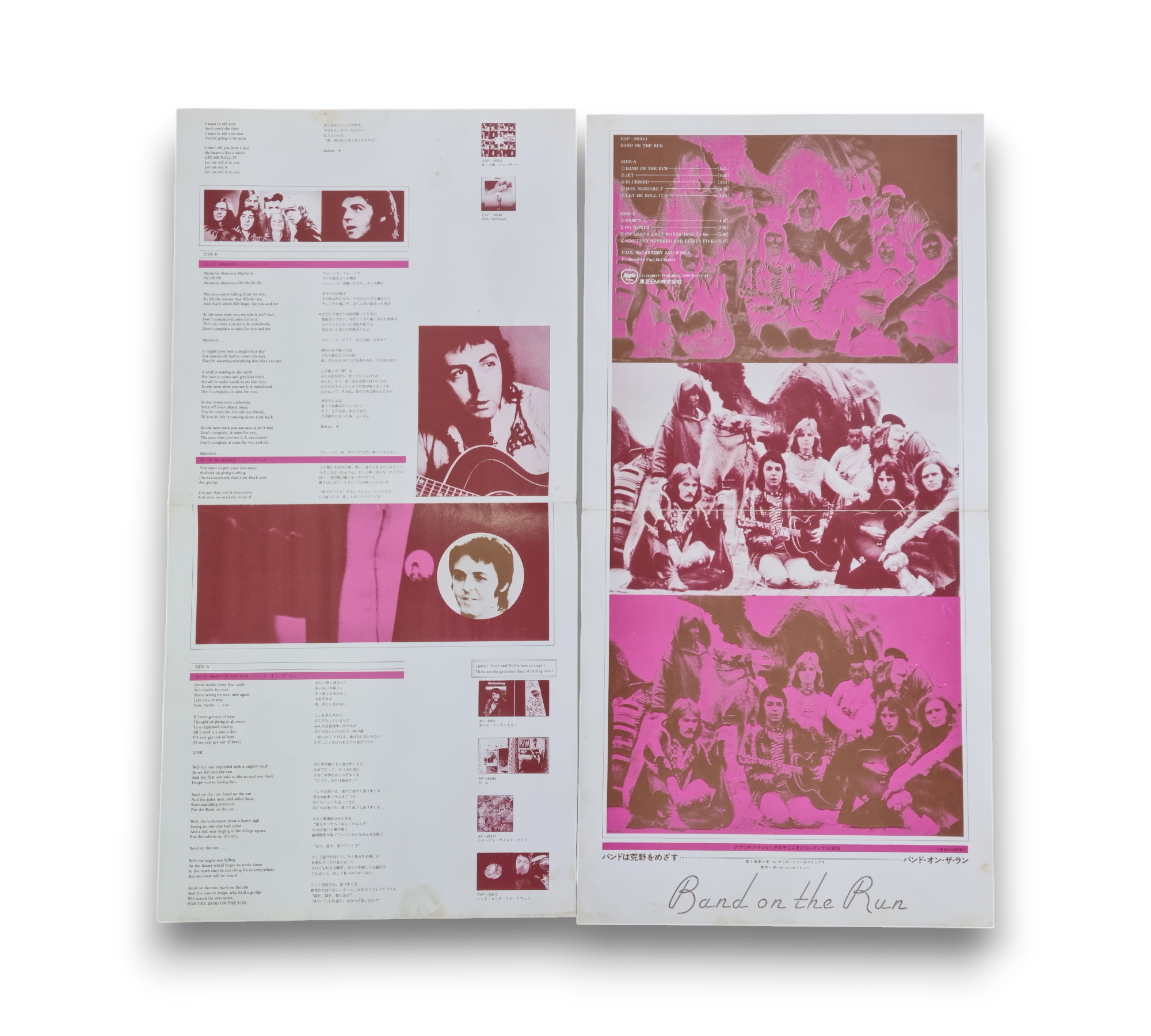 This is a Japanese issue of "Band on the Run," featuring a printed inner sleeve and an 8-page Japanese insert with a pink tint. The insert includes lyrics and images related to the album. For further details regarding the packaging and inserts, please refer to the accompanying photos.