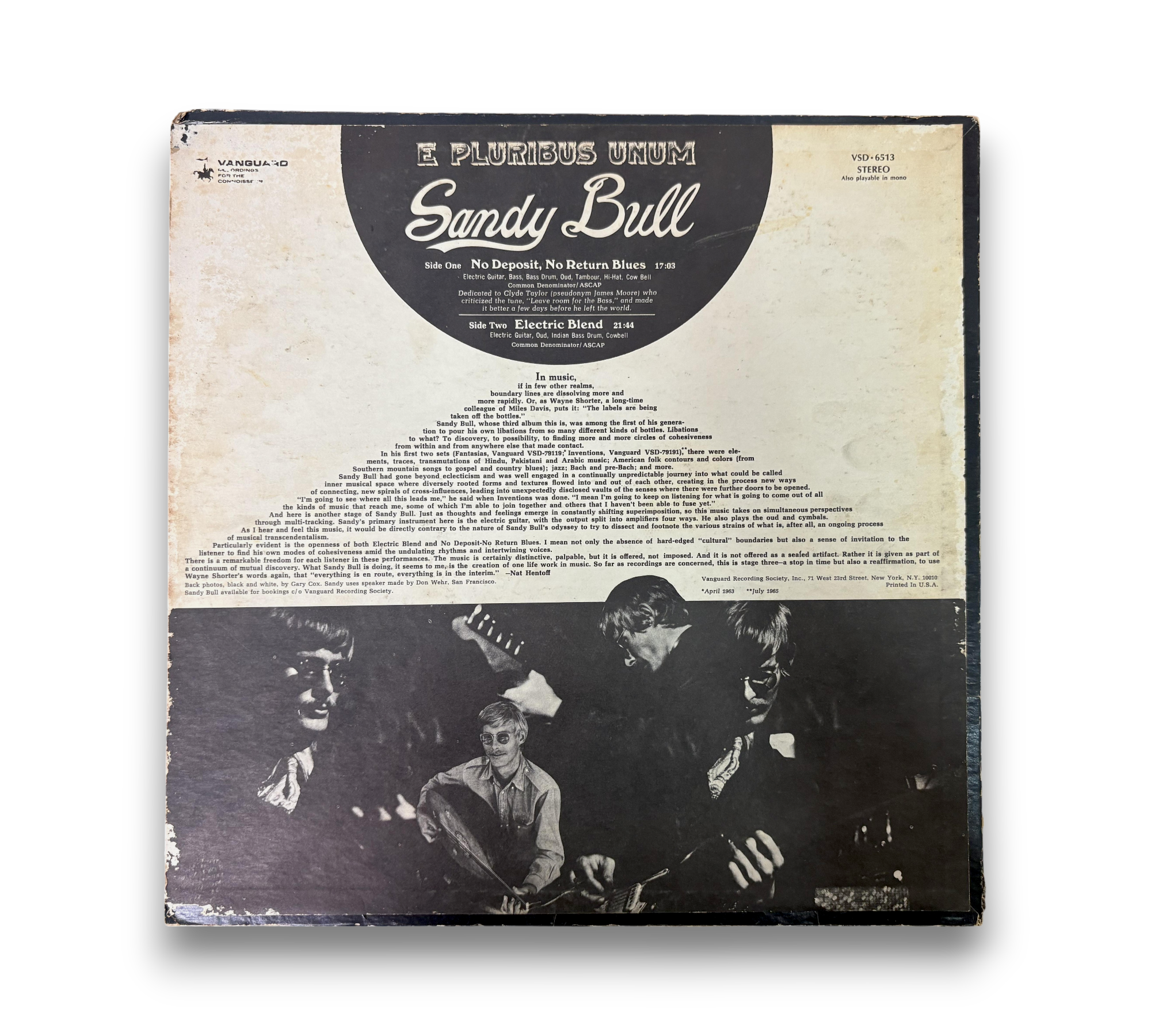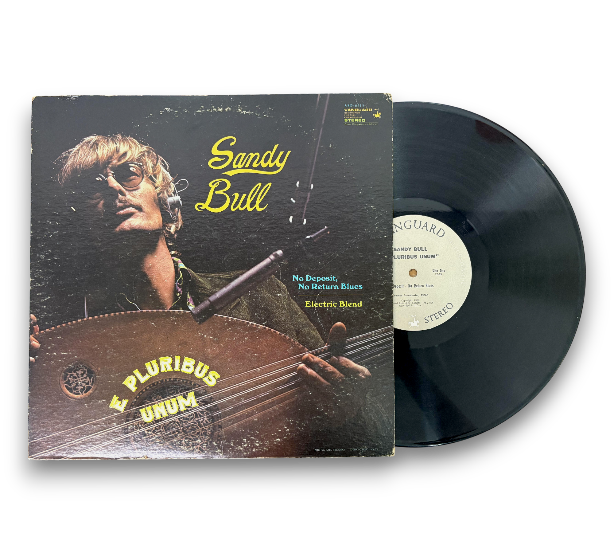 Discover the innovative sounds of Sandy Bull with his 1969 album "E Pluribus Unum," released under the Vanguard label. This vinyl features two captivating tracks: the expansive "No Deposit-No Return Blues" and the mesmerizing "Electric Blend," showcasing Bull's unique blend of jazz, rock, and blues. The striking cover art adds to the album's appeal, making it a must-have for collectors and fans of acoustic and folk rock. For details on the condition and packaging, please refer to the accompanying photos.