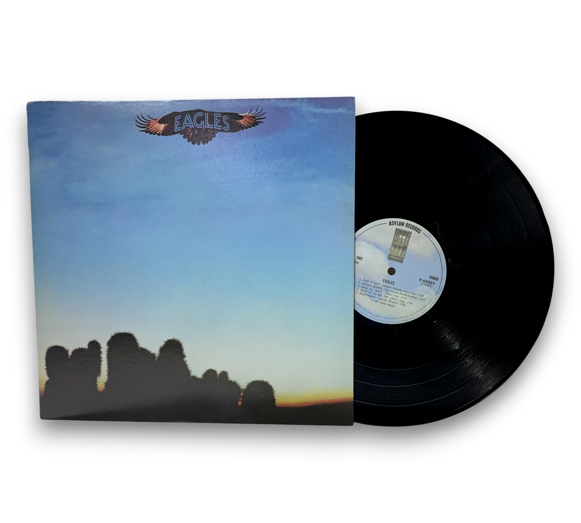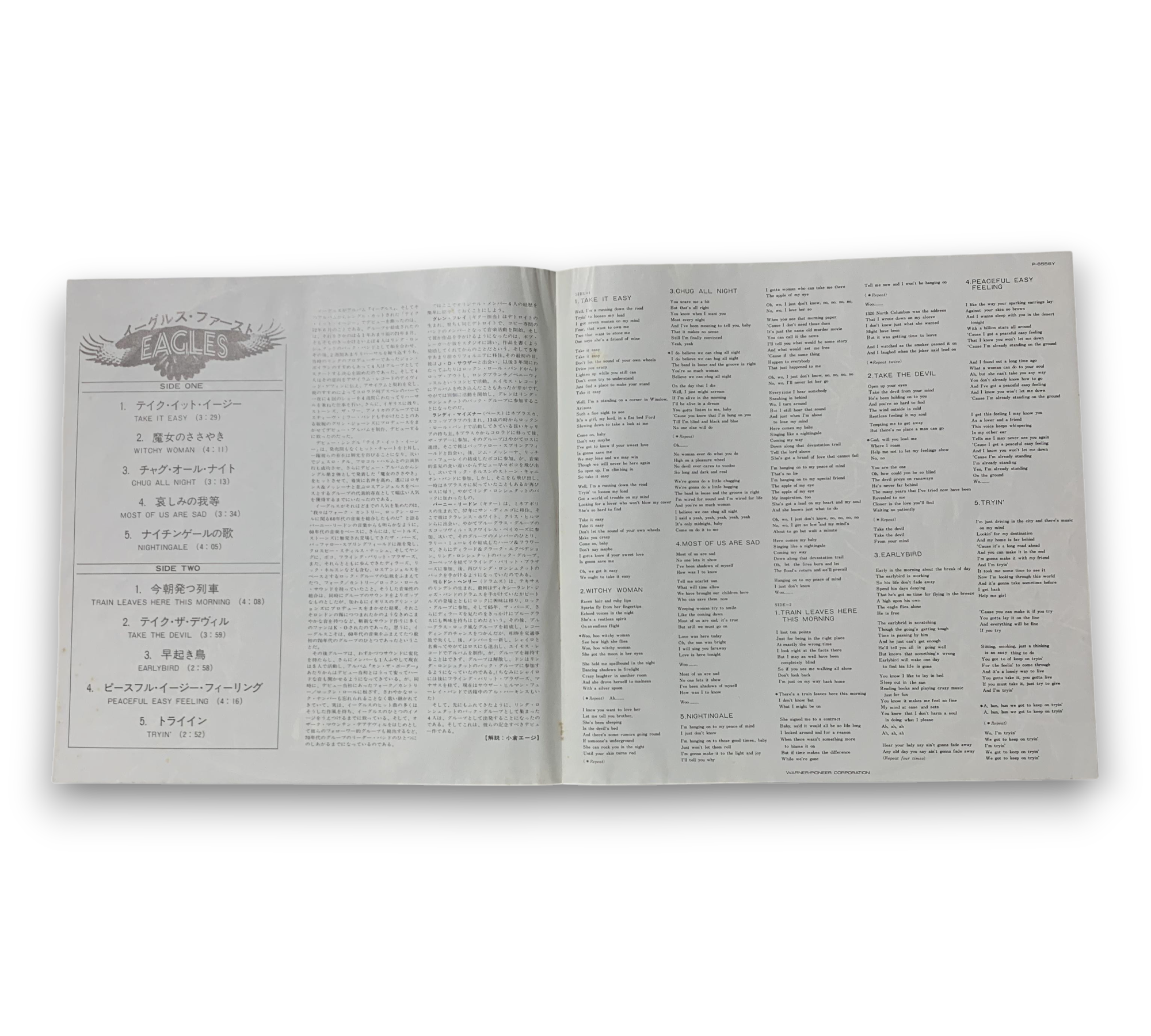 This 1972 release from Asylum Records features the Eagles and was produced and engineered at Olympic Sound Studios in London. The record is made by Warner-Pioneer Corporation in Japan and includes a printed insert with a Japanese write-up alongside English lyrics. For further details regarding the condition and specifics of the packaging, please refer to the accompanying photos.