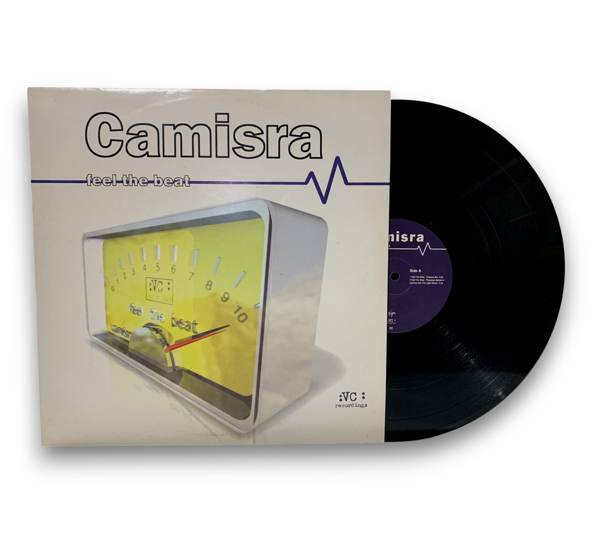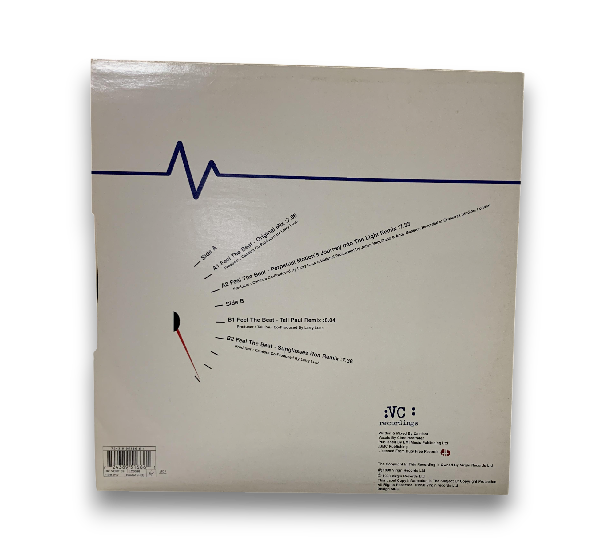 The copyright for this recording is owned by Virgin Records Ltd, with the release date marked as 1998. The record features the title "Feel the Beat" by Camisra, showcasing a variety of mixes including the Original Mix and remixes by Tall Paul and Sunglasses Ron. The packaging is printed in the EU. For further details regarding the condition and specific features of the packaging, please refer to the accompanying photos.