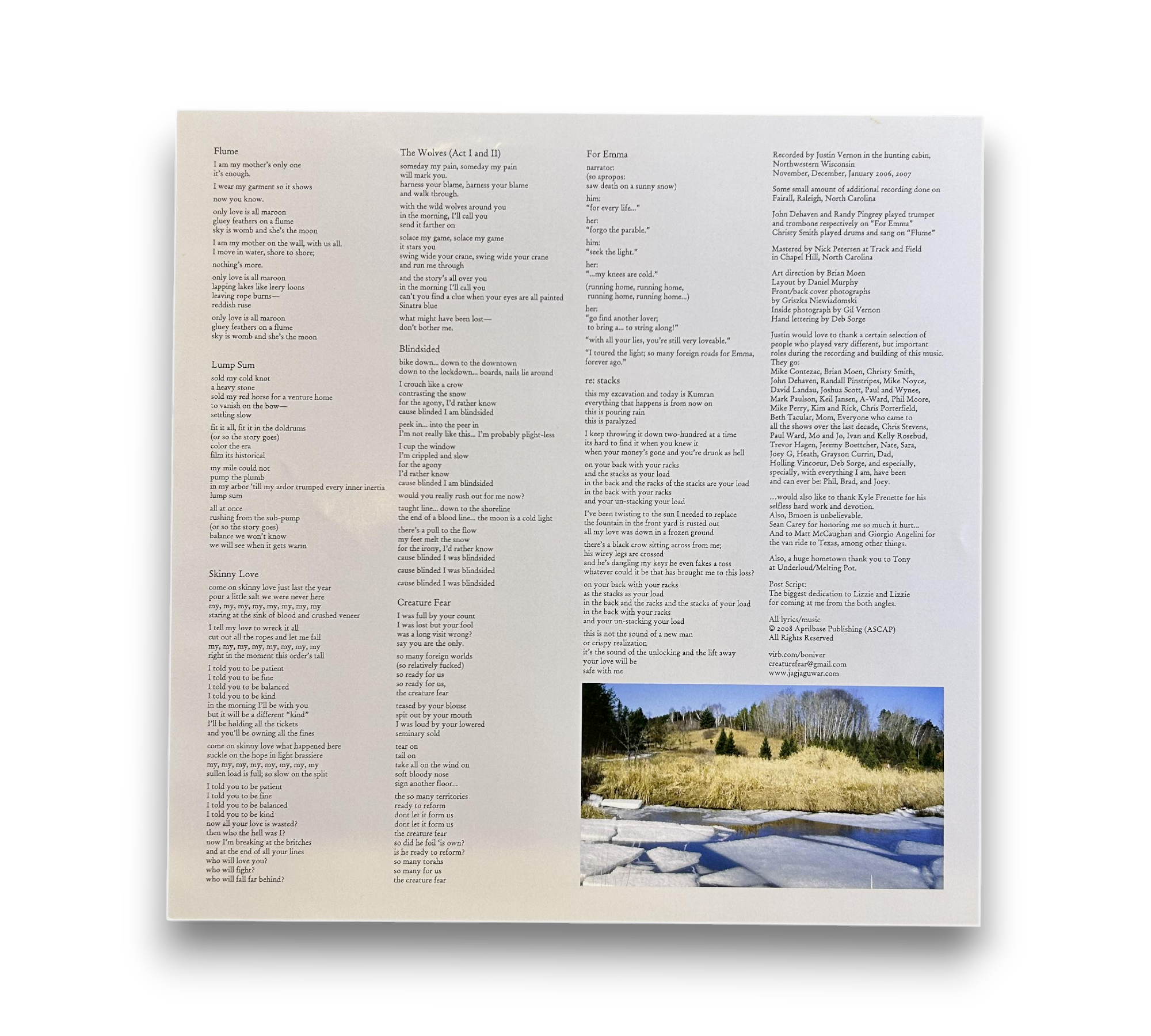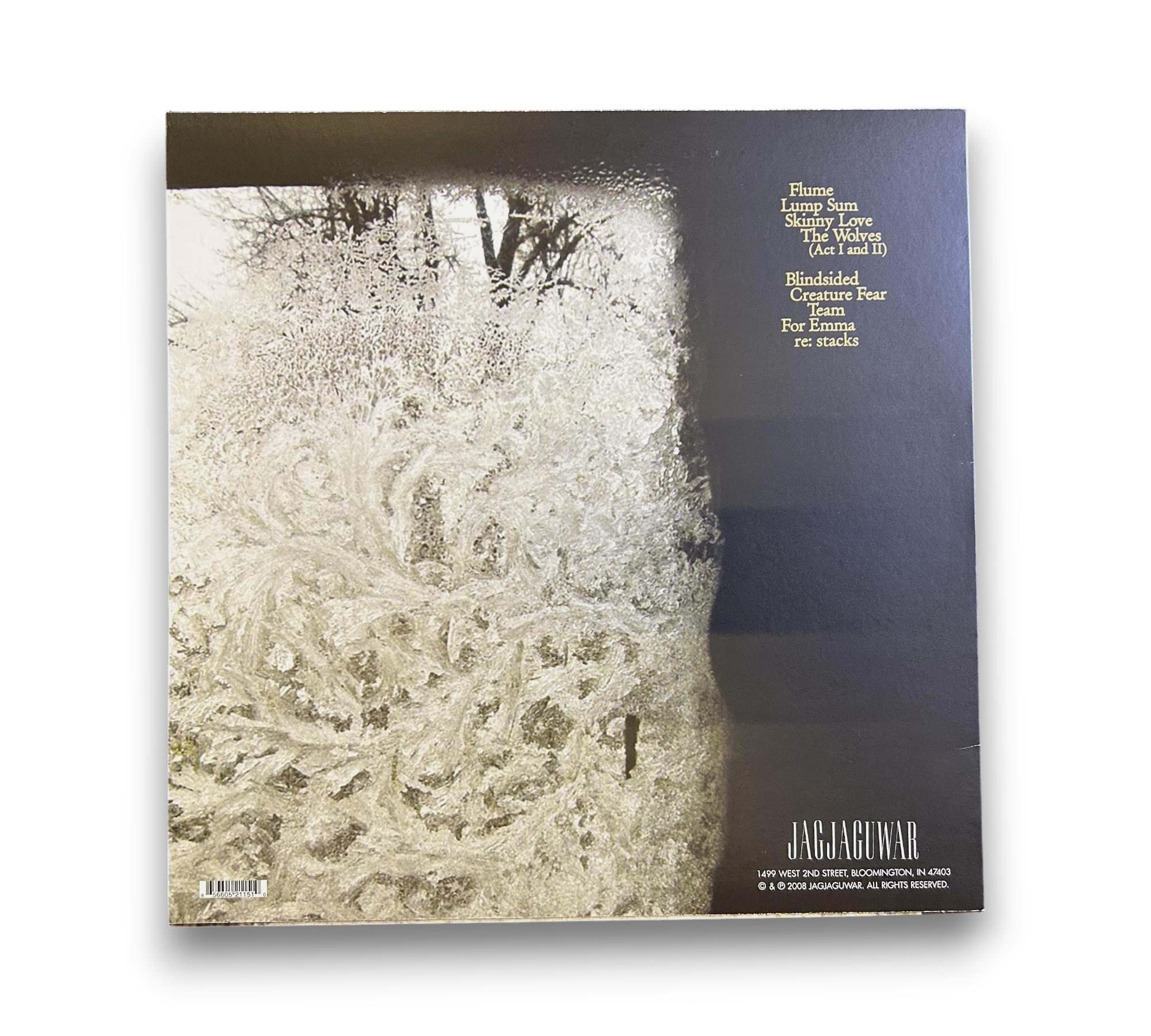 Recorded in a hunting cabin in Northwestern Wisconsin during late 2006 and early 2007, this album features additional recording done in Raleigh, North Carolina. The record is mastered at Track and Field in Chapel Hill, North Carolina. It includes a lyrics insert, and track B5 is listed as "re: stacks." Please refer to the accompanying photos for details regarding packaging and inserts. This release is © & ℗ 2008 Jagjaguwar, with all lyrics and music © 2008 Aprilbase Publishing (ASCAP).