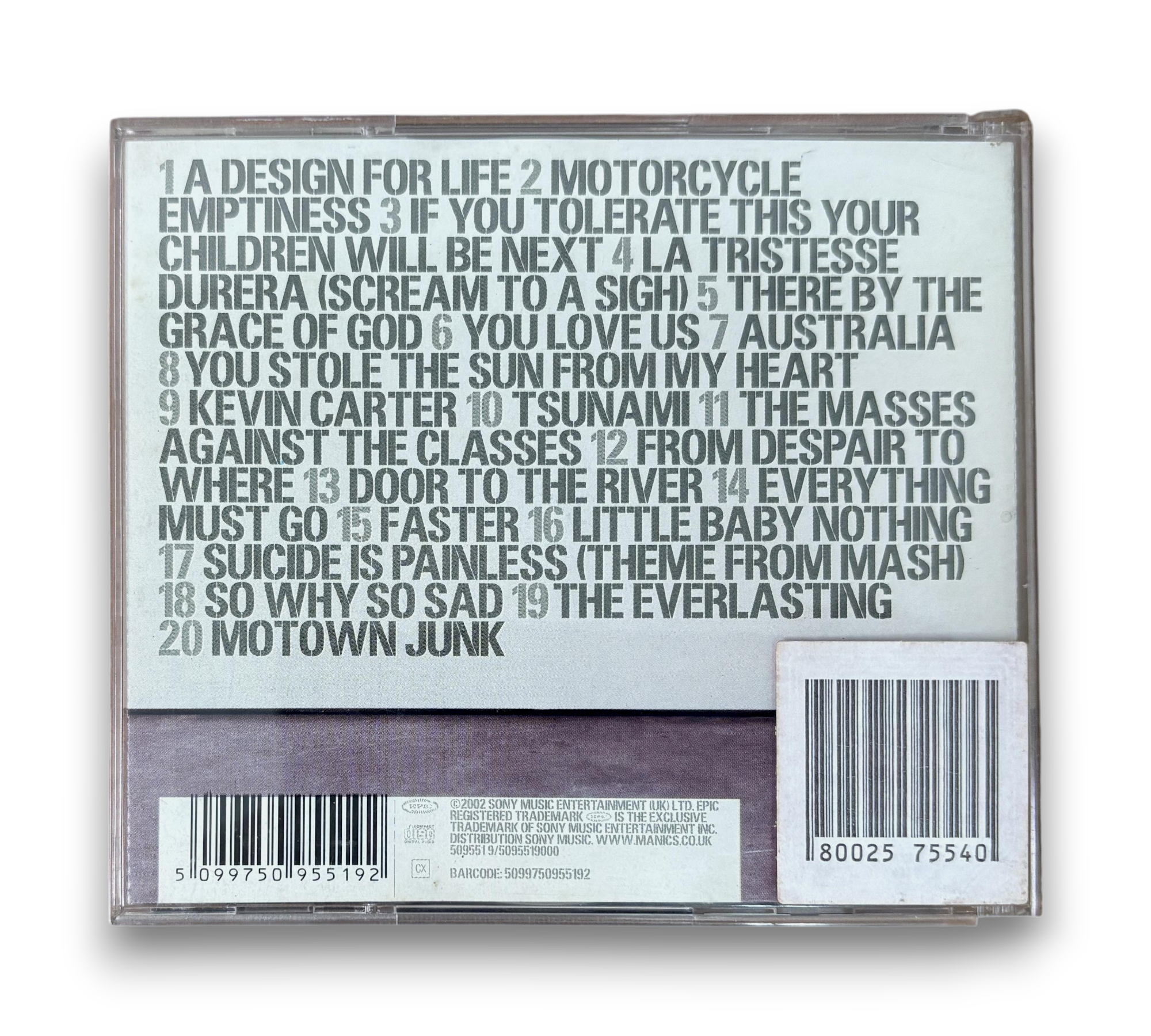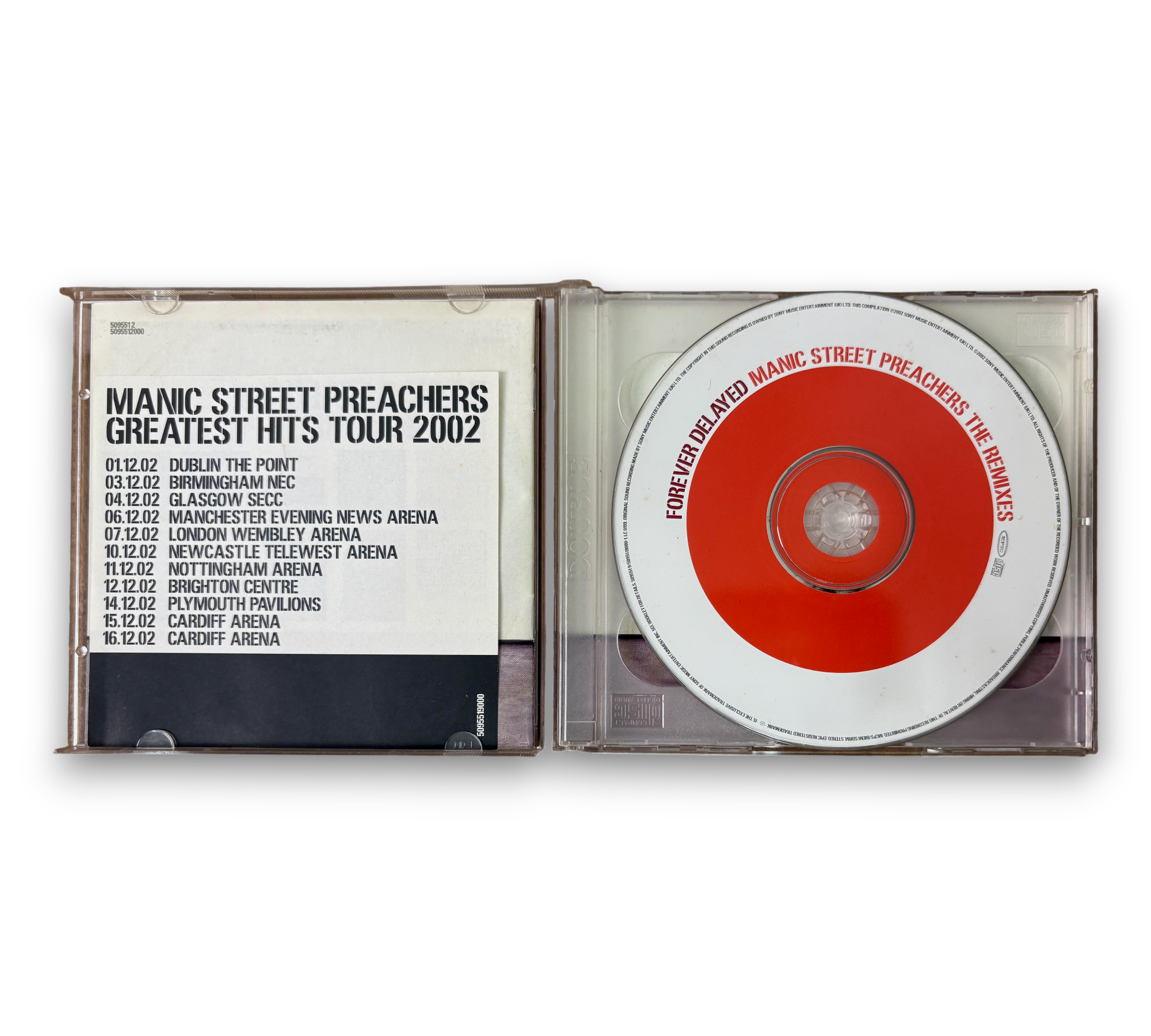This listing features "Forever Delayed," the greatest hits compilation by Manic Street Preachers. The collection includes tracks published by Sony/ATV Music Publishing Ltd. and Warner Chappell Music Ltd., showcasing a range of edits and mixes from their discography. The set is presented in a standard plastic double CD jewel case, accompanied by a 16-page booklet and an additional 4-page v-fold booklet. The CDs are housed in a gloss O-card, which does not feature spine text. For further details regarding the packaging and inserts, please refer to the accompanying photos.