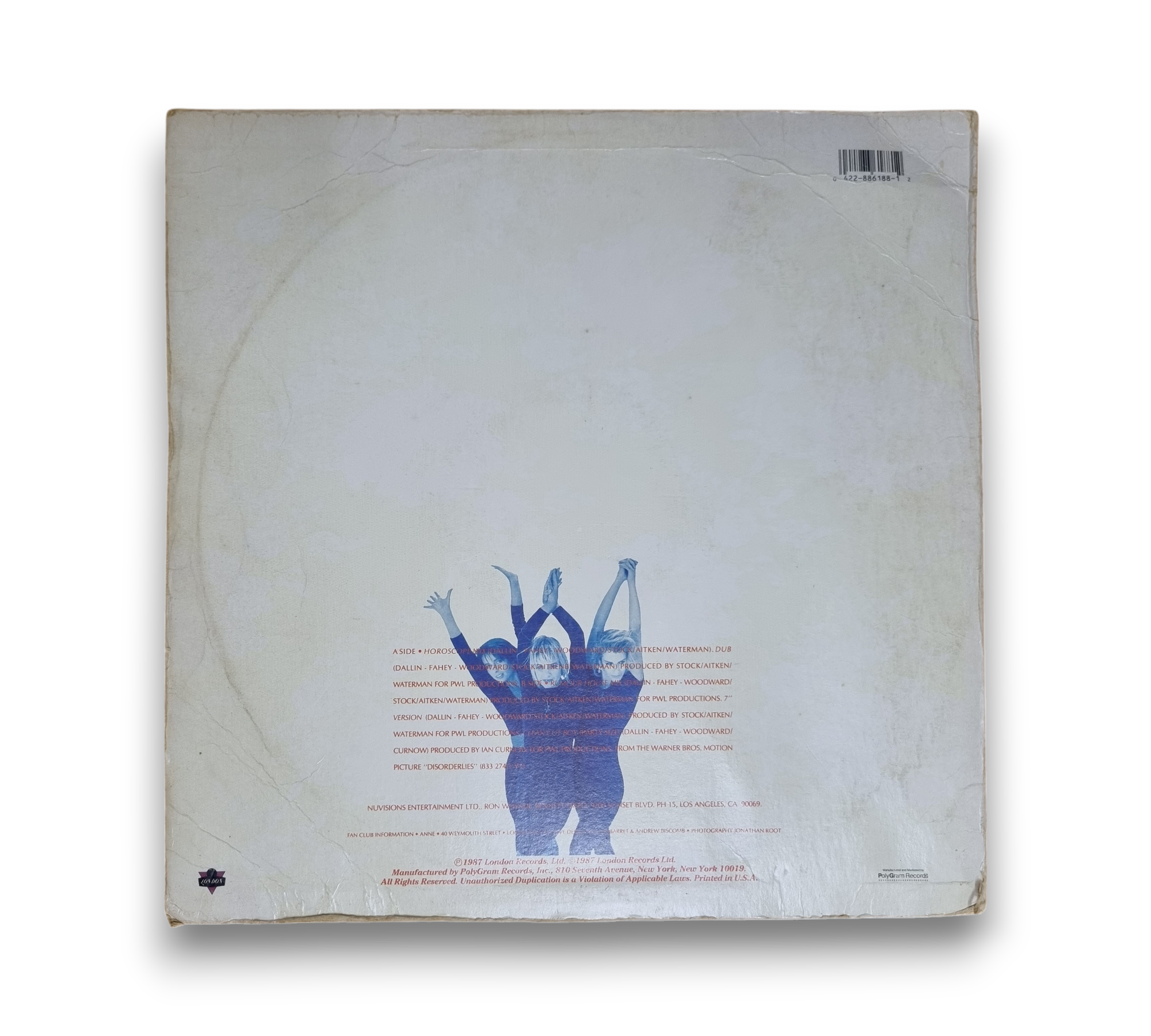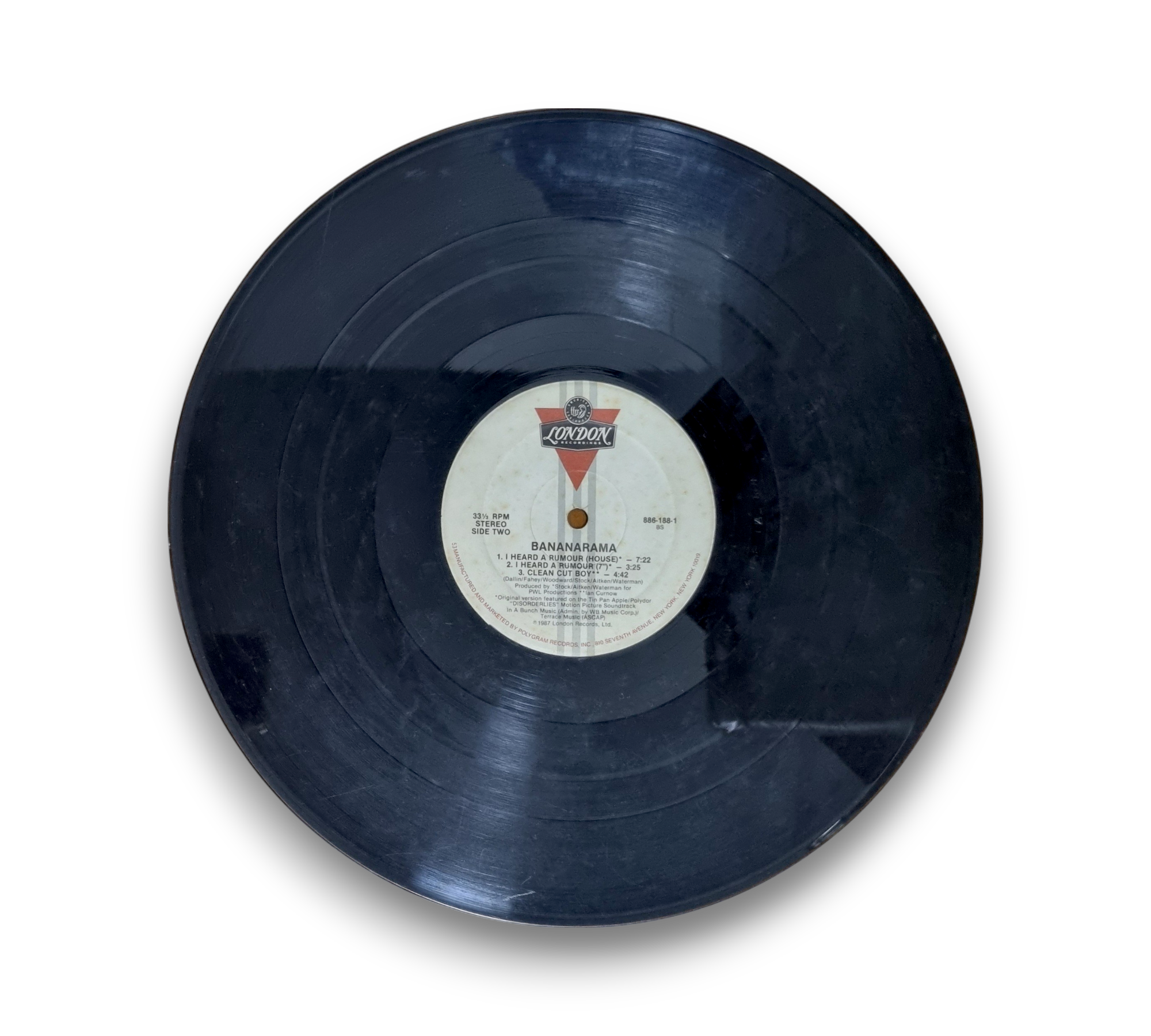 This 12" single features Bananarama's hit "I Heard A Rumour," produced for PWL Productions and released in 1987 by London Records. The record includes various mixes, such as the Horoscope Mix and the 7" Version, as noted on the sleeve and label. The original version of the track is featured on the "Disorderlies" Motion Picture Soundtrack. Please refer to the accompanying photos for details regarding the condition and any included packaging, as this information may vary.