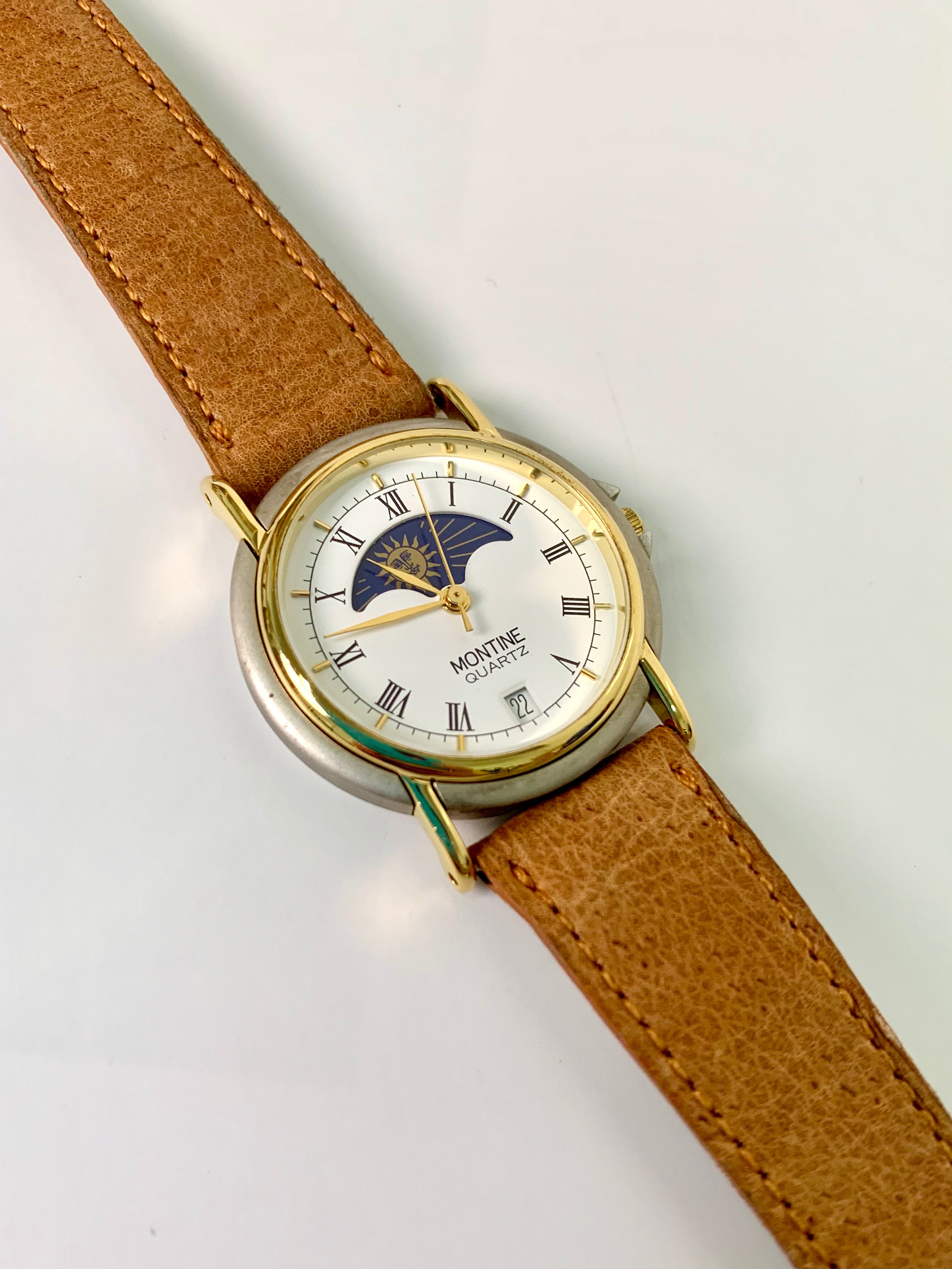 Elevate your elegance with the Montine Quartz Two-Tone Round Brown Leather Strap Watch. Perfect for formal occasions, this unisex watch features a classic analog display with Roman numerals, enhanced by a sophisticated moon phase indicator and date display. The gold-tone case beautifully complements the rich brown leather strap, making it a timeless accessory that effortlessly transcends trends.